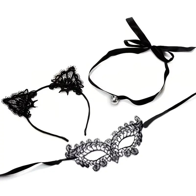 3-Piece Cat Costume Set, Halloween Makeup Party Mask, Adult Lace Ears Necklace and Collar, Women's Cat