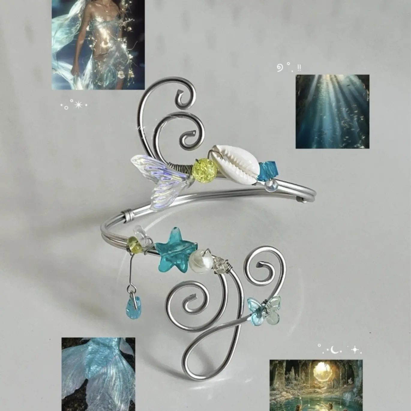 Each detail is carefully handcrafted, creating a light, ethereal composition that catches the light with subtle brilliance. The soft white palette evokes purity and calm, making it a timeless accessory that complements both modern minimalism and romantic, fairy-like aesthetics.