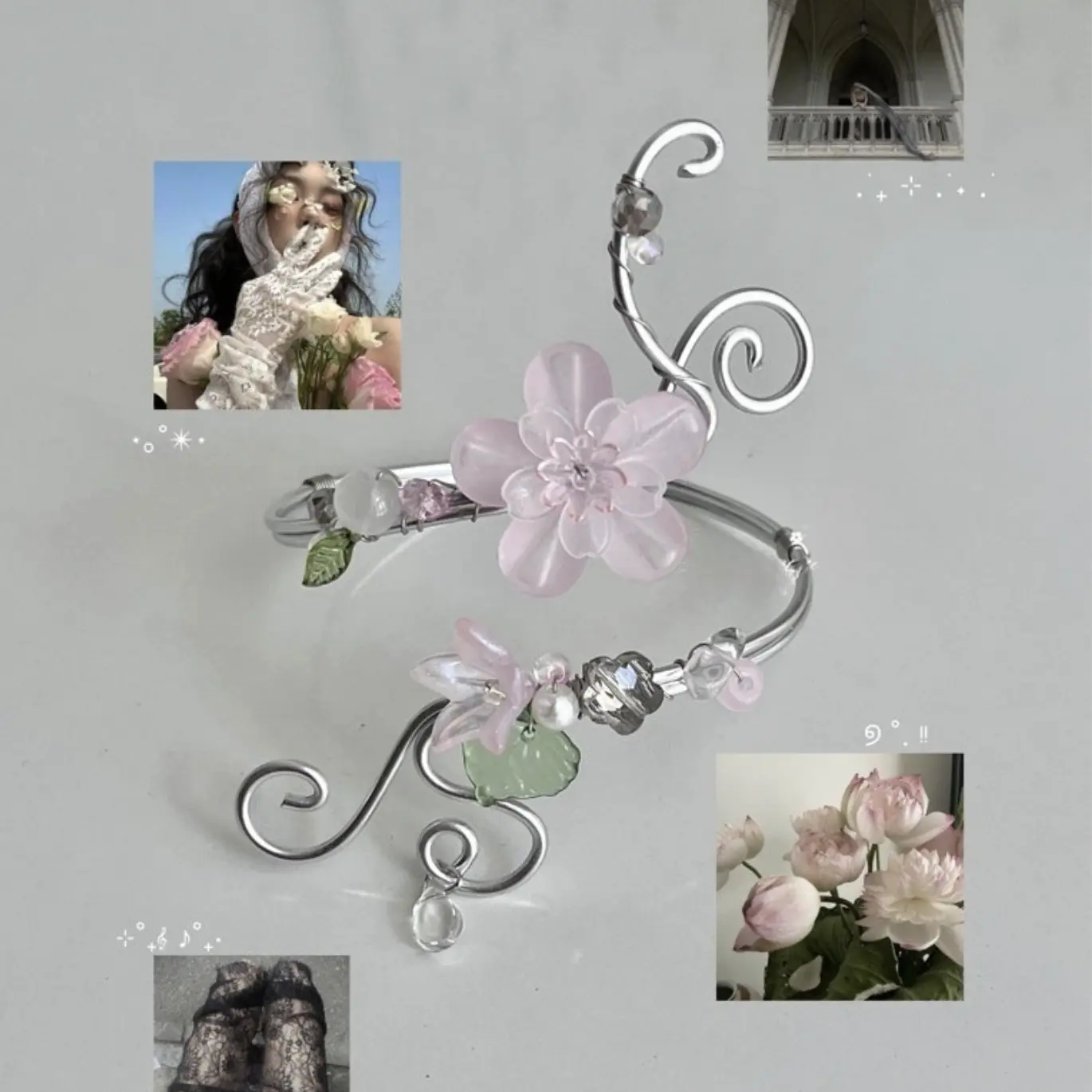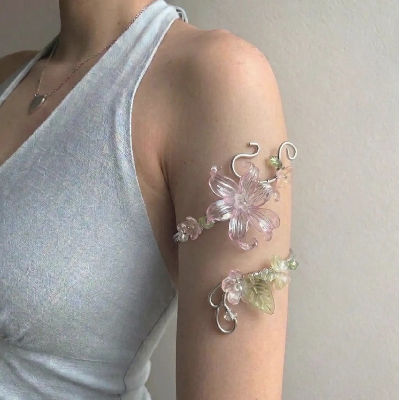 A delicate expression of quiet beauty, this handmade arm cuff is inspired by soft petals blooming in stillness. Designed with translucent white flowers, crystal-like beads, and graceful flowing curves, the piece wraps gently around your arm like a whisper of elegance.