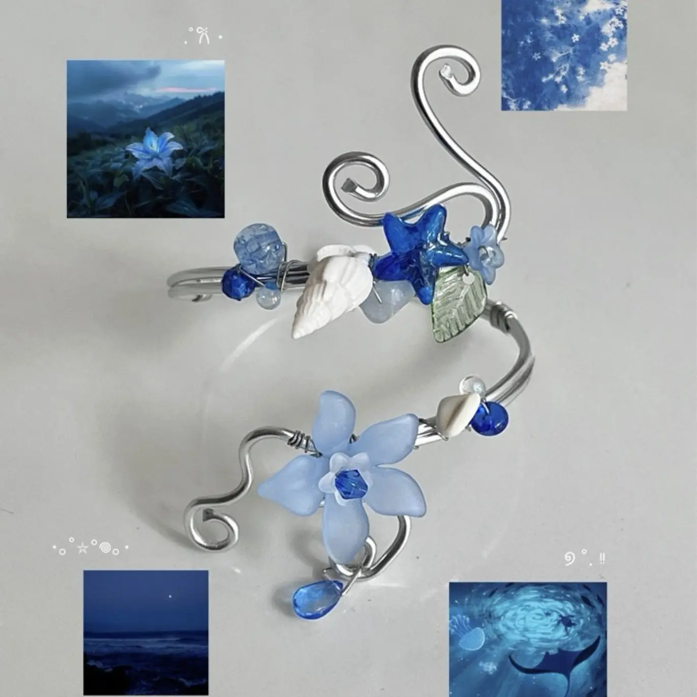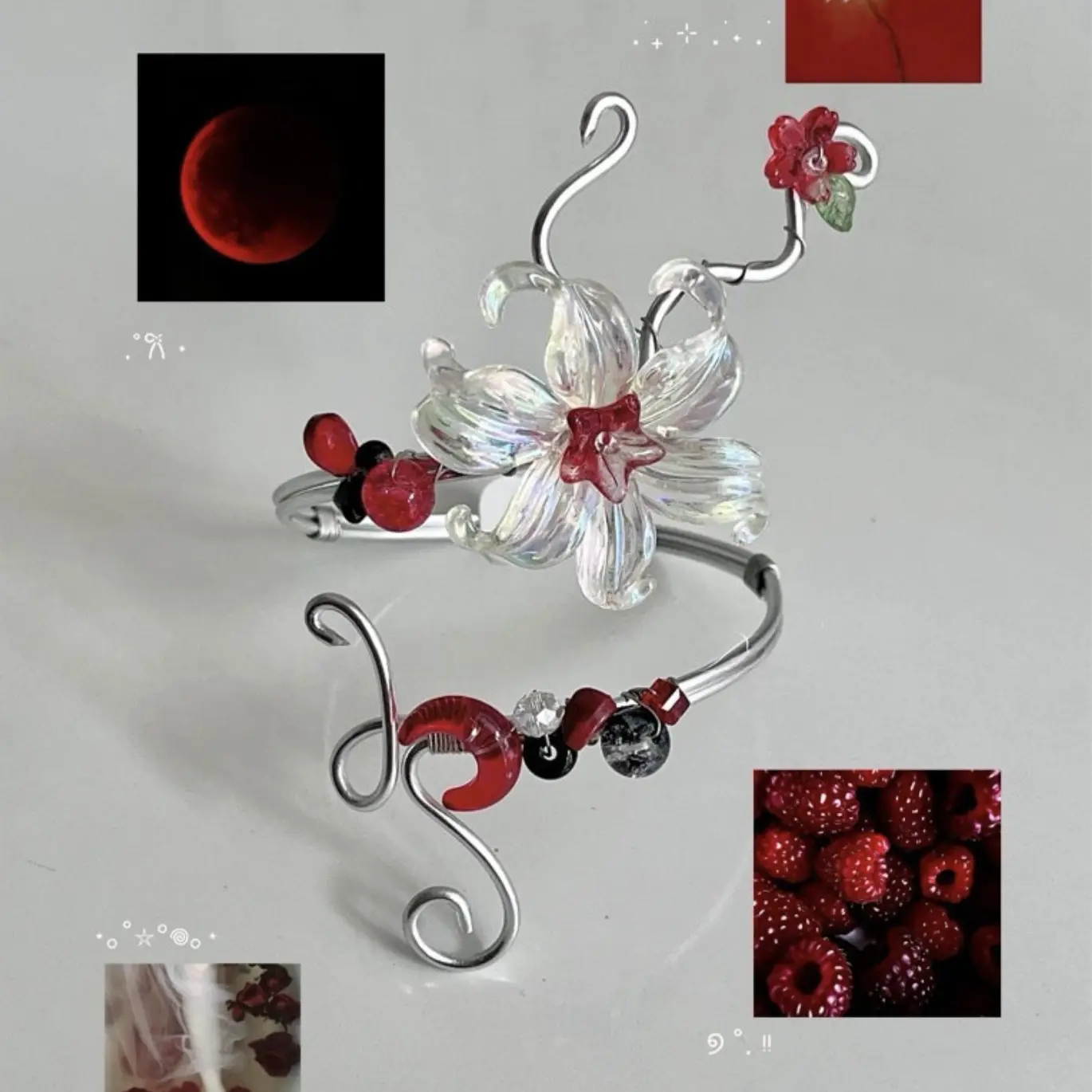A delicate expression of quiet beauty, this handmade arm cuff is inspired by soft petals blooming in stillness. Designed with translucent white flowers, crystal-like beads, and graceful flowing curves, the piece wraps gently around your arm like a whisper of elegance.