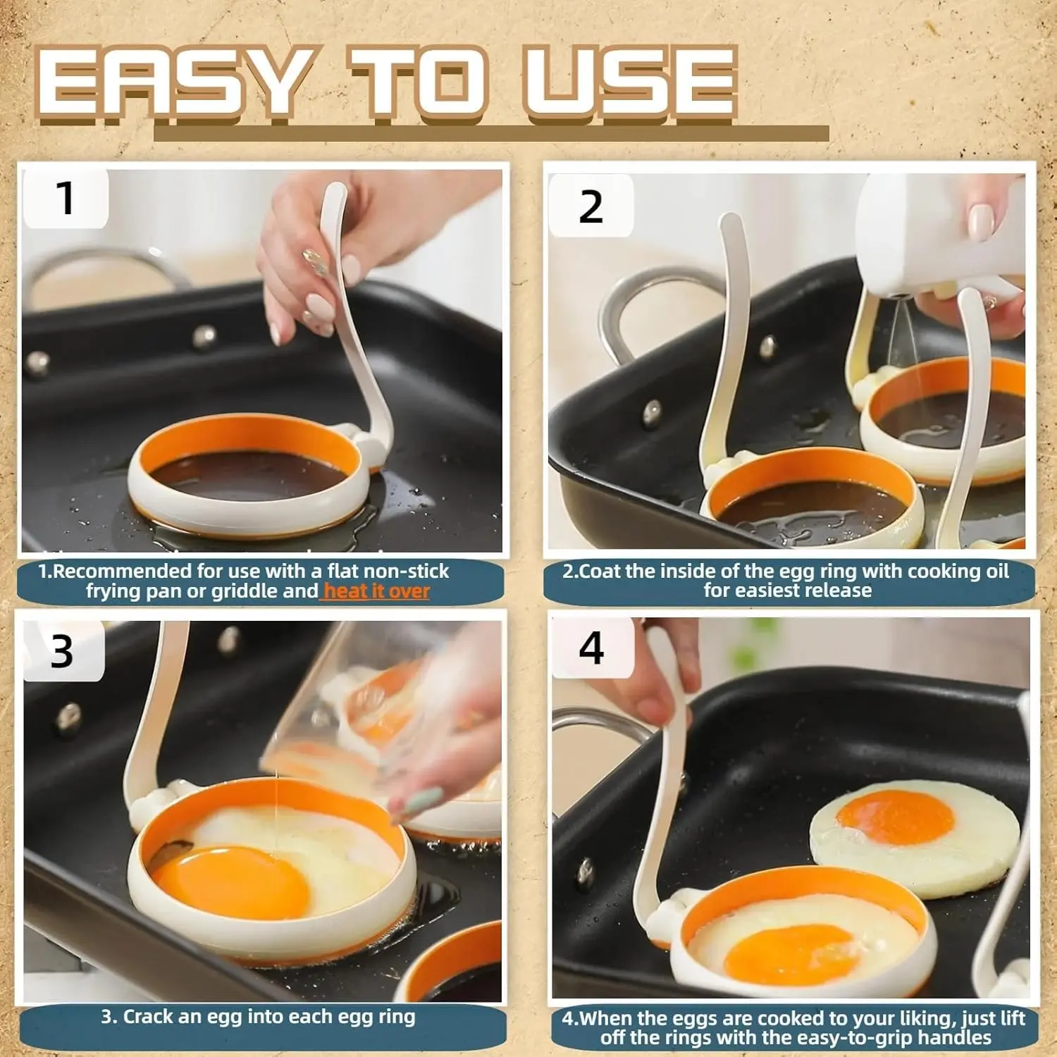 Arrange the rings on a heated flat fry pan or griddle, then crack an egg into each one.When the eggs are cooked to your liking, just lift off the rings using the easy-to-grip cool handles.