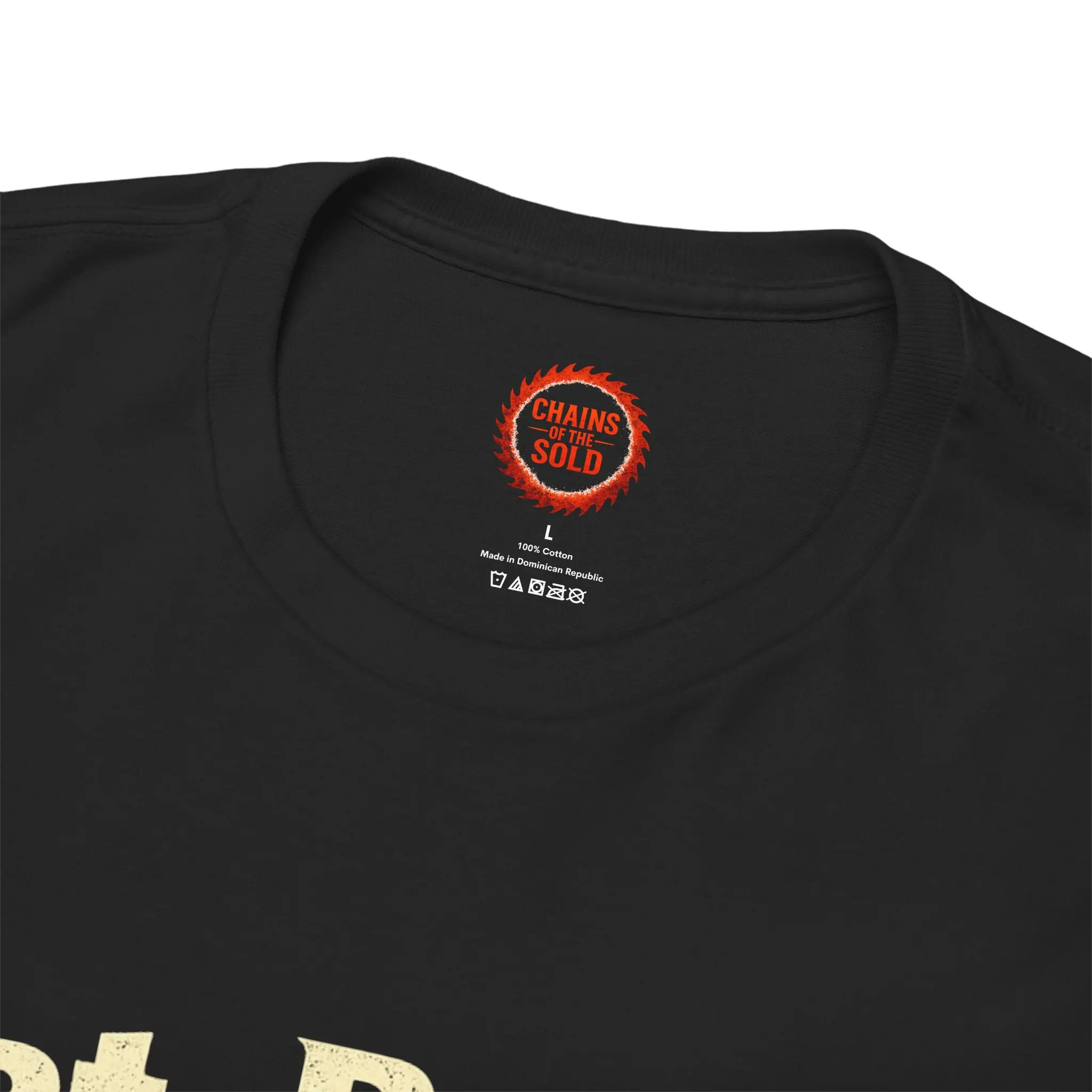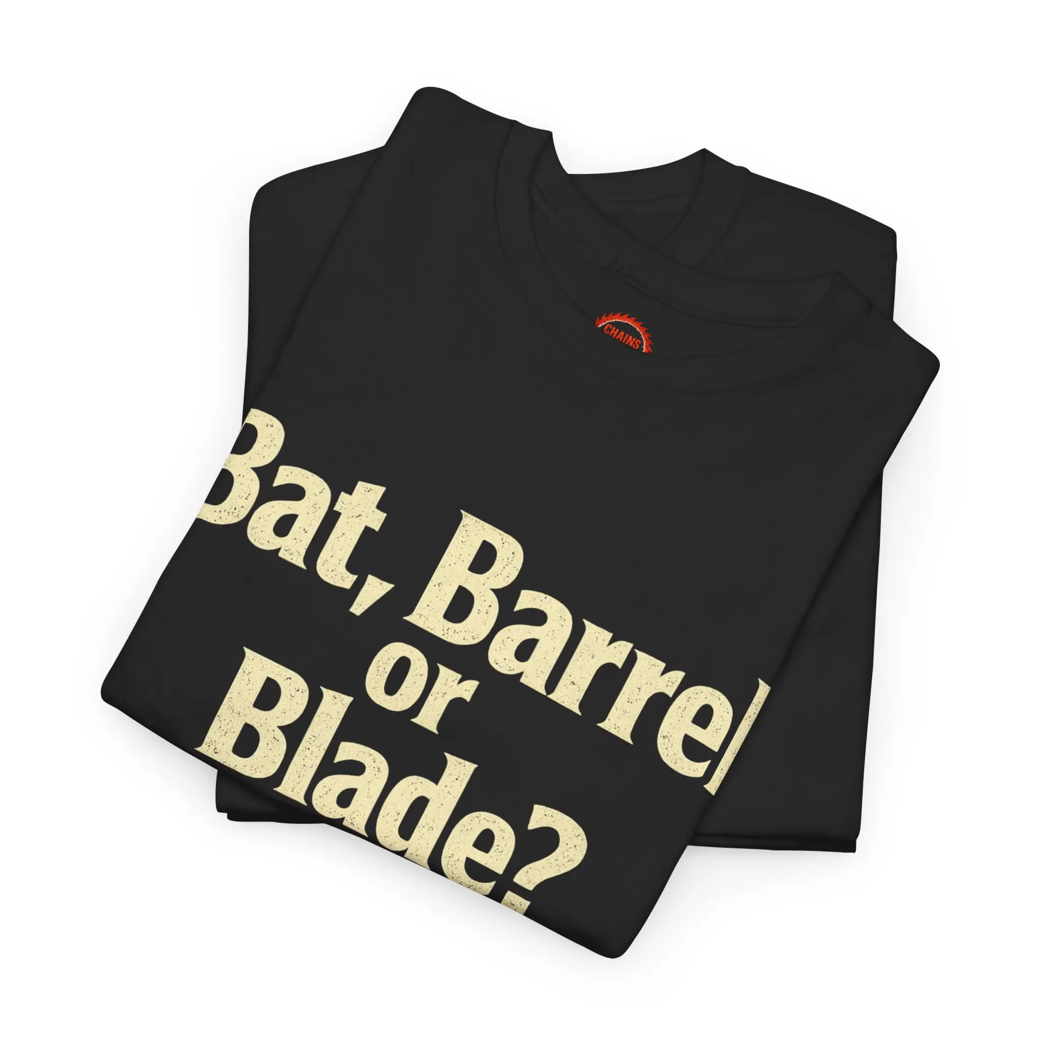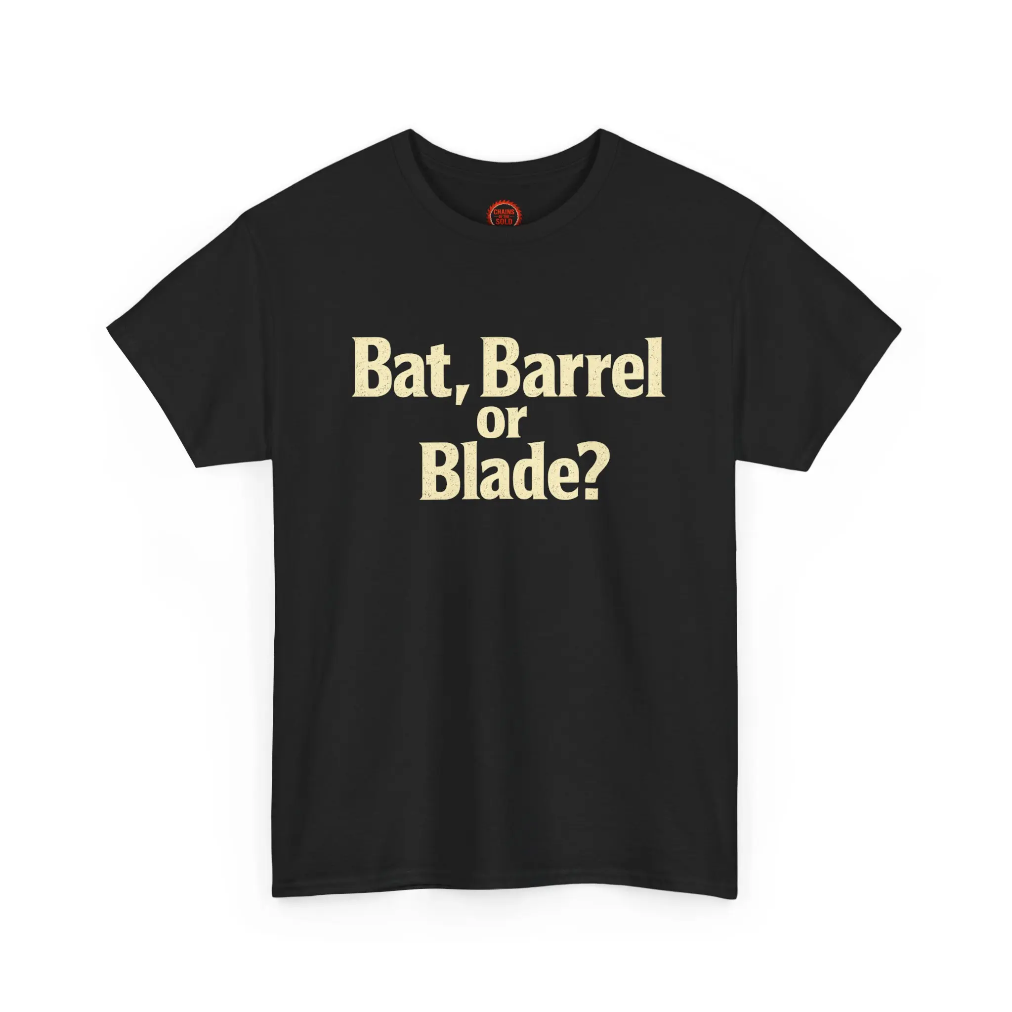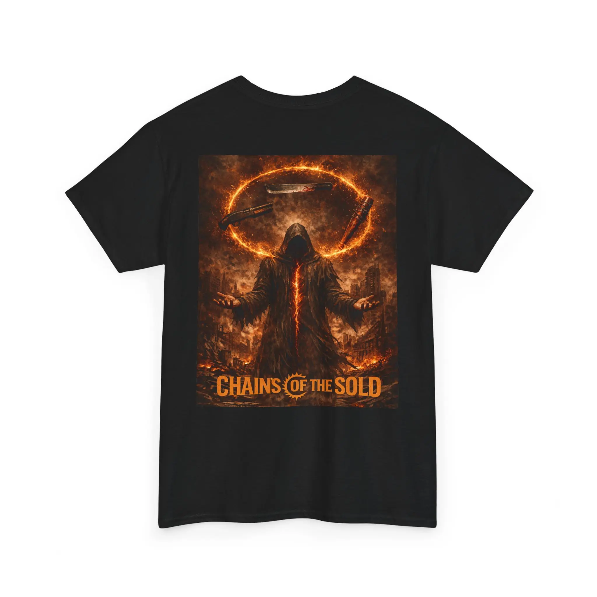 This heavyweight cotton tee carries a dark, cinematic vibe — bold cream lettering across the chest asking “Bat, Barrel or Blade?” and a fiery, apocalyptic back print showing a hooded figure beneath a burning halo with the phrase “CHAINS OF THE SOLD.” It sits relaxed on the shoulders and reads like a statement piece for fans of heavy music, dark fantasy, and gritty storytelling. Wear it to shows, late-night gatherings, or while spinning a vinyl of thunderous riffs; it feels lived-in, durable, and made to age with you. The shirt’s deep black ground makes the warm, molten artwork pop, while the soft but sturdy cotton gives the print a tactile, high-contrast finish that keeps the imagery intense without losing comfort.