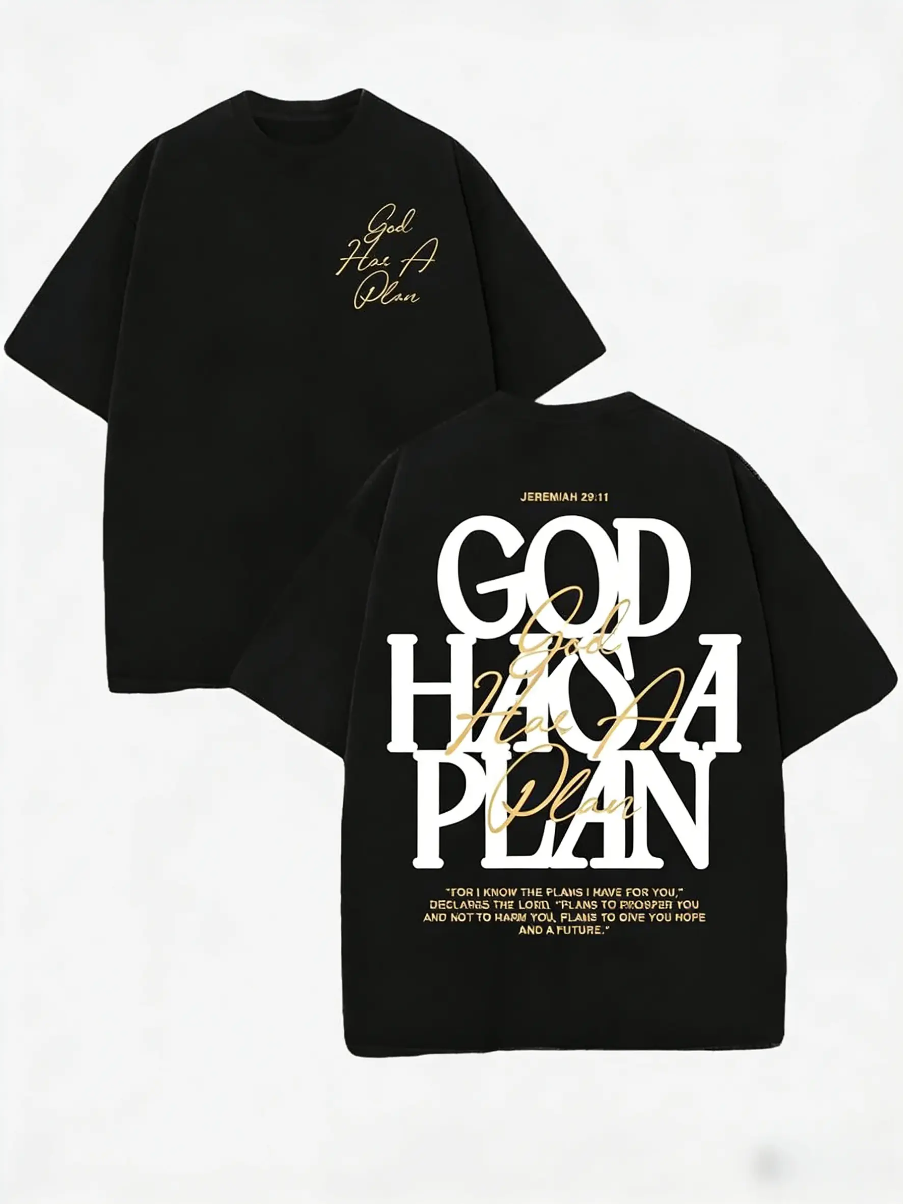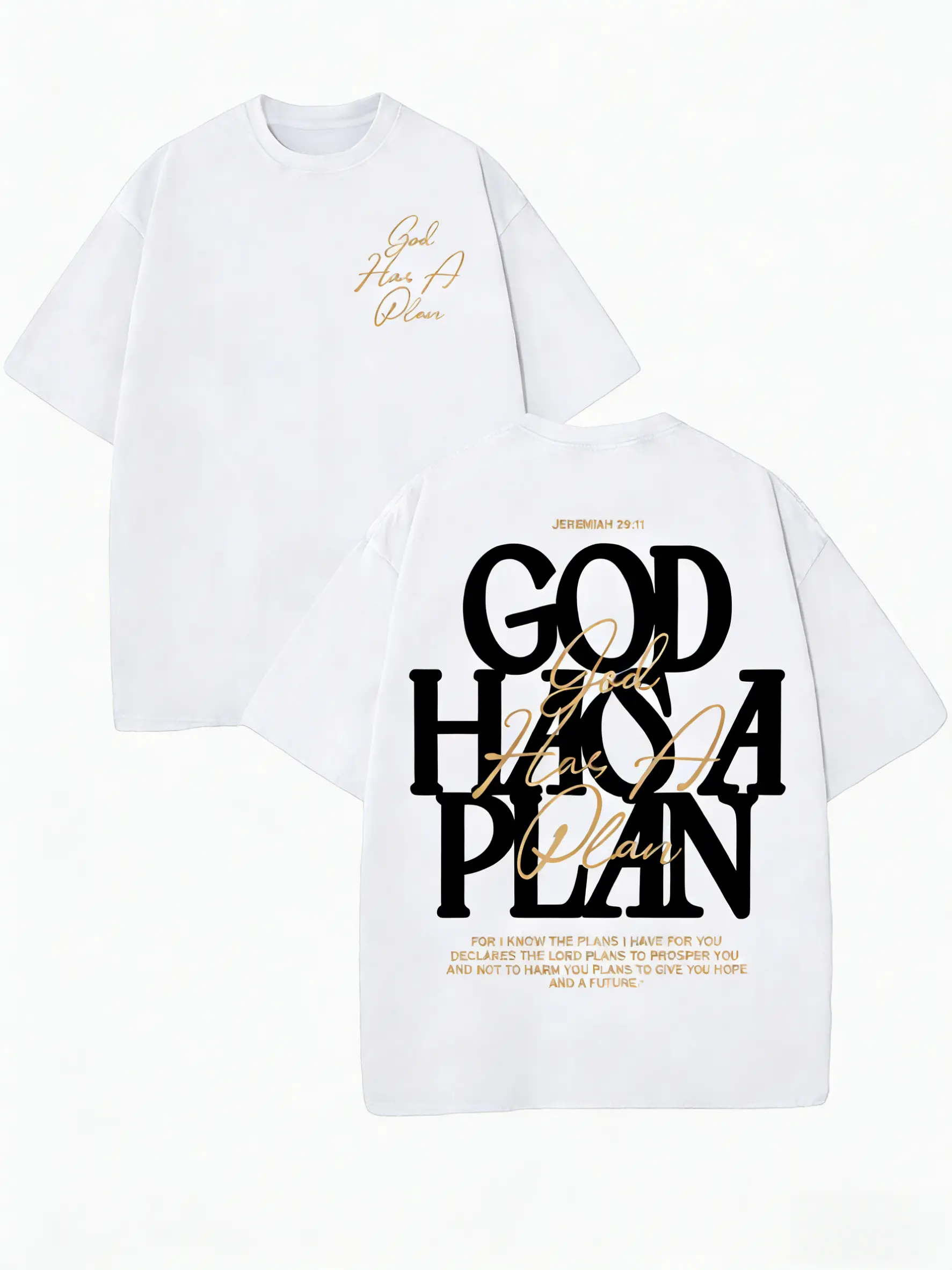 Retro Washed Double Sided Printed T-Shirt, 'GOD HAS A PLAN' Letter Graphic Tee, 230g Pure Cotton, Slightly Cropped, Crewneck, Distressed Streetwear, Men's Casual Comfortable Fashion Tops Smooth Fabric Seamless So