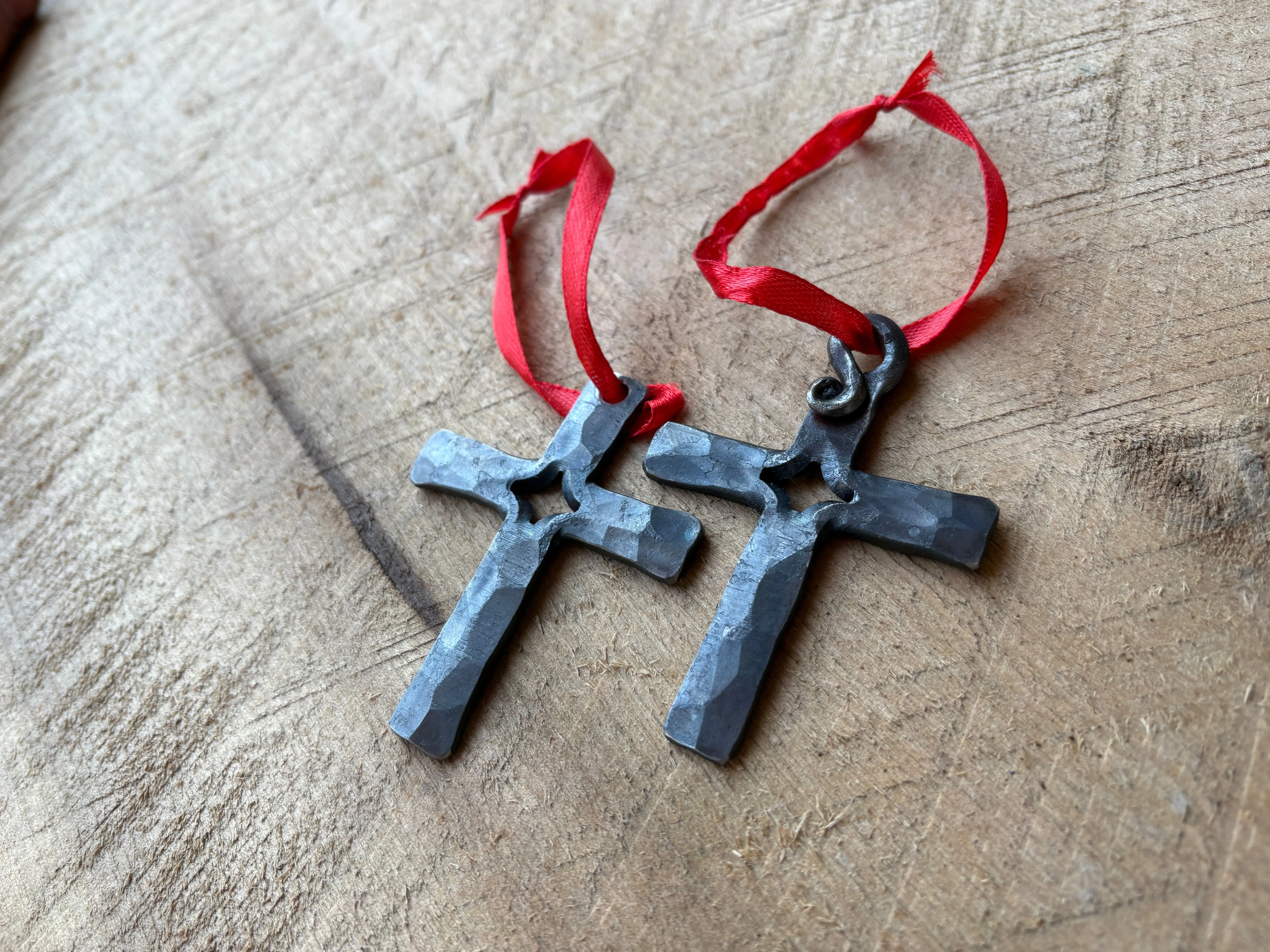 These iron cross ornaments are hand forged from a single piece of iron! I make each one from scratch so they will very a little from one to another. They are a tactile reminder of the sacrifice of Jesus and the true reason for Christmas.