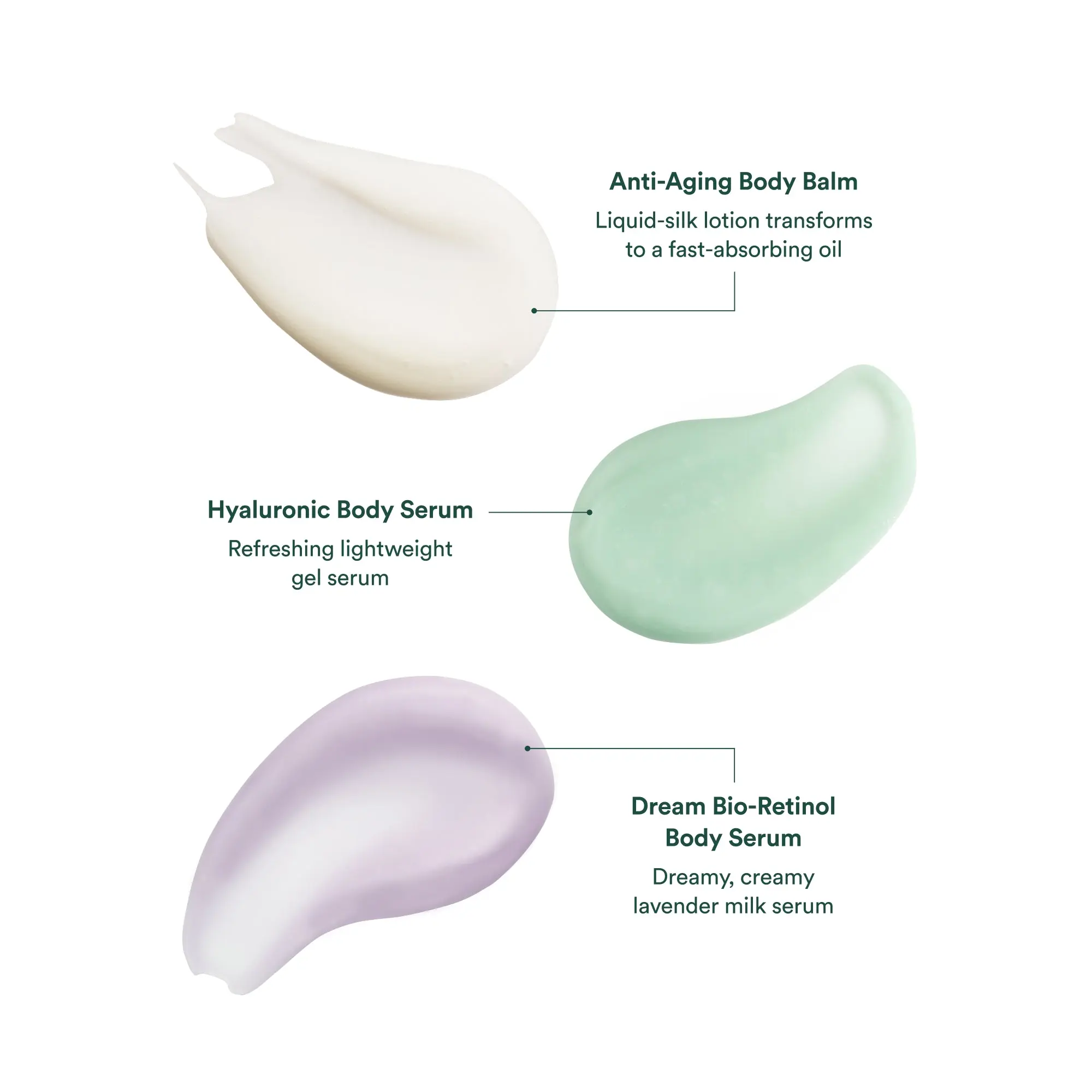 Elevate your body care routine with this 3-step firming and hydrating trio designed to visibly improve skin texture, elasticity, and moisture levels. Featuring a combination of hyaluronic acid, bio-retinol (plant-based retinol alternative), and rich moisturizing ingredients, this set targets dryness, dullness, and the look of fine lines on the body.