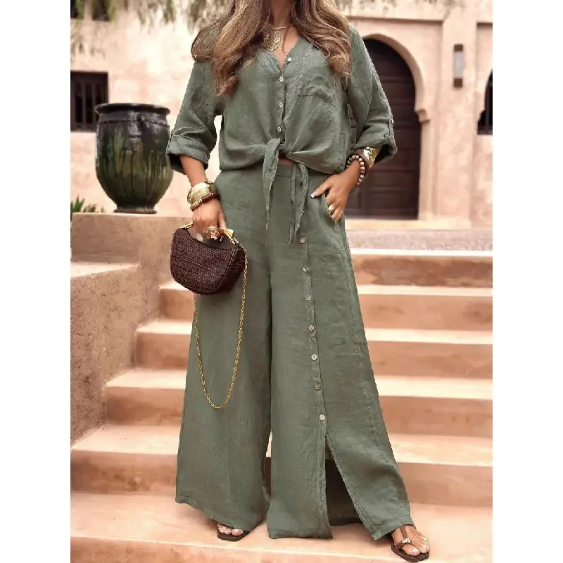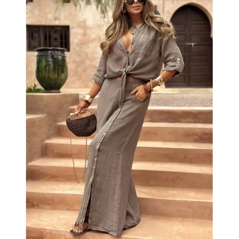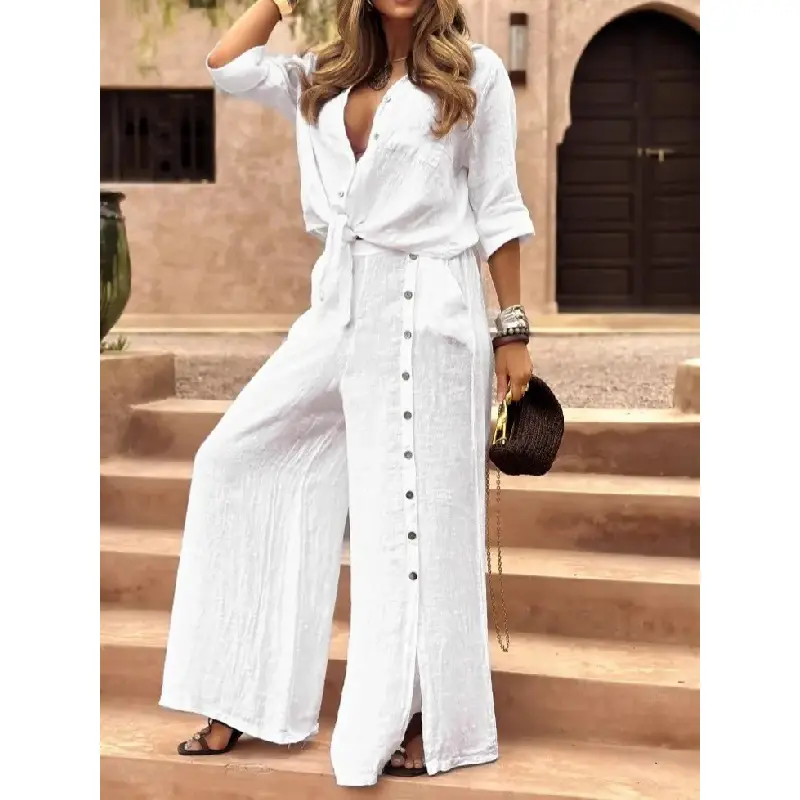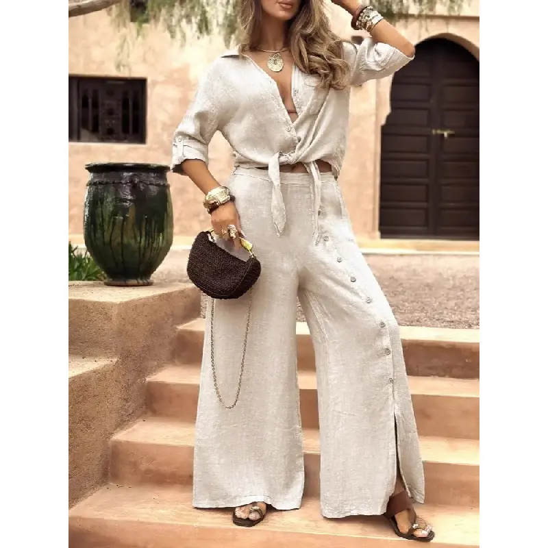 matching sets women Loose Fit Long Sleeve Shirt Set Tie Hem Wide Leg Pants Casual All Season Outfit Mother's Day Gift