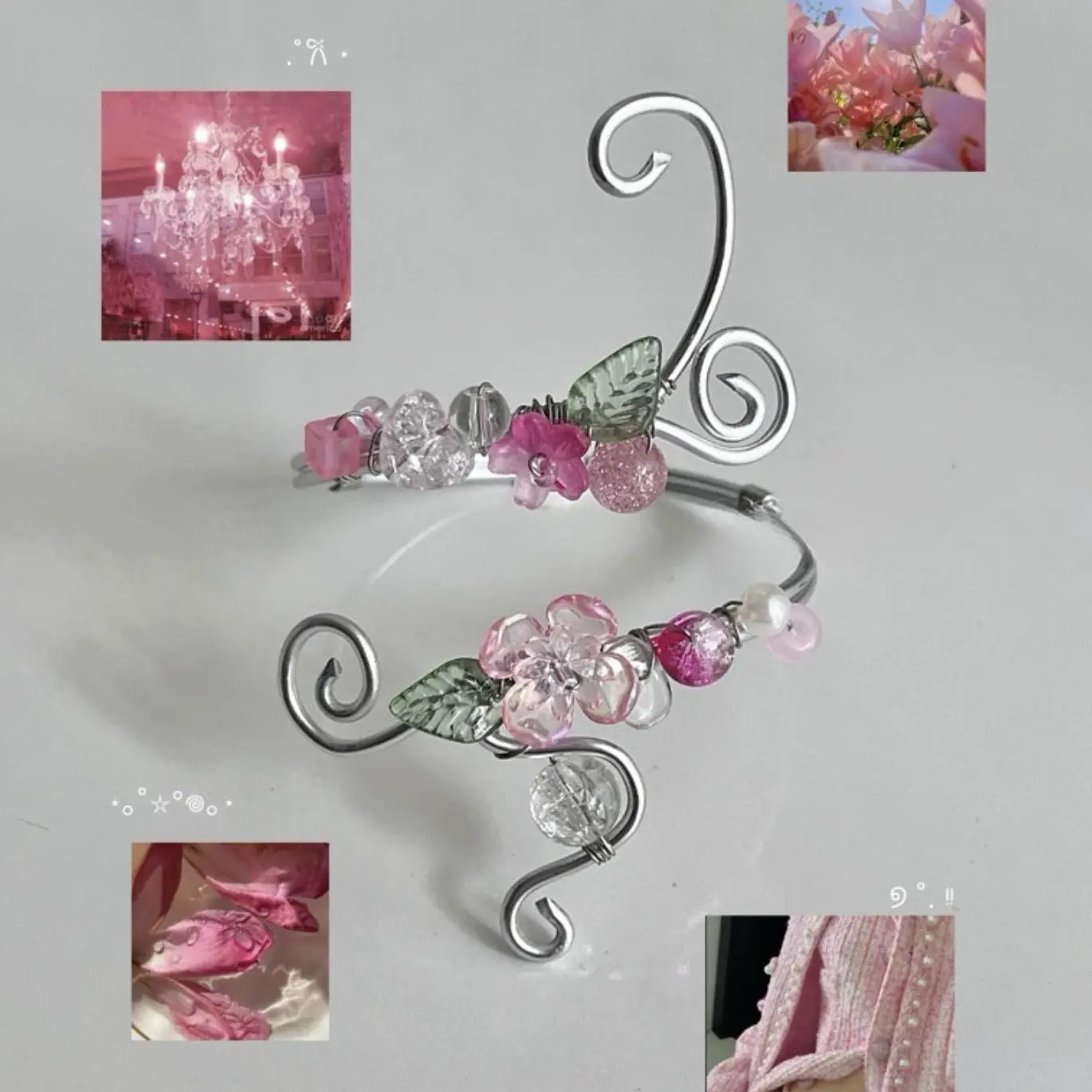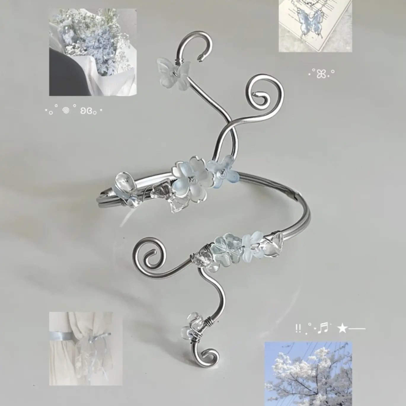 A delicate expression of quiet beauty, this handmade arm cuff is inspired by soft petals blooming in stillness. Designed with translucent white flowers, crystal-like beads, and graceful flowing curves, the piece wraps gently around your arm like a whisper of elegance.