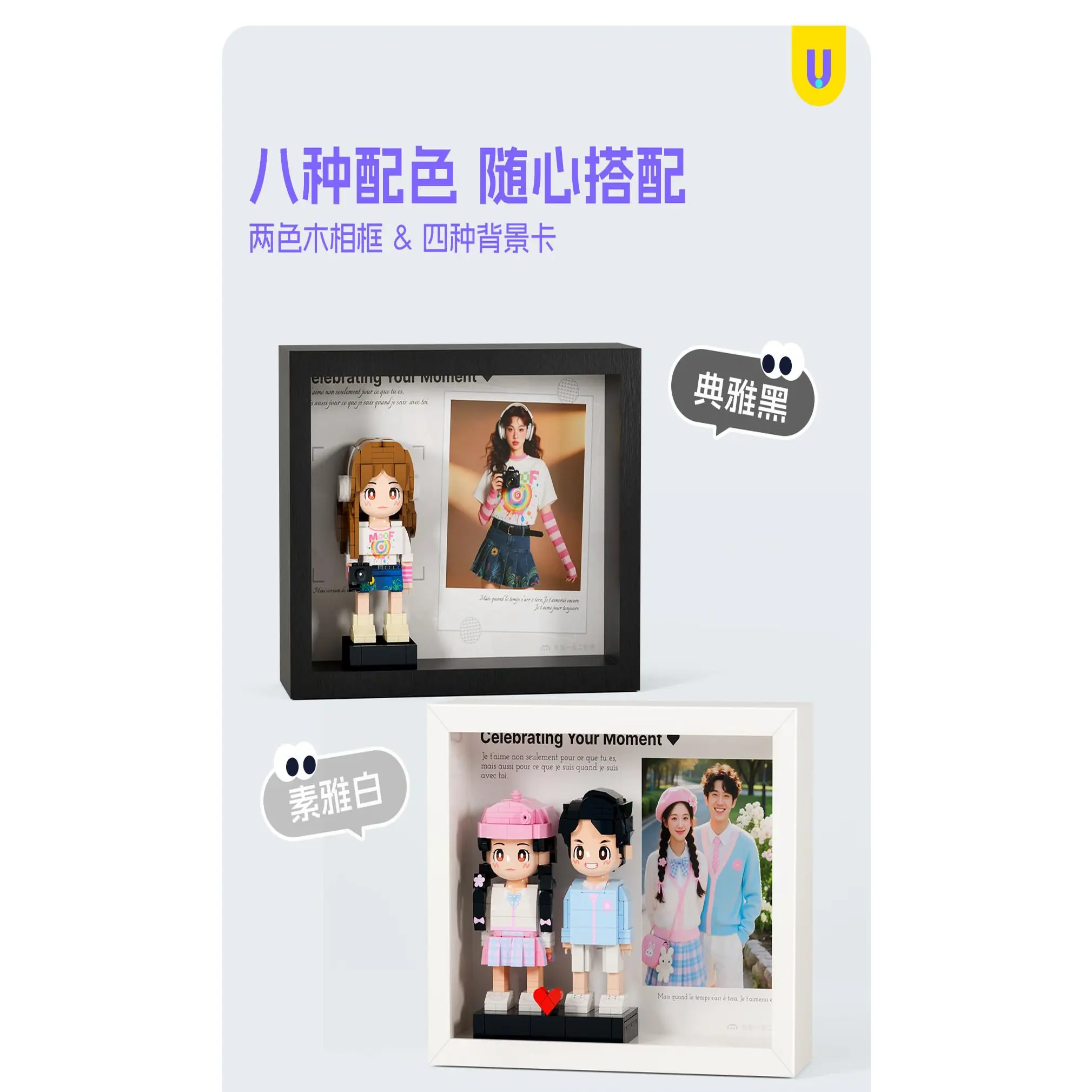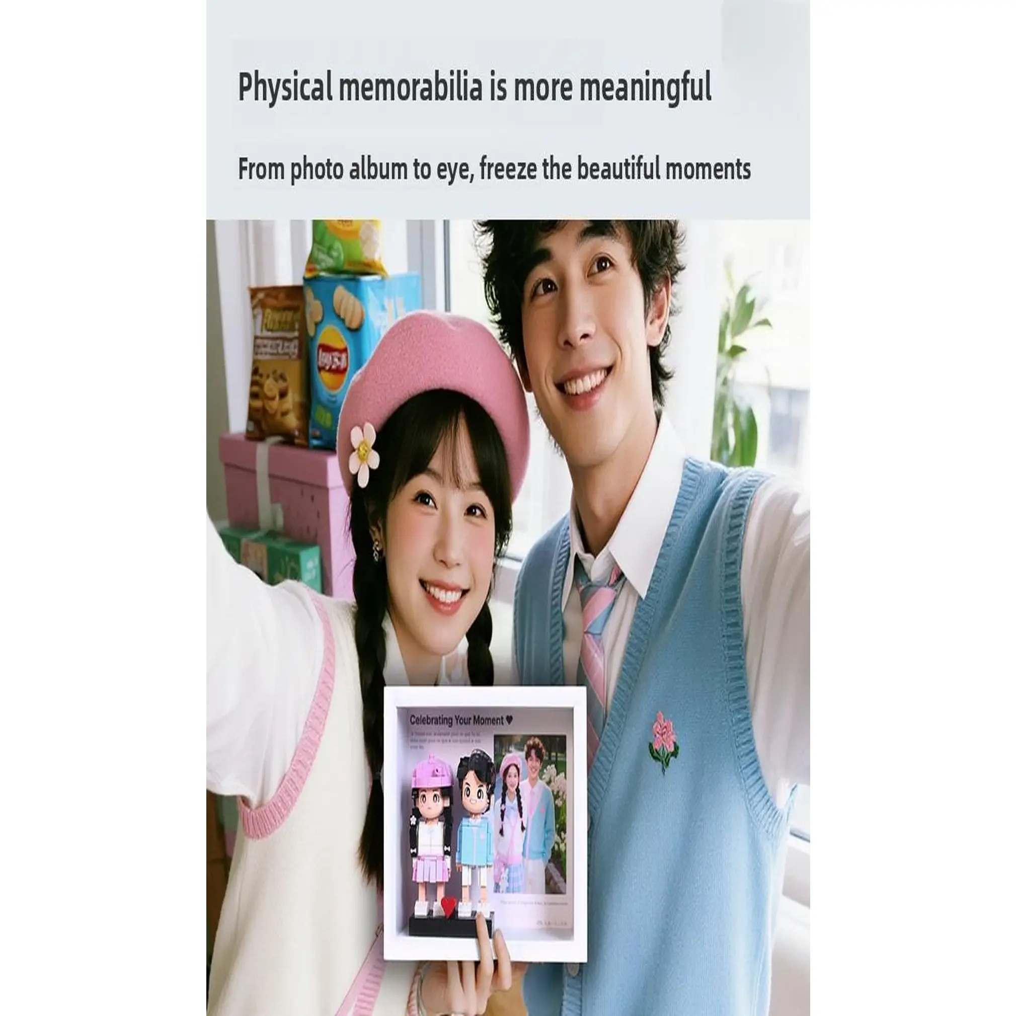 The DIY portrait building block figurine takes customization to the next level. Using high-definition printing technology, we replicate your portrait details - from facial features to clothing styles - on to the building blocks. The set comes with clear, easy-to-follow instructions, allowing you to assemble it yourself, infusing every piece with love and intention. It's a fun DIY activity that lets you create a one-of-a-kind hand figurine that looks just like you two, making it extra meaningful.