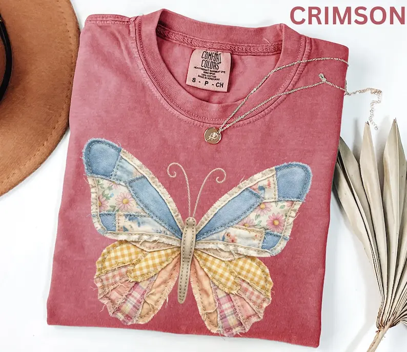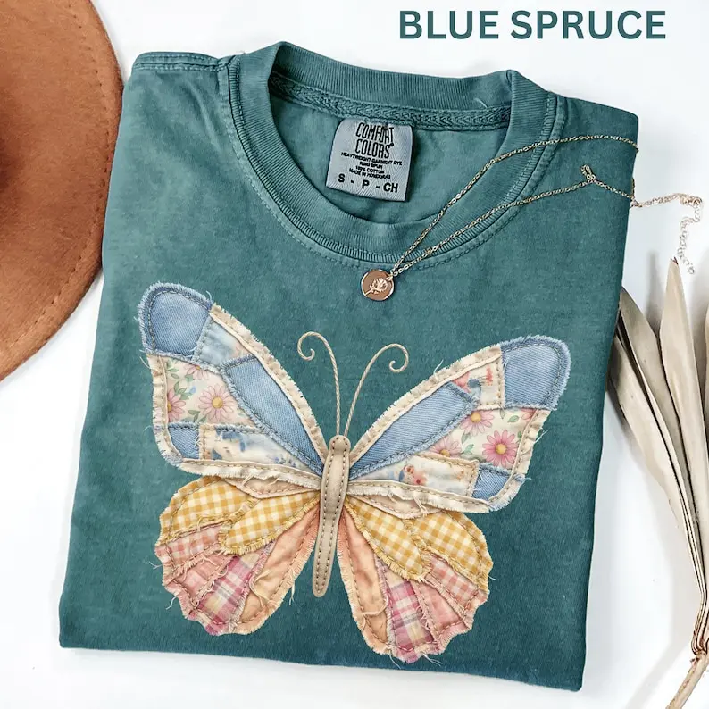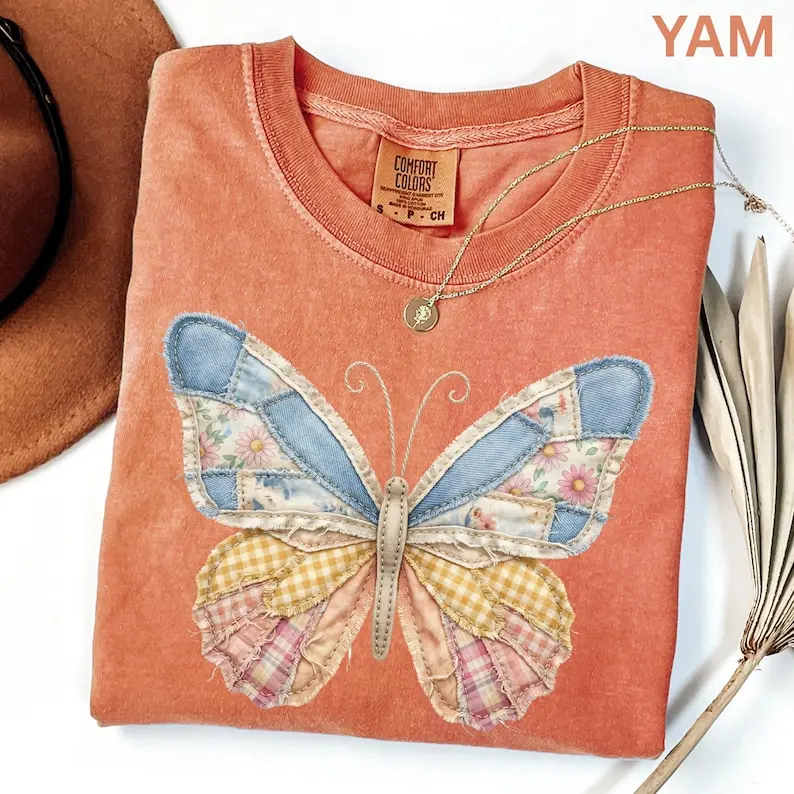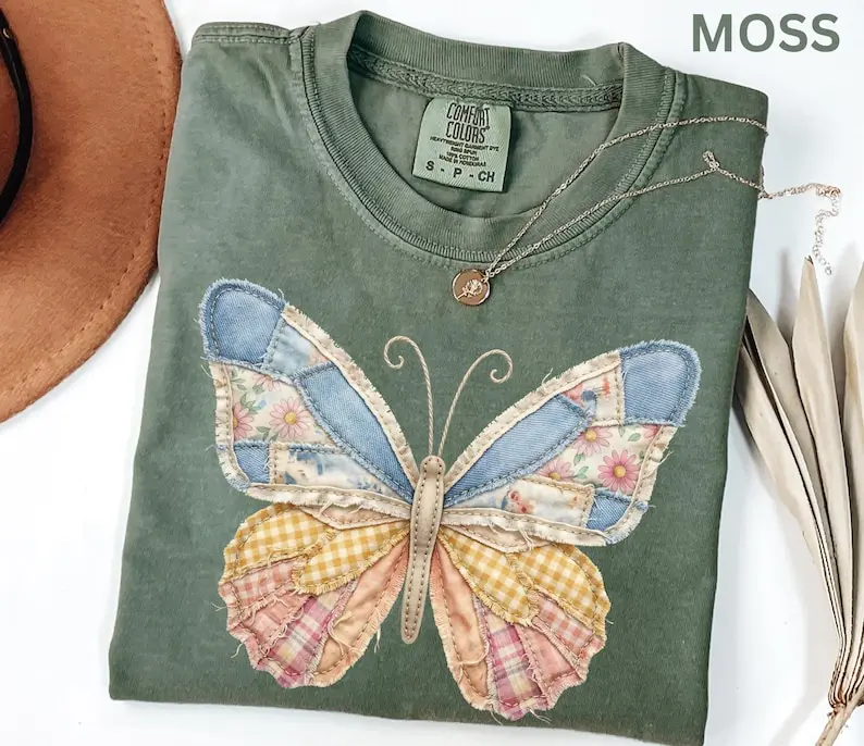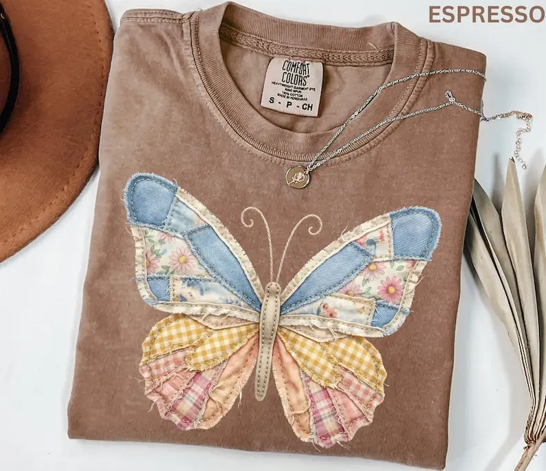 Comfort Colors Faux Patchwork Butterfly Shirt Spring Wildflower Aesthetic Graphic Tee Adult And Youth Matching Boho Vintage Shirts for Women