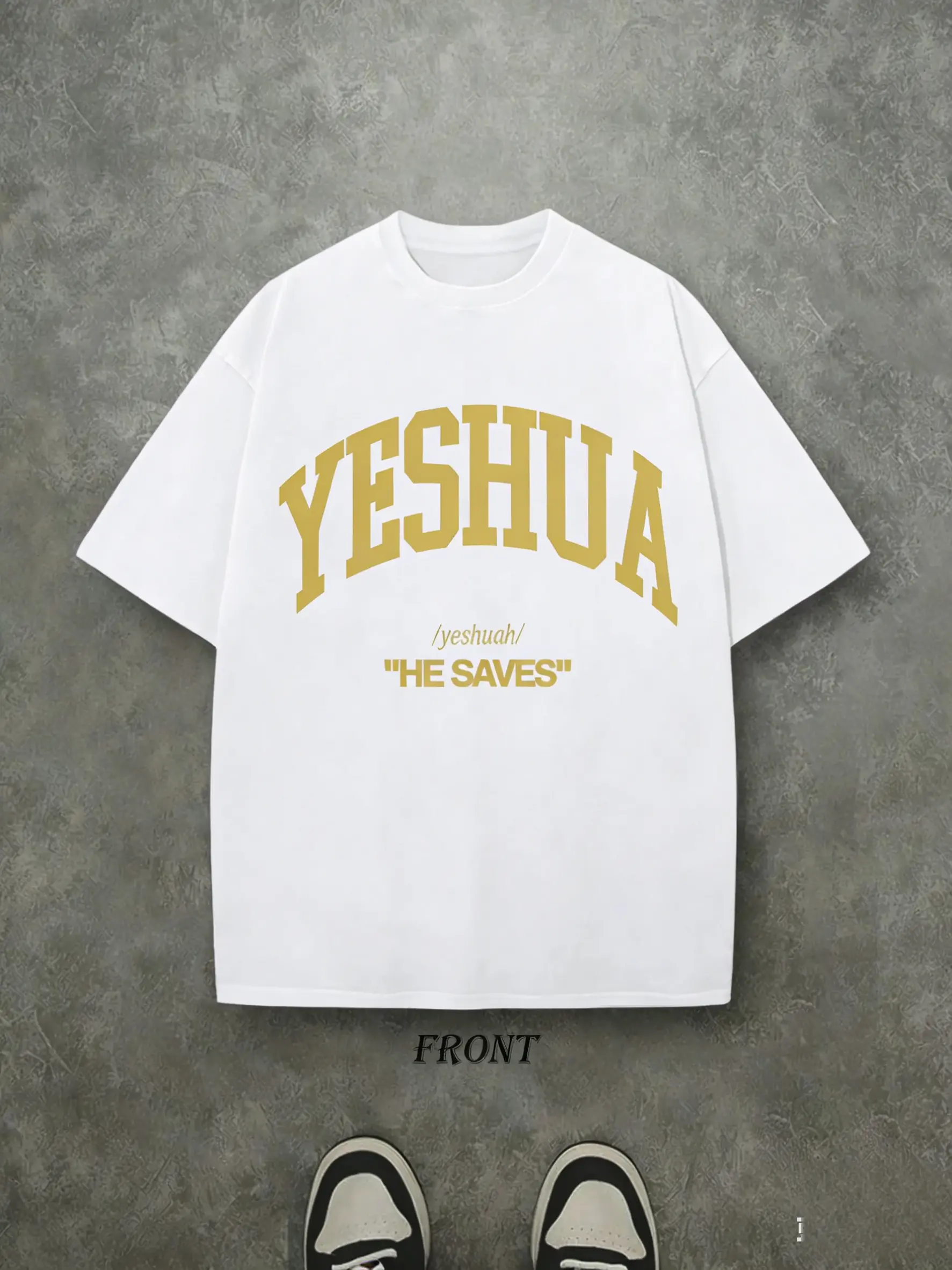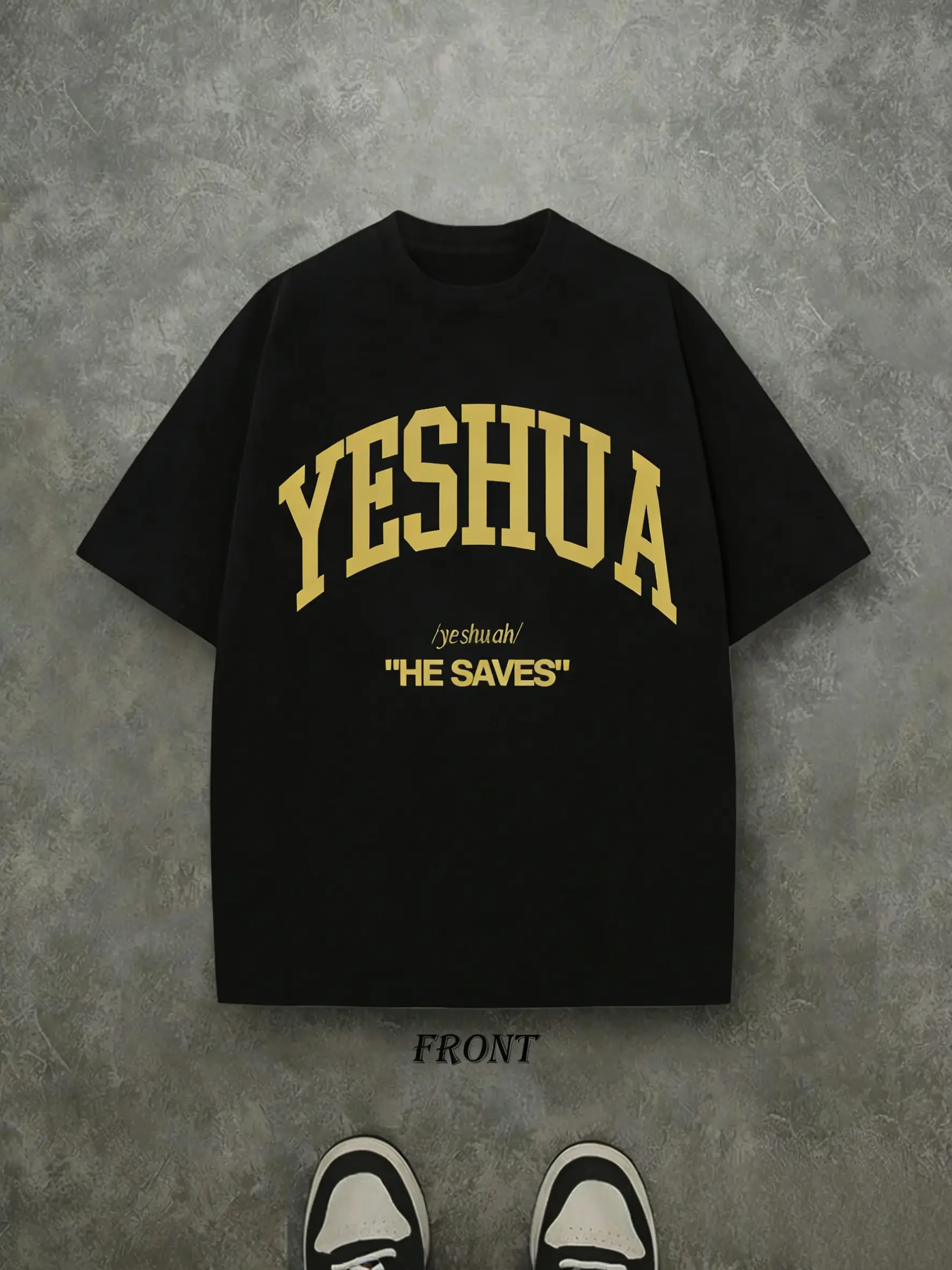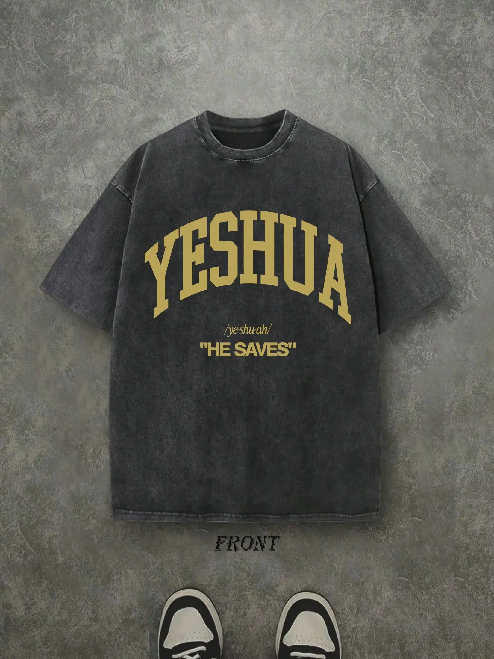 Retro Washed T-Shirt Single-Sided Printed (230 Pure Cotton T-Shirt) 'YESHUA HE SAVES' Letter And Pattern Print, Christian Gift, Mens TShirt, Mens Shirt Casual, Comfortable, Fashionable T-Shirt, Street Style C