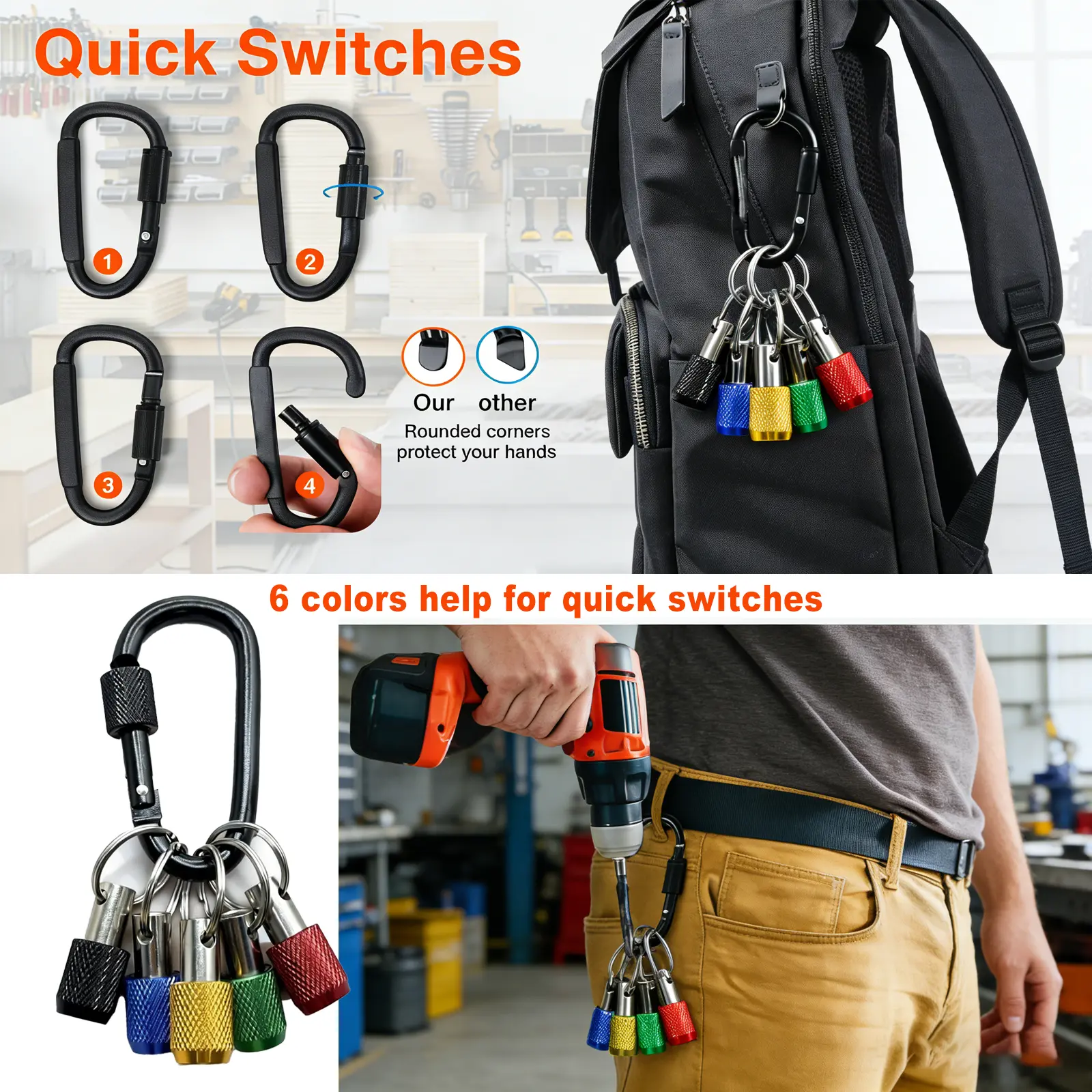 Made from lightweight aluminum alloy, these extension bar holders are strong, durable, and comfortable to carry without adding bulk. The built-in carabiner clip makes it easy to attach them to your keys, tool bag, belt loop, backpack, or workshop organizer, so your most-used bits stay ready whenever you need them.