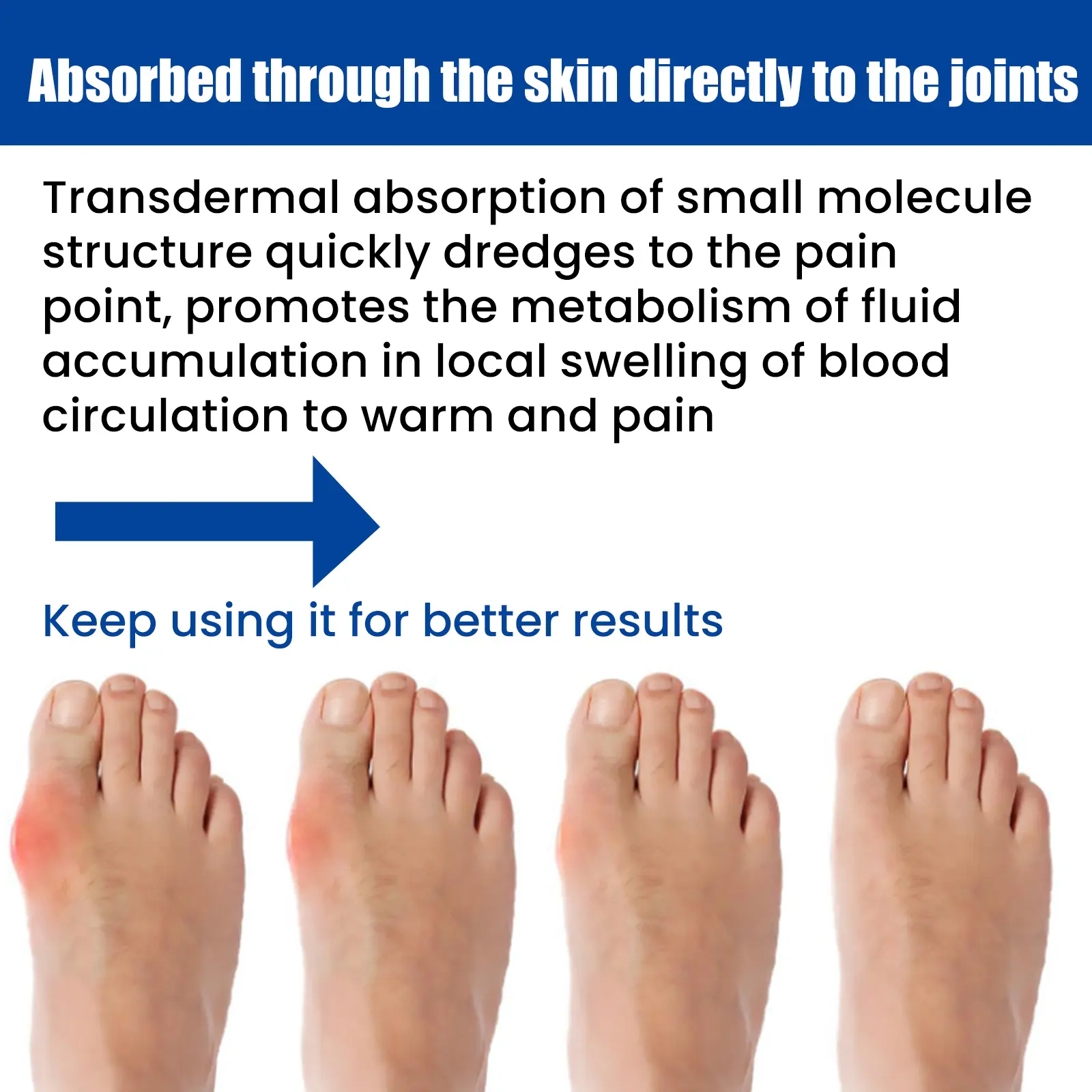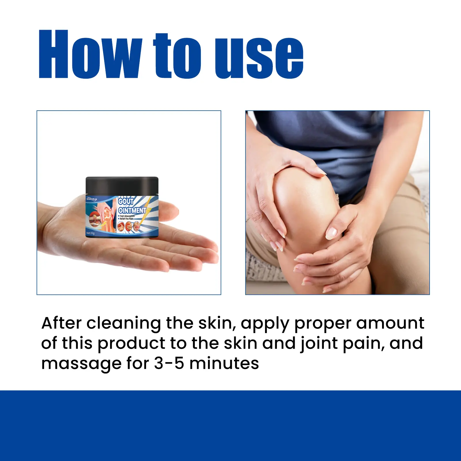 Our gout care cream contains ginger, red saffron, and ginseng. It can assist in treating gout and effectively promotes blood circulation while reducing swelling and relieving pain. Its small molecules are absorbed through the skin to quickly reach the affected area, promoting metabolic changes in local edema and warming the blood flow for pain relief. It’s simple to use: After cleansing, apply an appropriate amount to the skin and areas of joint pain, massaging for 3–5 minutes. Gout care cream relieves pain, swelling, redness, and inflammation at the joints; it penetrates deeply to eliminate joint pain.