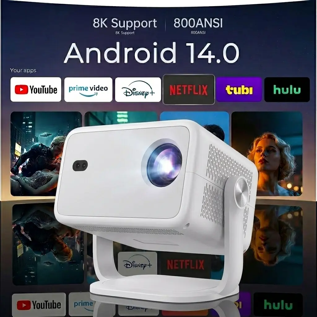 Android 14 Smart Projector 800 ANSI, Native 1080P, WiFi Bluetooth, Auto Focus/Keystone/Object Avoidance, Built-in Apps, 180 ° Gimbal Stand, 8K Home Cinema & Outdoor Gaming