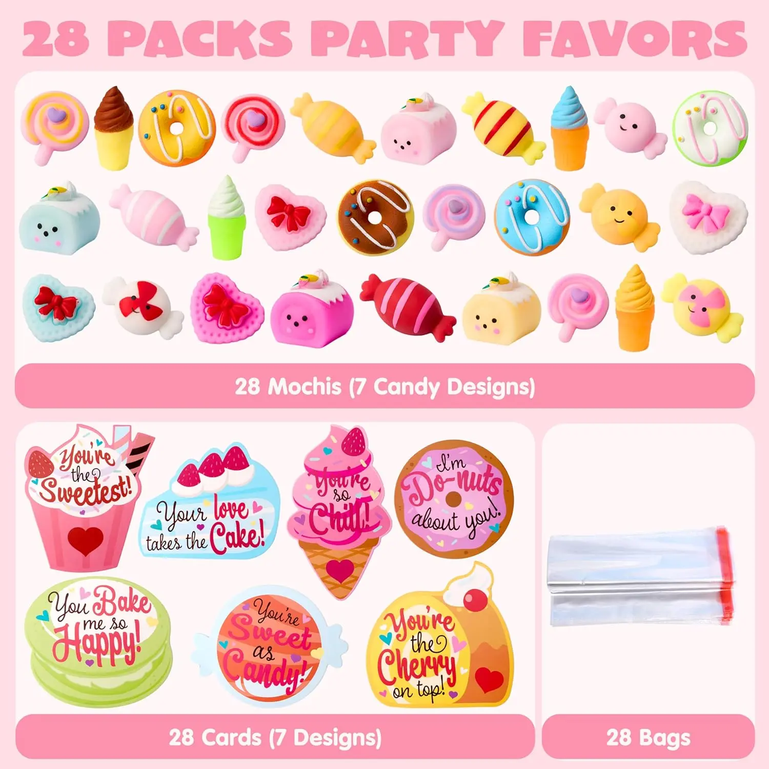 28 Packs Valentine’s Day Gift Cards with Candy Mochi Squishy Toys, Stress Relief Fidget, Cute Squeeze Toys for Kids Valentine's Party Favors, Classroom Gift Exchange and School Reward