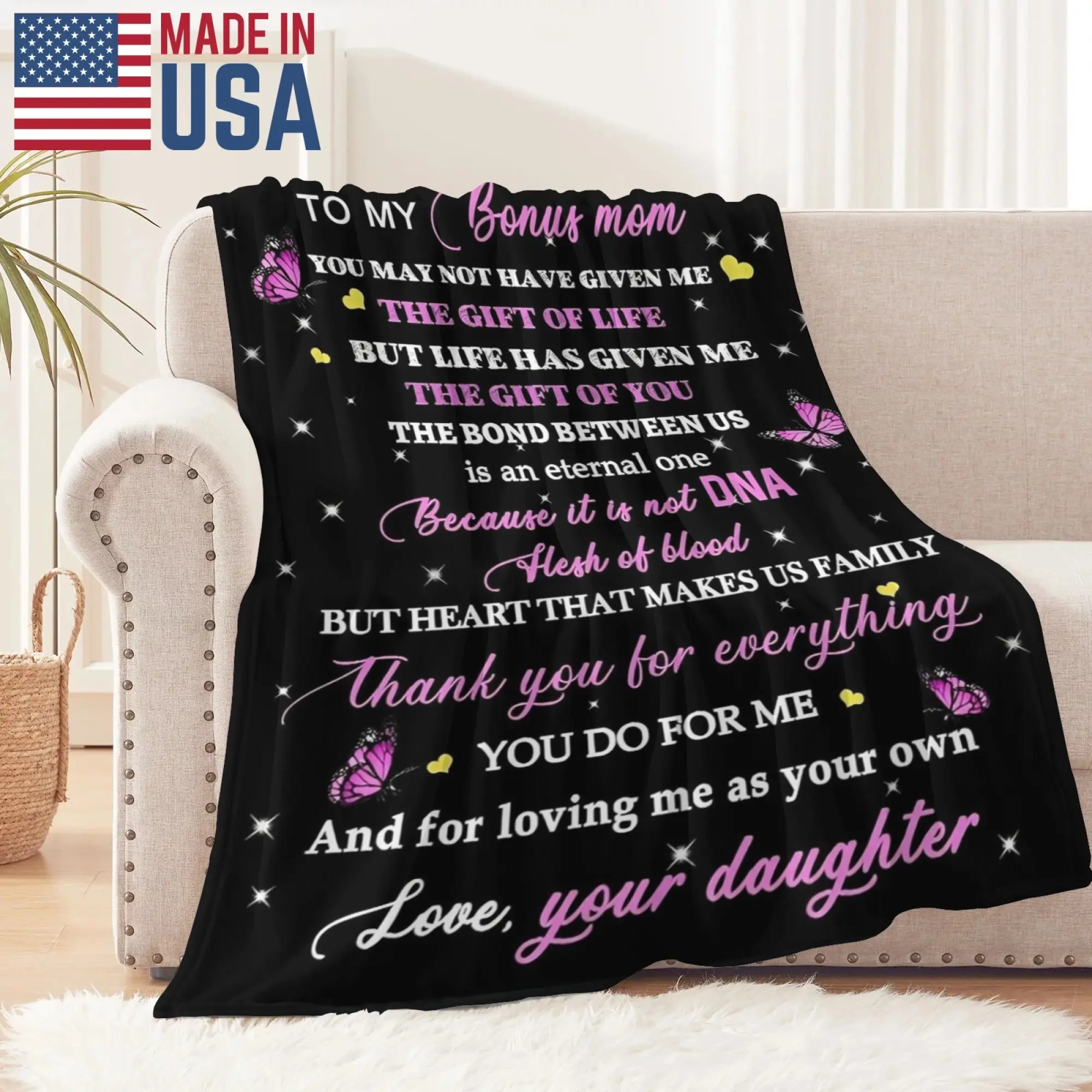 Printed with a warm and emotional message, this blanket perfectly captures the unique relationship between a daughter and her bonus mom. The elegant typography, paired with delicate butterfly and star accents, creates a visually stunning and meaningful gift.
