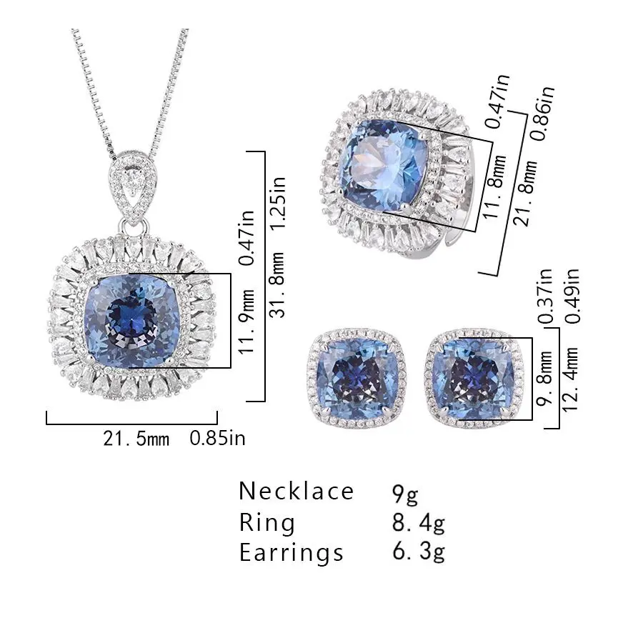This luxurious jewelry set features a vintage square design. It includes a ring, earrings, and necklace, all adorned with imitation blue bird's nest cut gemstones. It is perfect for women who appreciate vintage elegance. This jewelry set is a stunning addition to any wardrobe, offering a touch of luxury and fashion