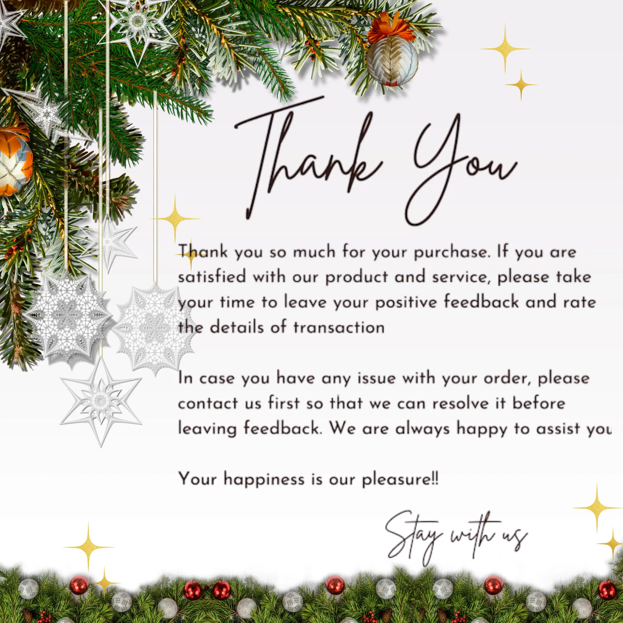 - Returns are only accepted for damaged or defective items upon delivery
