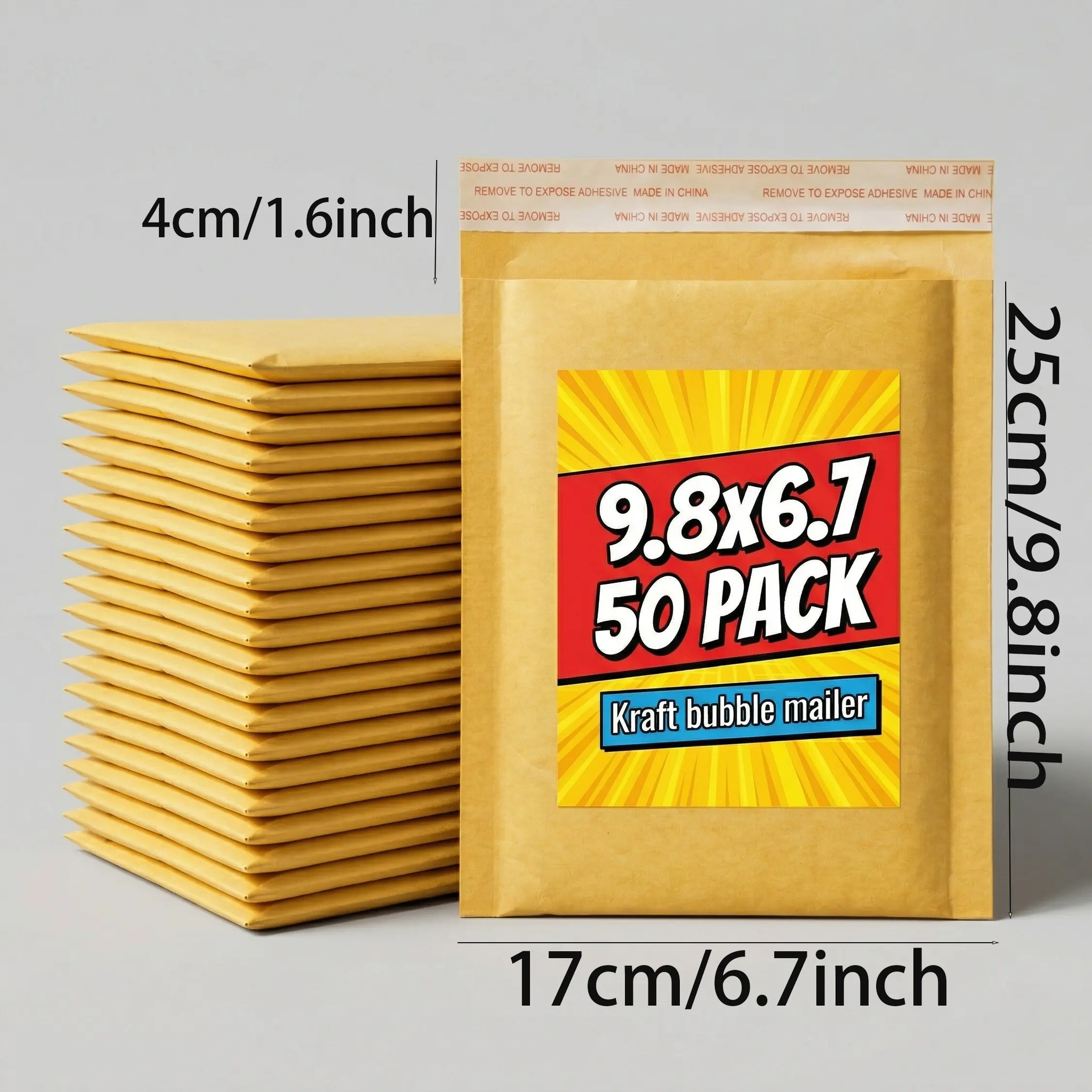 50/100 Pcs of 6.7x9.8 Inch medium-sized universal bubble mailers, designed to fit the most common mid-size items without wasting space—such as small plush toys, 3-piece skincare sets, hardcover books, laptop chargers, folded cotton t-shirts, or mini coffee machine filters. The 50 Pcs pack meets personal needs (e.g., sending birthday gifts, returning mid-size online orders), while the 100 Pcs bulk option suits small business owners (like toy shops, beauty retailers, or home appliance accessory sellers) and aligns with JIT inventory to avoid overstocking and cut storage costs.
