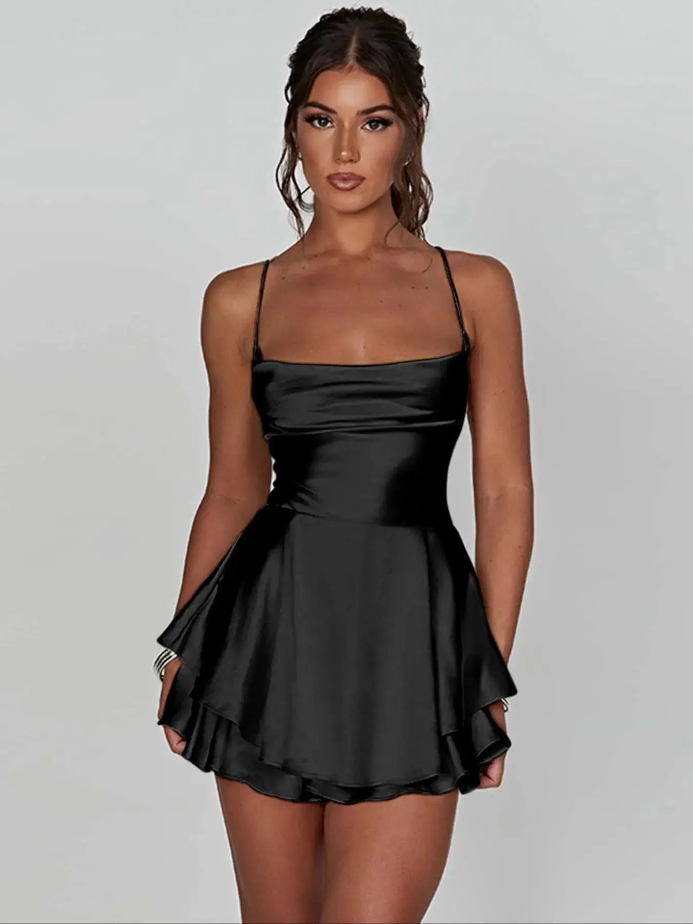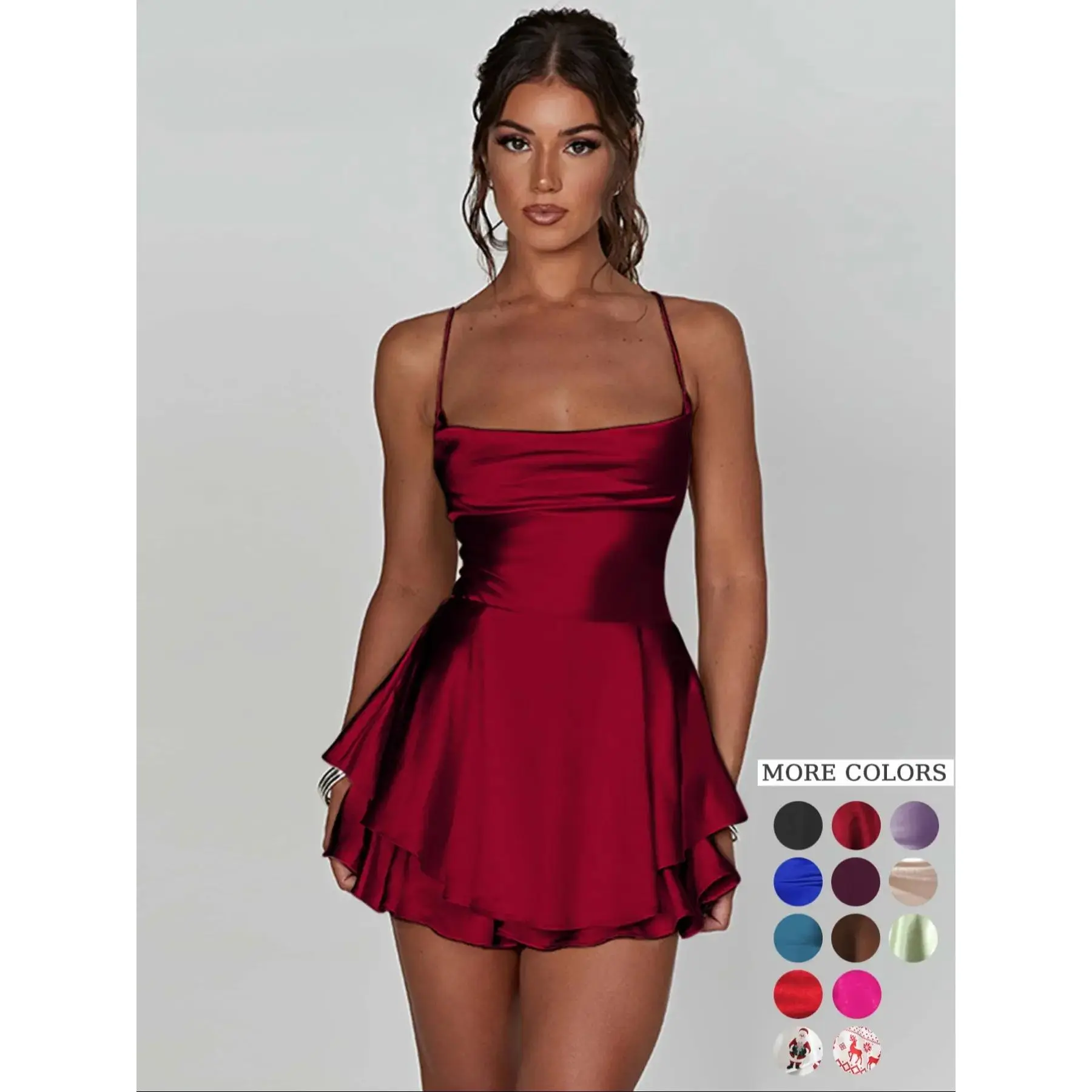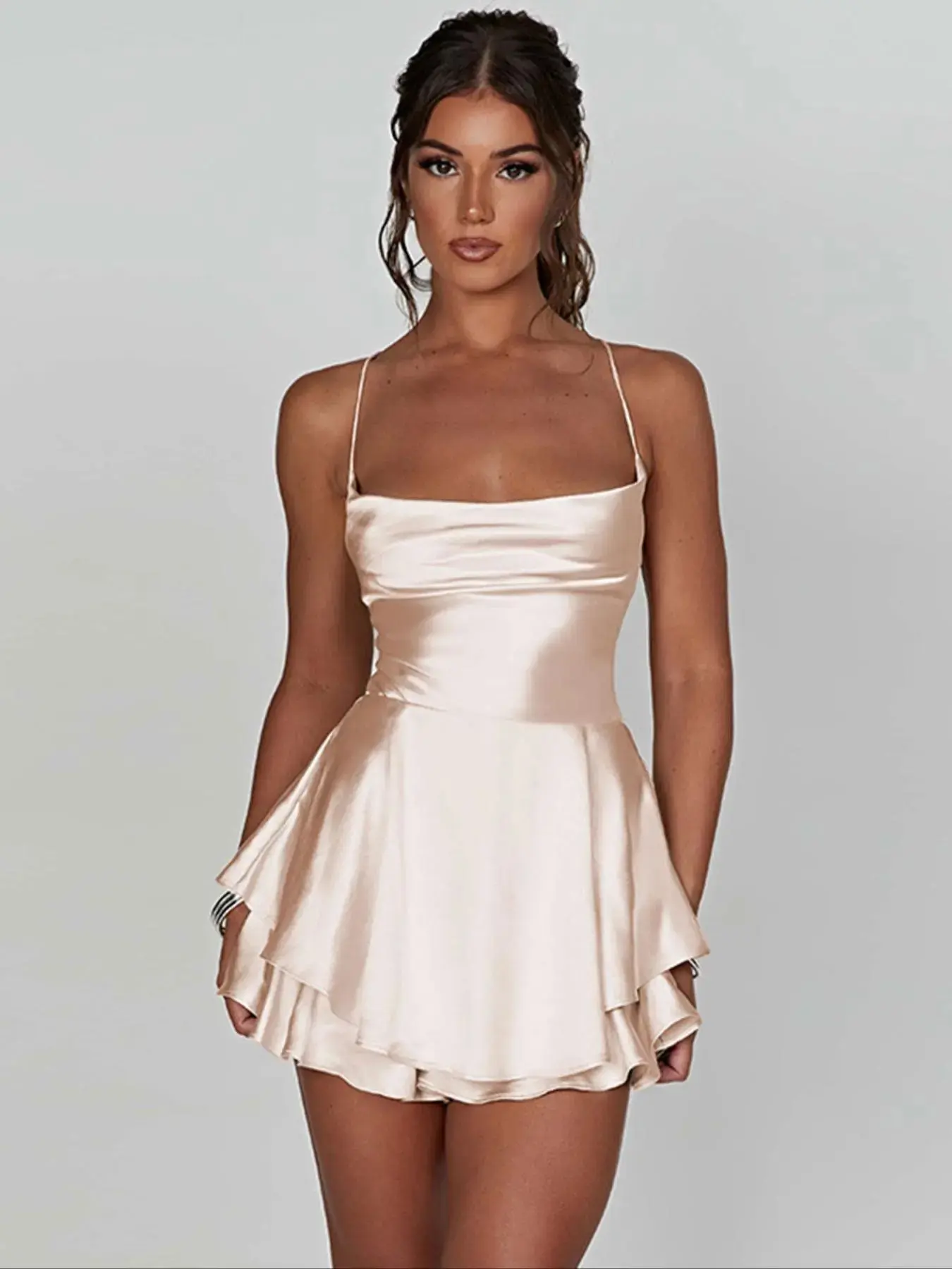 Women's Plain Lace Up Backless Tiered Layer Stretchy Satin Cami Dress, Summer Clothes Women, Elegant Cowl Neck Sleeveless A Line Short Dress for Party Holiday Wedding Guest, Dresses for Women, Bridesmaid Dresses