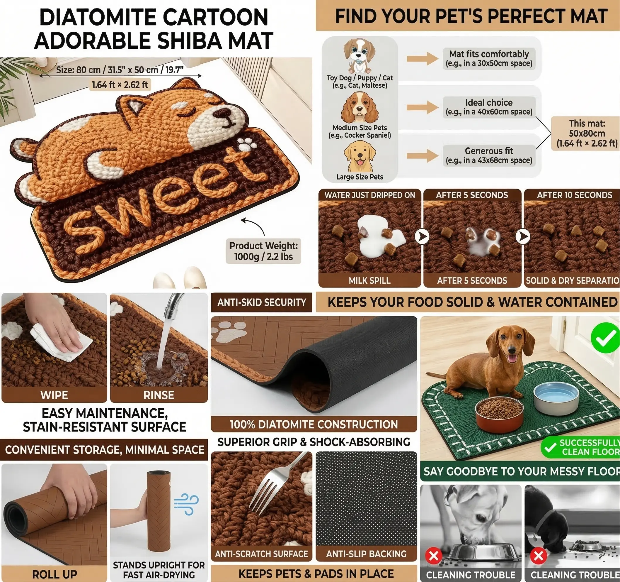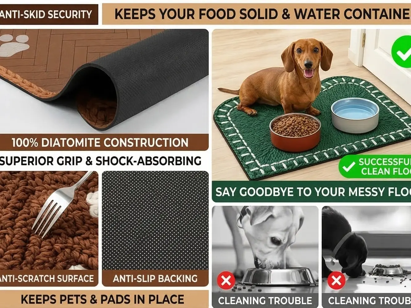 ·Made with premium food-grade diatomaceous earth, instantly absorbs 500ml of water in 3 seconds (3x faster than ordinary chenille or microfiber mats)