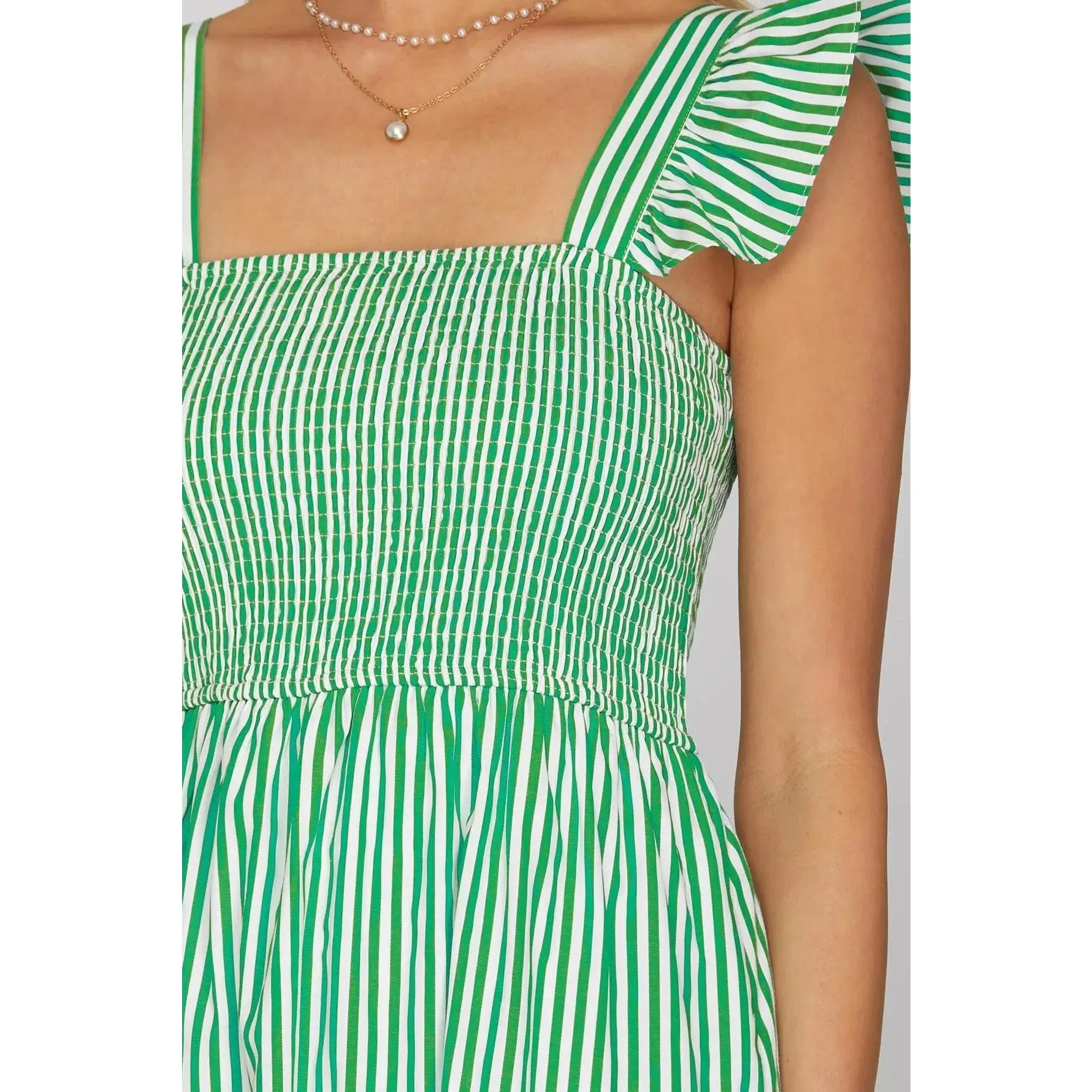Fresh, feminine, and made for sunshine, this green striped midi dress is the kind of piece you’ll reach for all season long. Designed with a flattering smocked bodice and flowy tiered skirt, it gives you that effortless, put-together look with minimal effort.