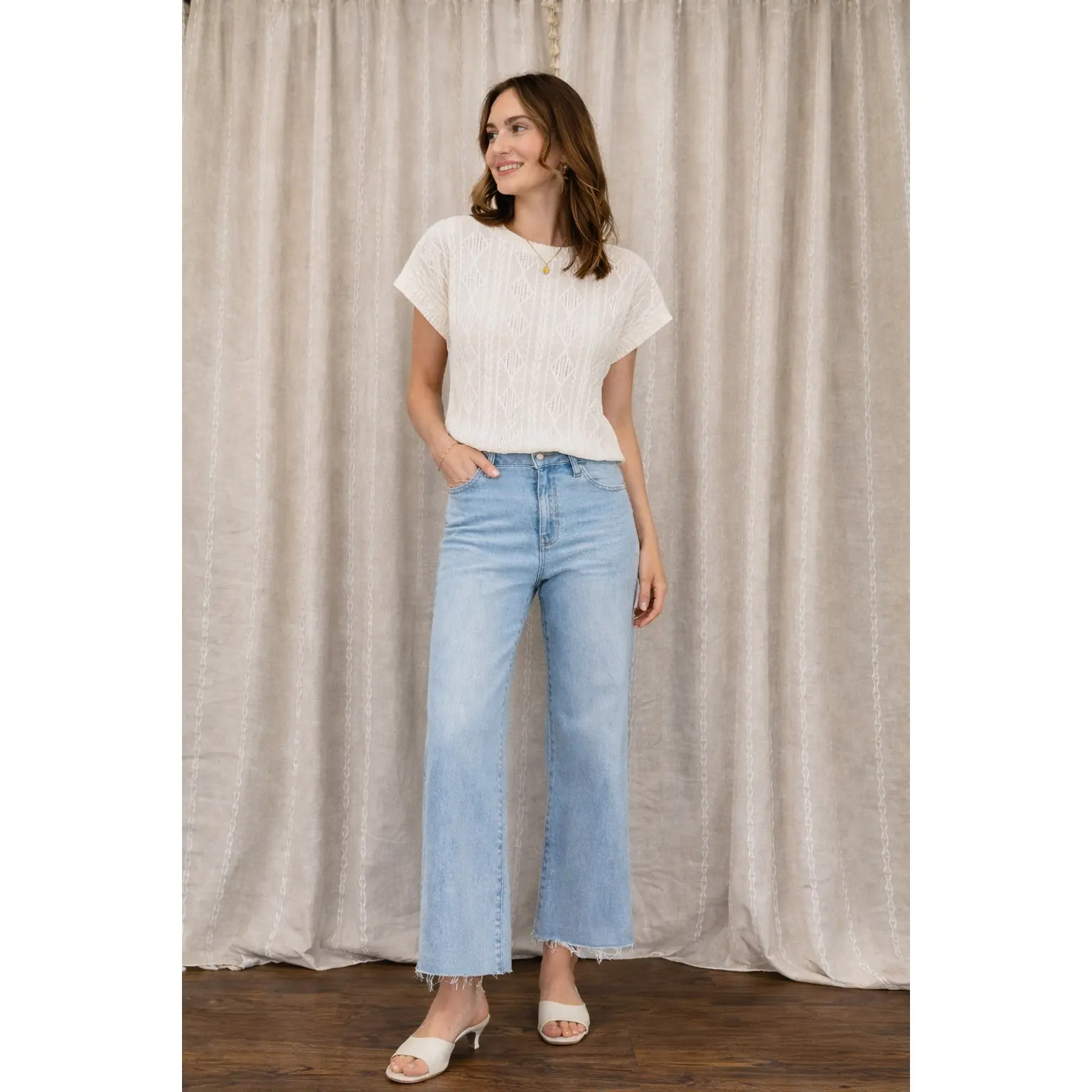 Lightweight, breathable, and effortlessly elevated, this textured knit top is the perfect mix of polished and easy. Designed with a subtle geometric pattern, it adds dimension while still keeping a clean, minimal look.