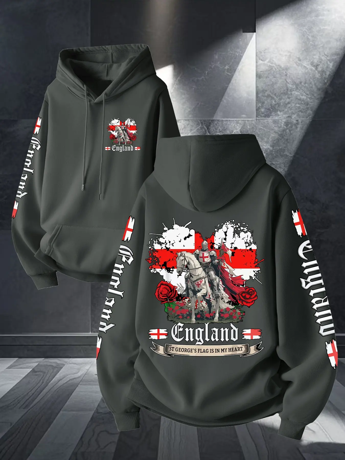 Middle Ages Long Spear Knight England Flag Print Hoodie, Unisex Casual Long Sleeve, Kangaroo Pocket, Fall & Winter Streetwear