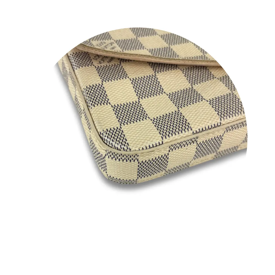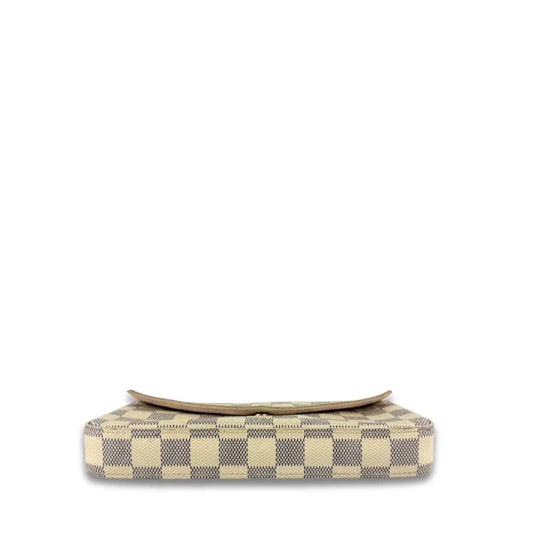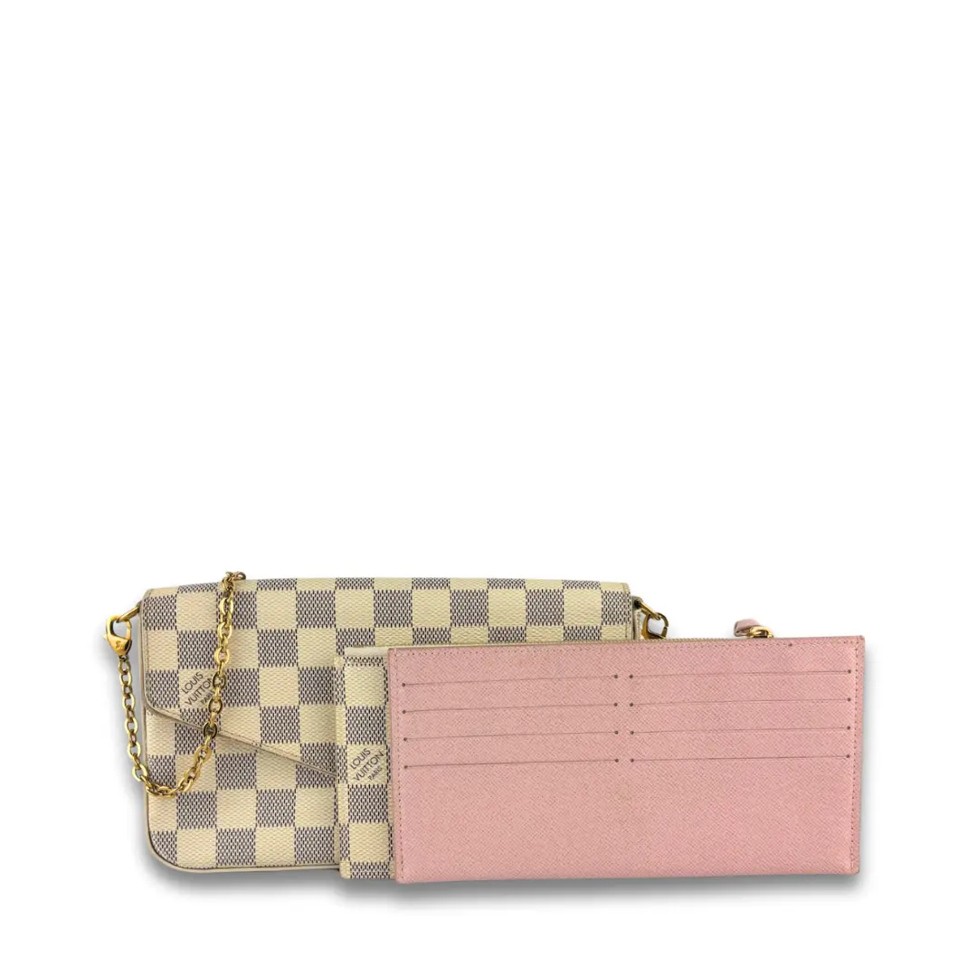 Classic LV Damier Azur coated canvas exterior with gold-tone hardware and ballerine pink canvas interior. Features snap closure, detachable chain strap, interior patch pocket, and 2 included inserts; one zipper pouch and one long card holder that has 8 card slots and one bill compartment. Please note wear throughout as pictured. Includes a certificate of authenticity.Measures 8.25" W x 4.75" H x 1.25" D with a 22" strap drop. Authentic preowned item circa 2018.