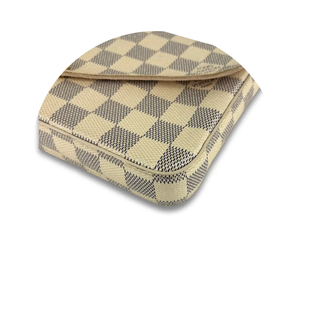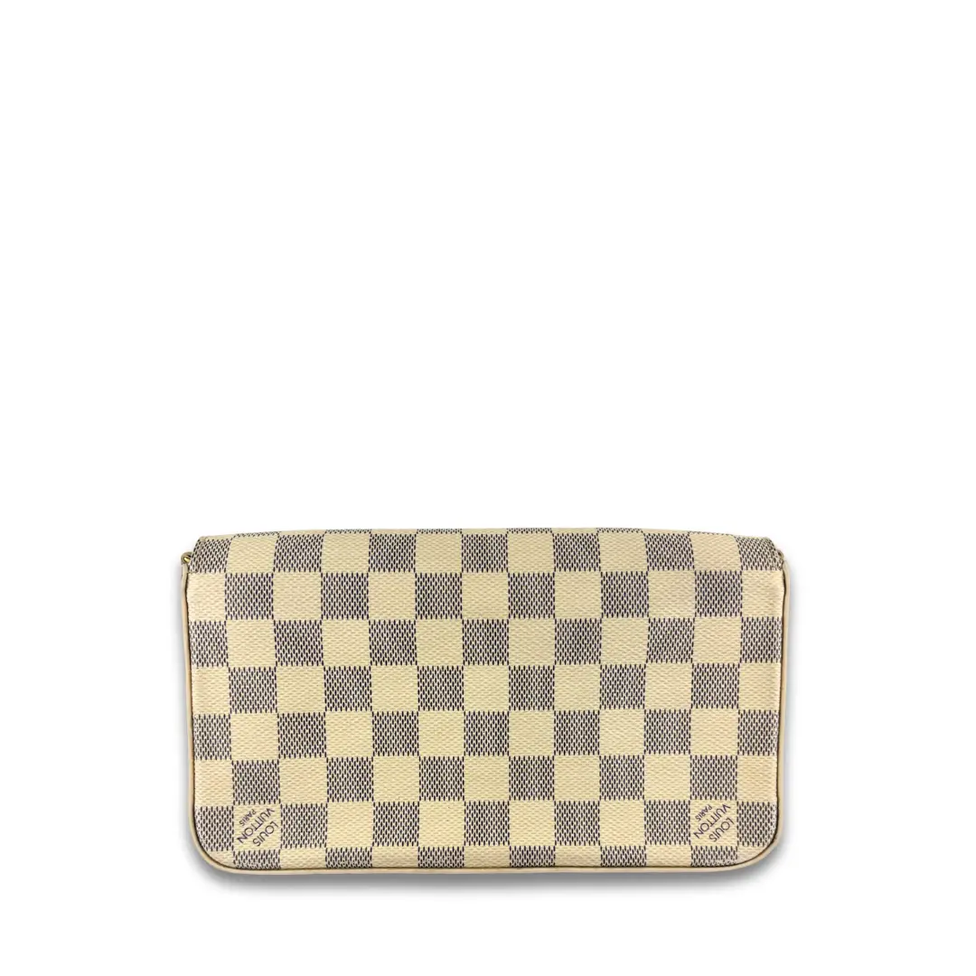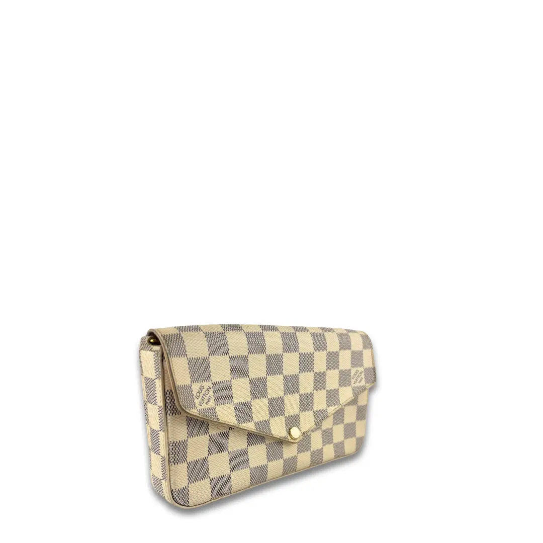 Classic LV Damier Azur coated canvas exterior with gold-tone hardware and ballerine pink canvas interior. Features snap closure, detachable chain strap, interior patch pocket, and 2 included inserts; one zipper pouch and one long card holder that has 8 card slots and one bill compartment. Please note wear throughout as pictured. Includes a certificate of authenticity.Measures 8.25" W x 4.75" H x 1.25" D with a 22" strap drop. Authentic preowned item circa 2018.