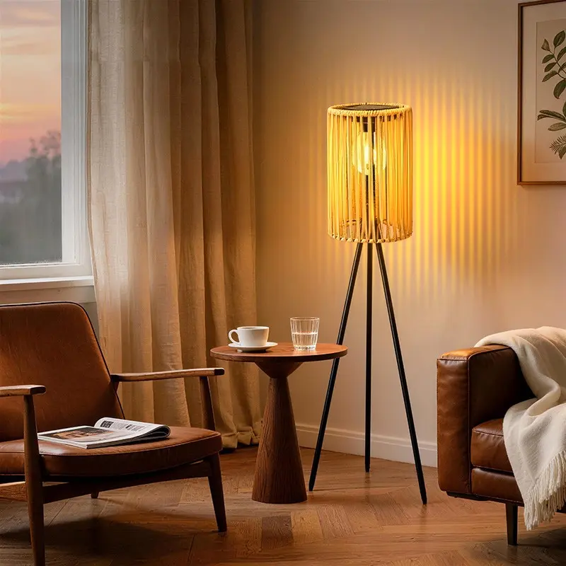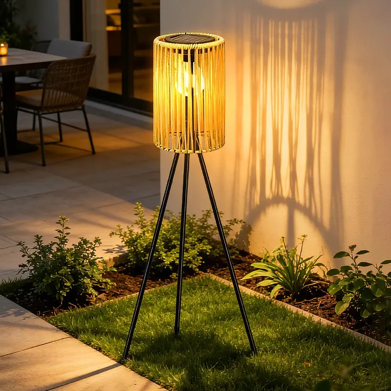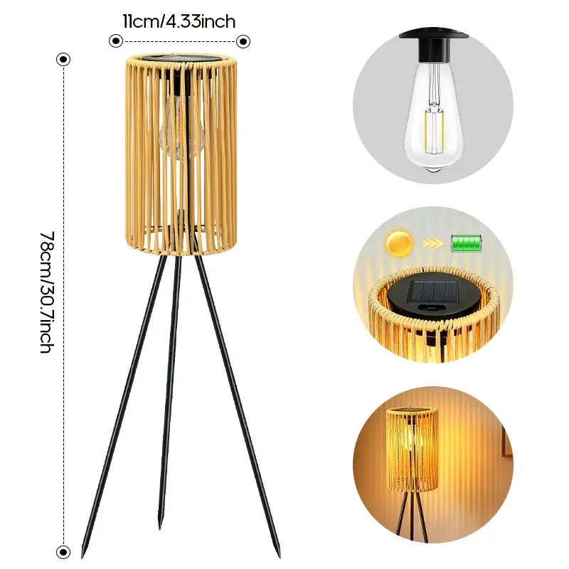 Solar-Powered Outdoor Floor Lamp Handcrafted Wicker Lantern Wrought Iron Tripod Lantern Housewarming Gift Rustic Indoor/Outdoor Decorative Lamp, These Woven Lamps Provide Decorative Lighting for Gardens, Yards, Patios, And Pathways.