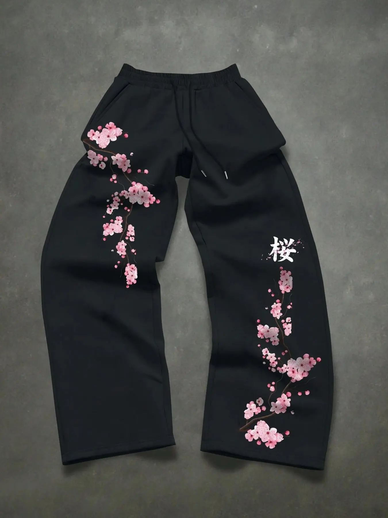 Japanese Streetwear Cherry Blossom Graphic Sweatpants - Oversized Aesthetic Joggers for Men & Women, High Waisted Loose Track Pants for Daily Casual & Street Style Outfits