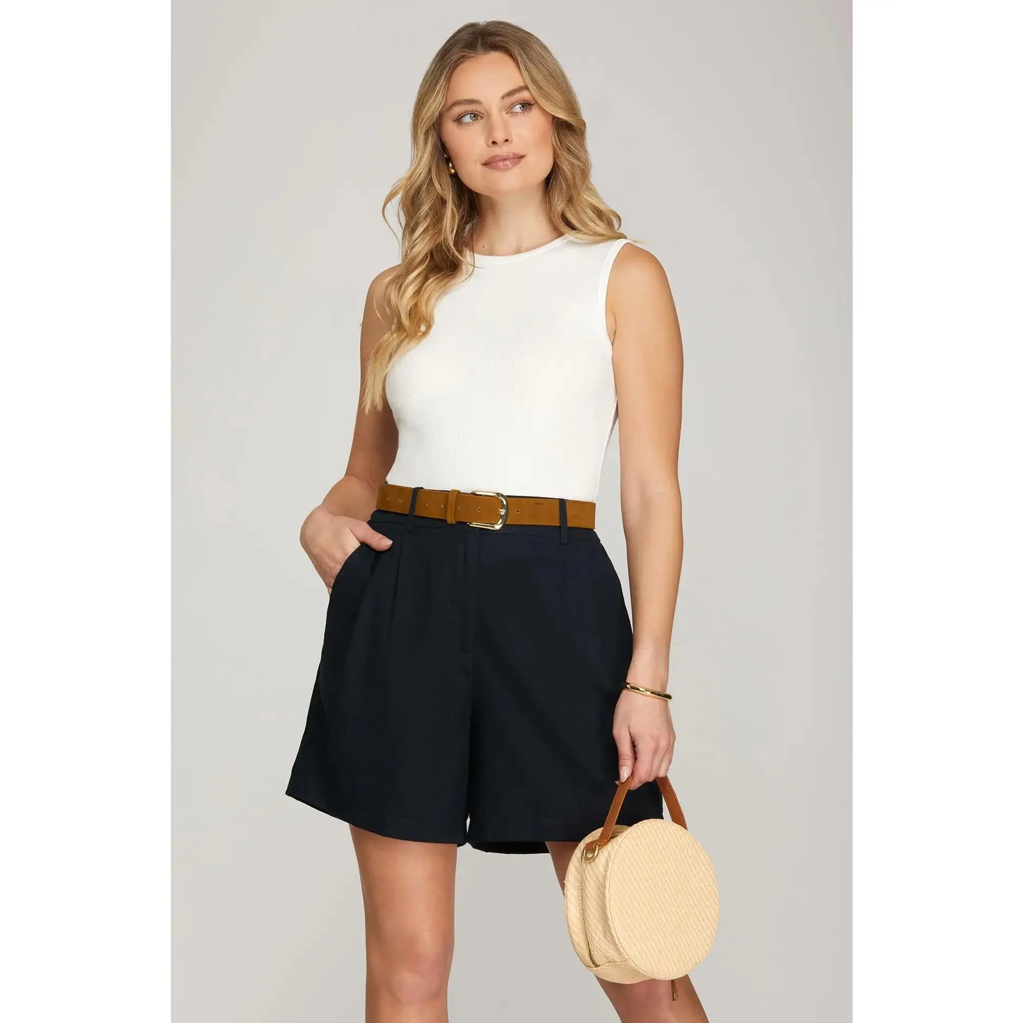 The high-rise fit defines the waist while the relaxed leg keeps them easy to wear all day. Finished with a coordinating belt to complete the look, these shorts are ready to style with minimal effort. Pair them with a fitted tank, blouse, or lightweight sweater for an elevated everyday outfit.