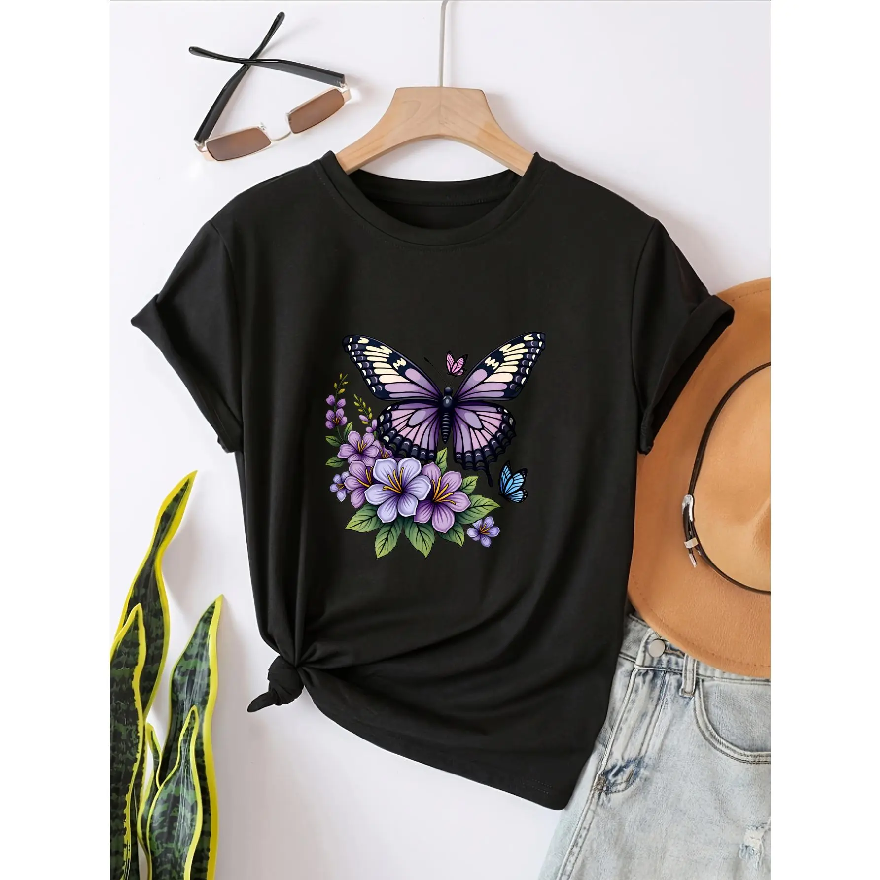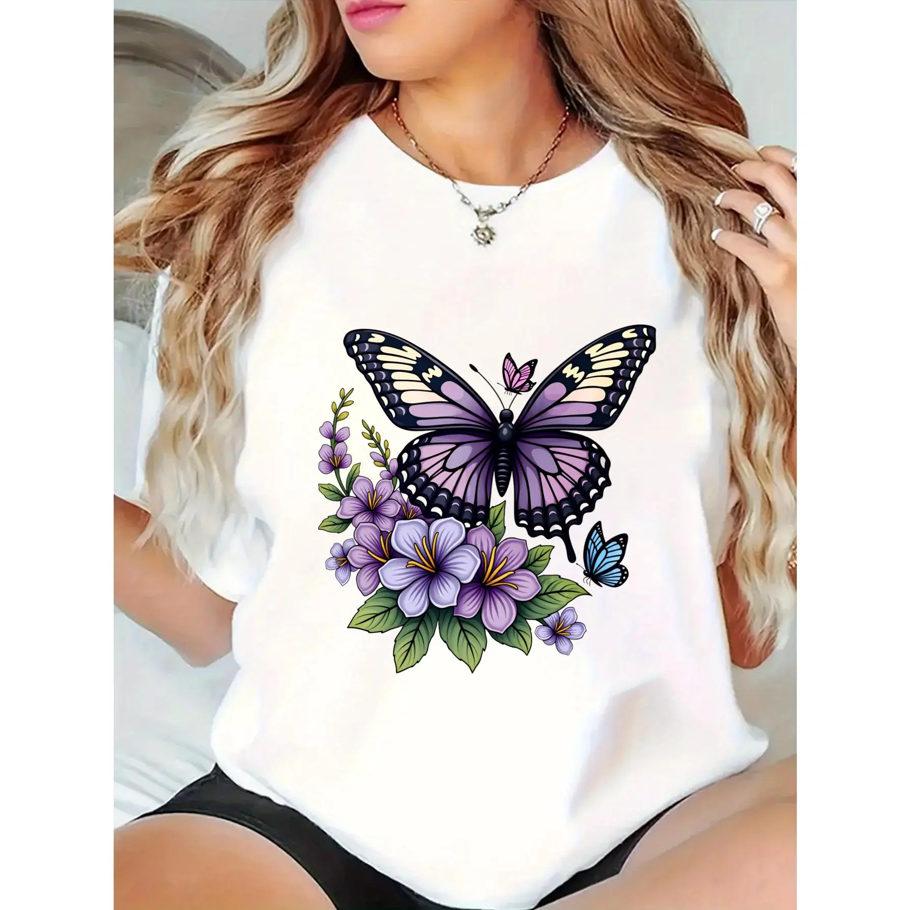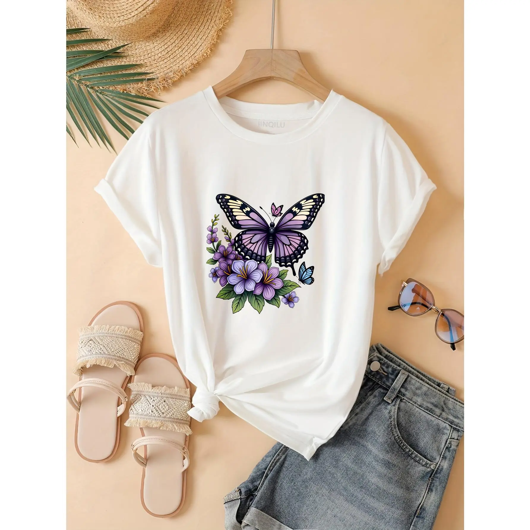 1 PCS Graphic T Shirt for Women Short Sleeve Summer Tops Funny Letter Printed Loose Casual Crew Neck Tees Summer Tops Butterfly Floral Design With Purple Flowers Womens Summer Short Sleeve Shirts Beach Vacation Cutton