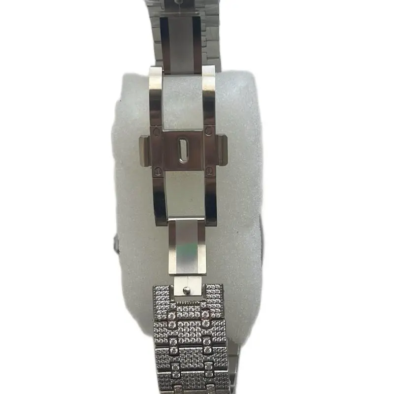 Full Iced quality wrist watch automatic waterproof bling bling diamond style watch round face design with Arabic numerals.