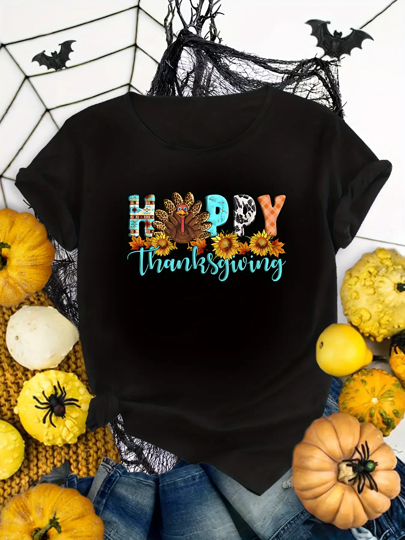 Happy Thanksgiving Graphic T-Shirt for Adults - Autumn Leaves Turkey Pumpkins Design, Soft Stretch Round Neck Casual Tee, Machine Washable Holiday Apparel, Thanksgiving T Shirts, Festive Top, Festive Design, Nontransparent Fabric