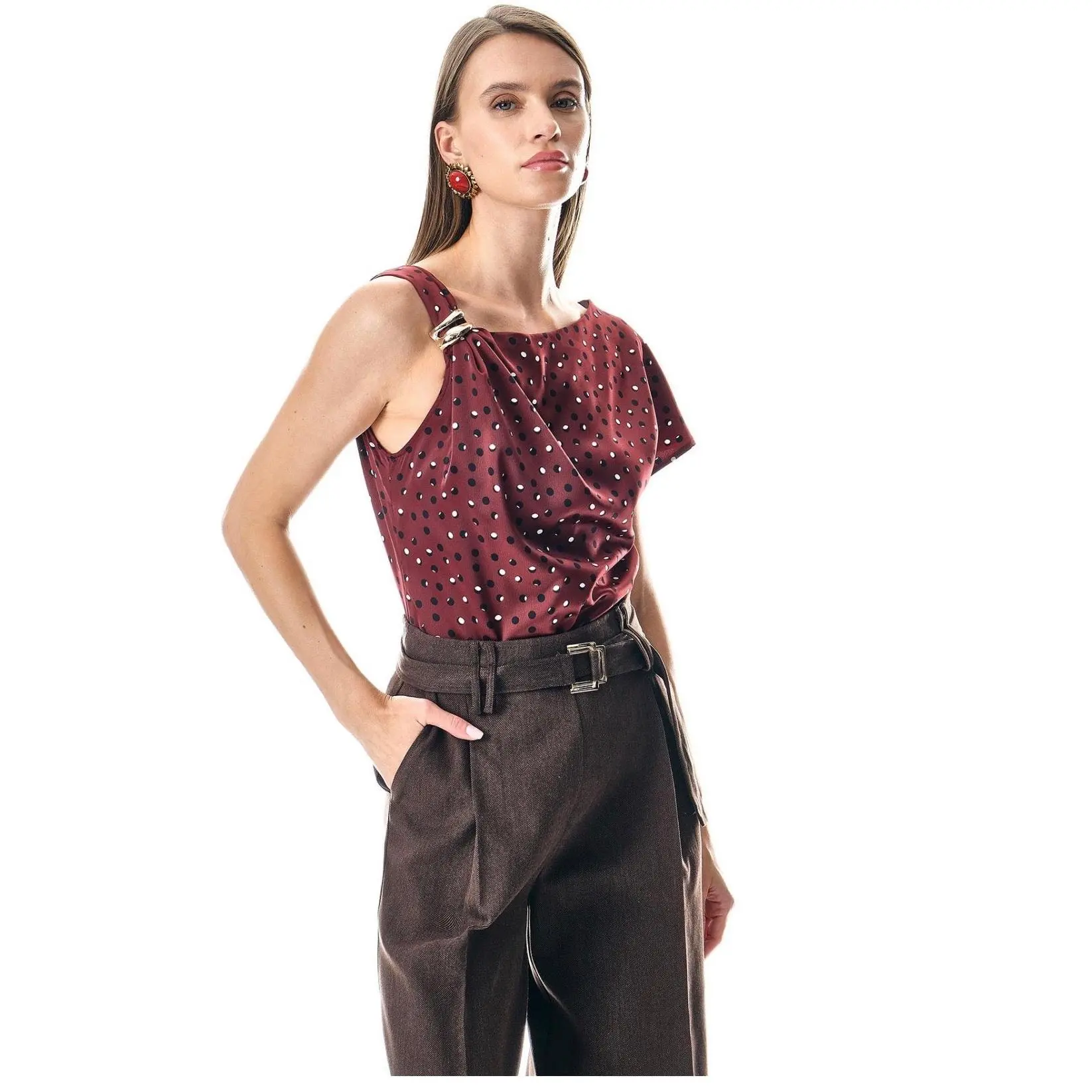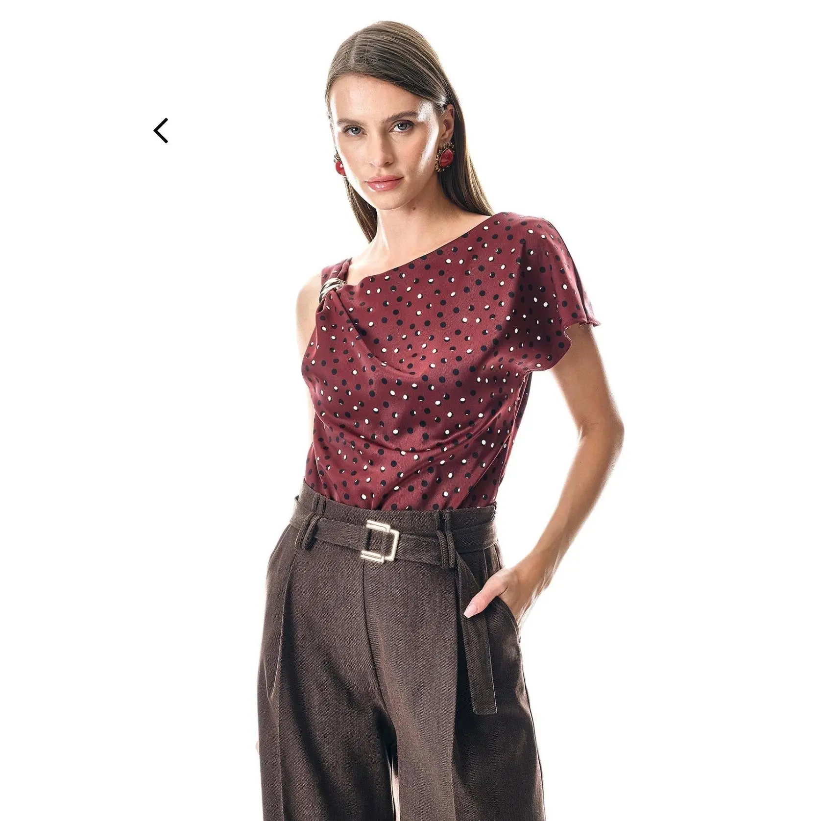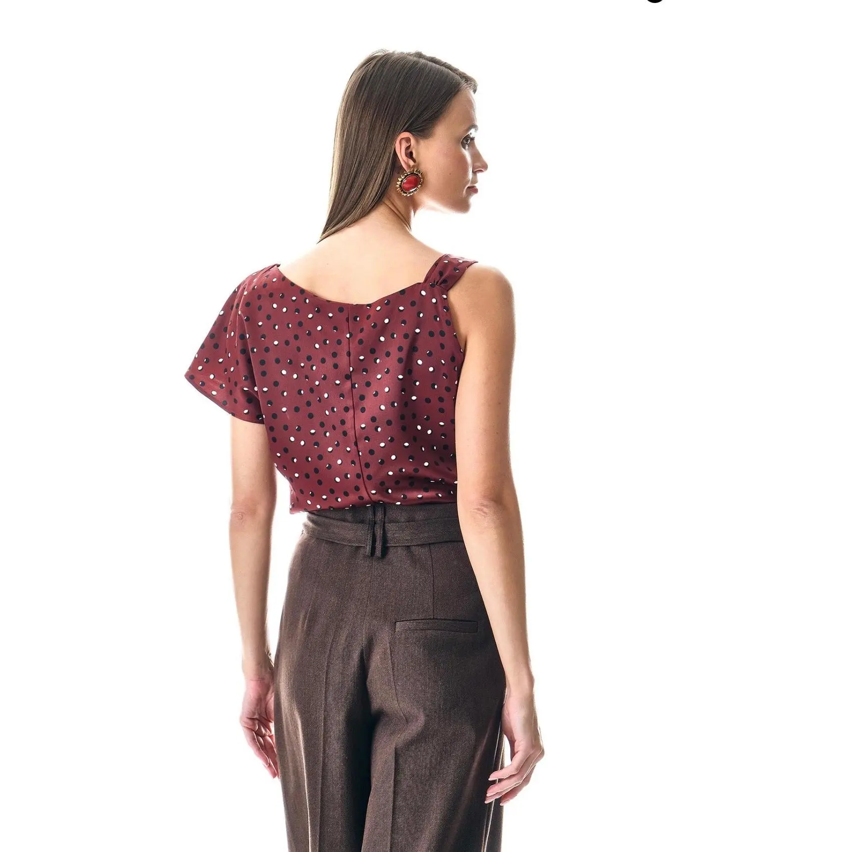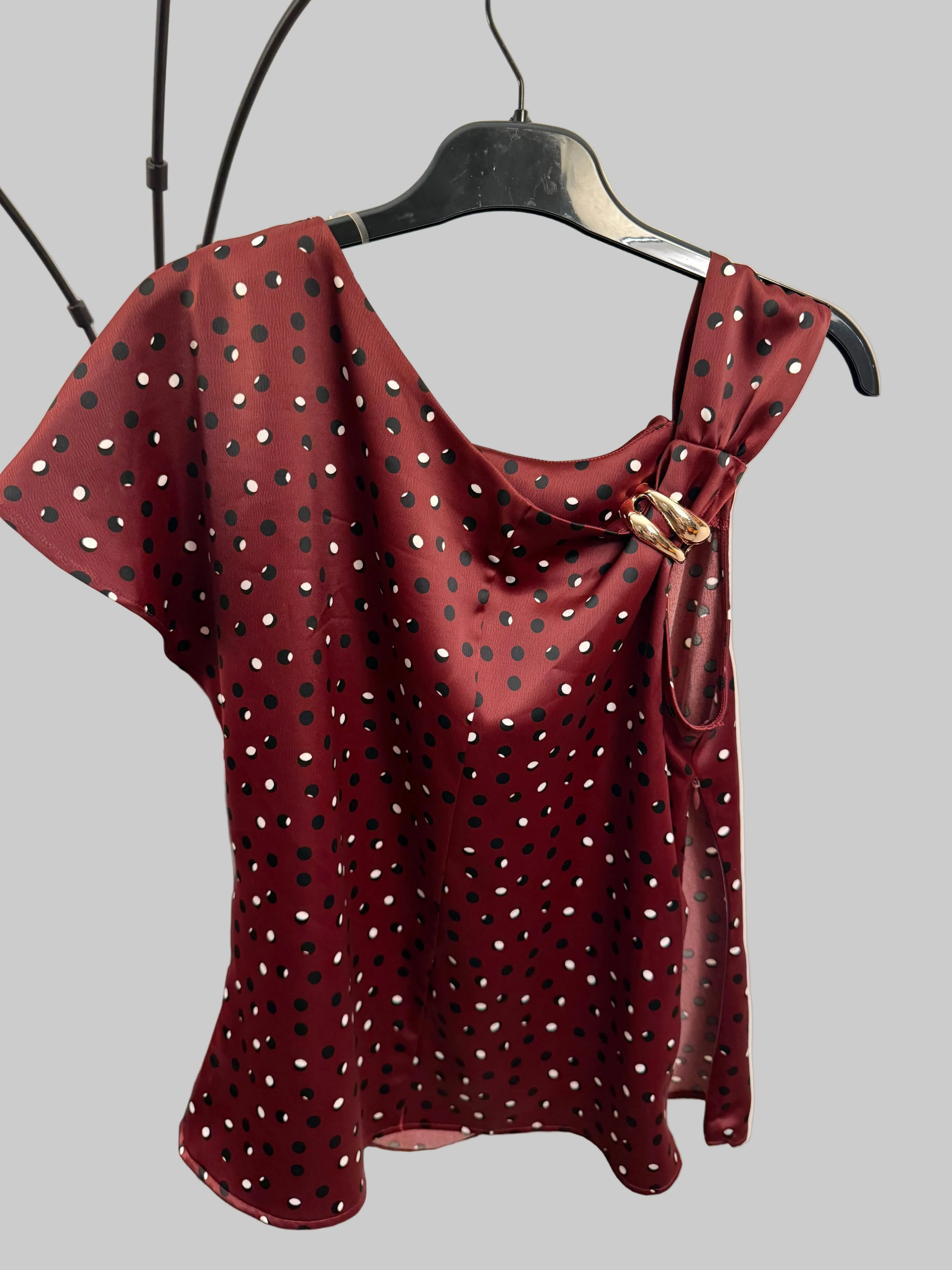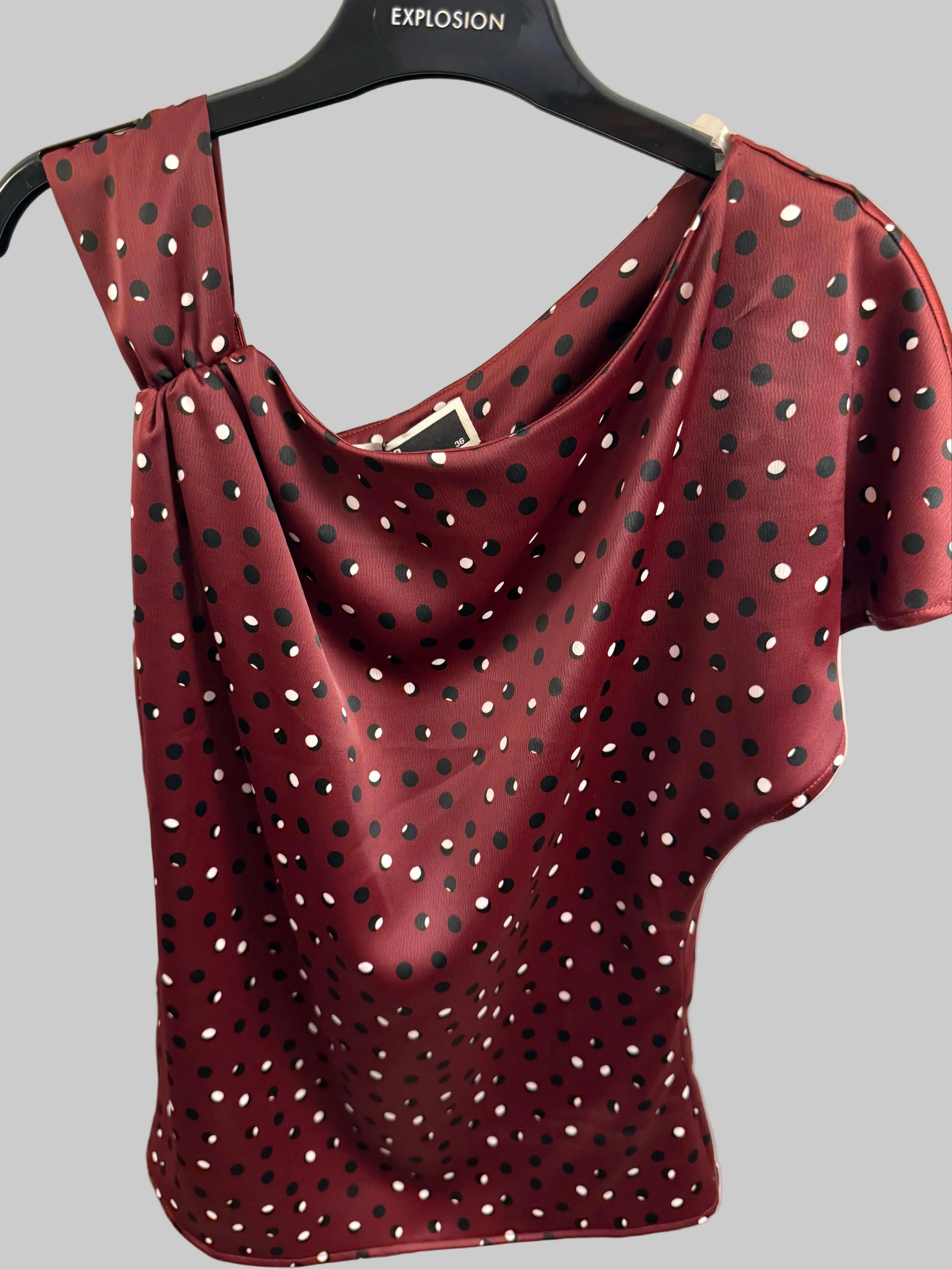 Make a bold statement with this stunning one-shoulder blouse, designed for the woman who loves contemporary silhouettes with a timeless twist. This piece combines a rich, deep burgundy hue with a playful multi-colored polka dot pattern, creating a look that is both sophisticated and high-energy.