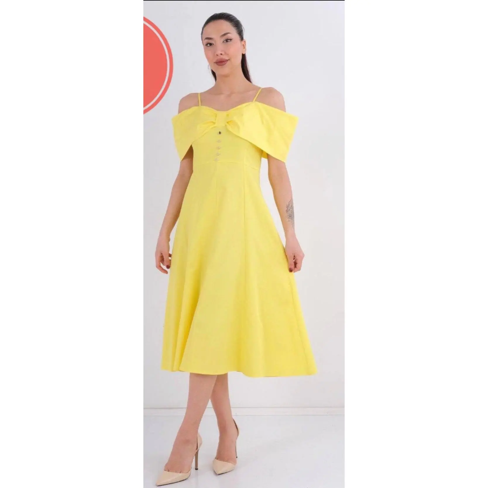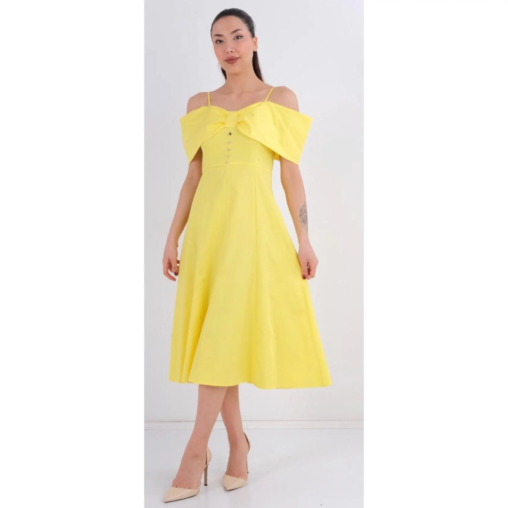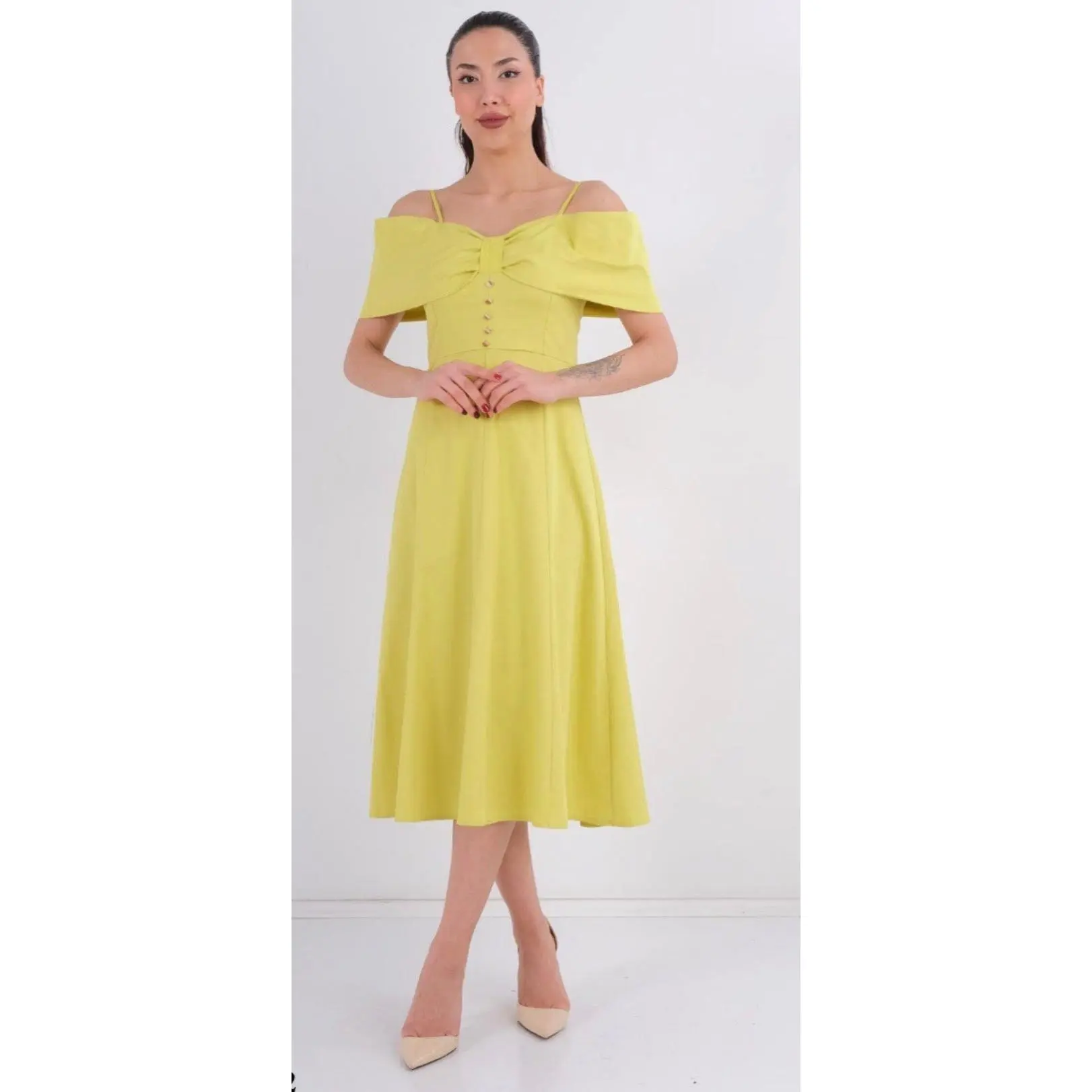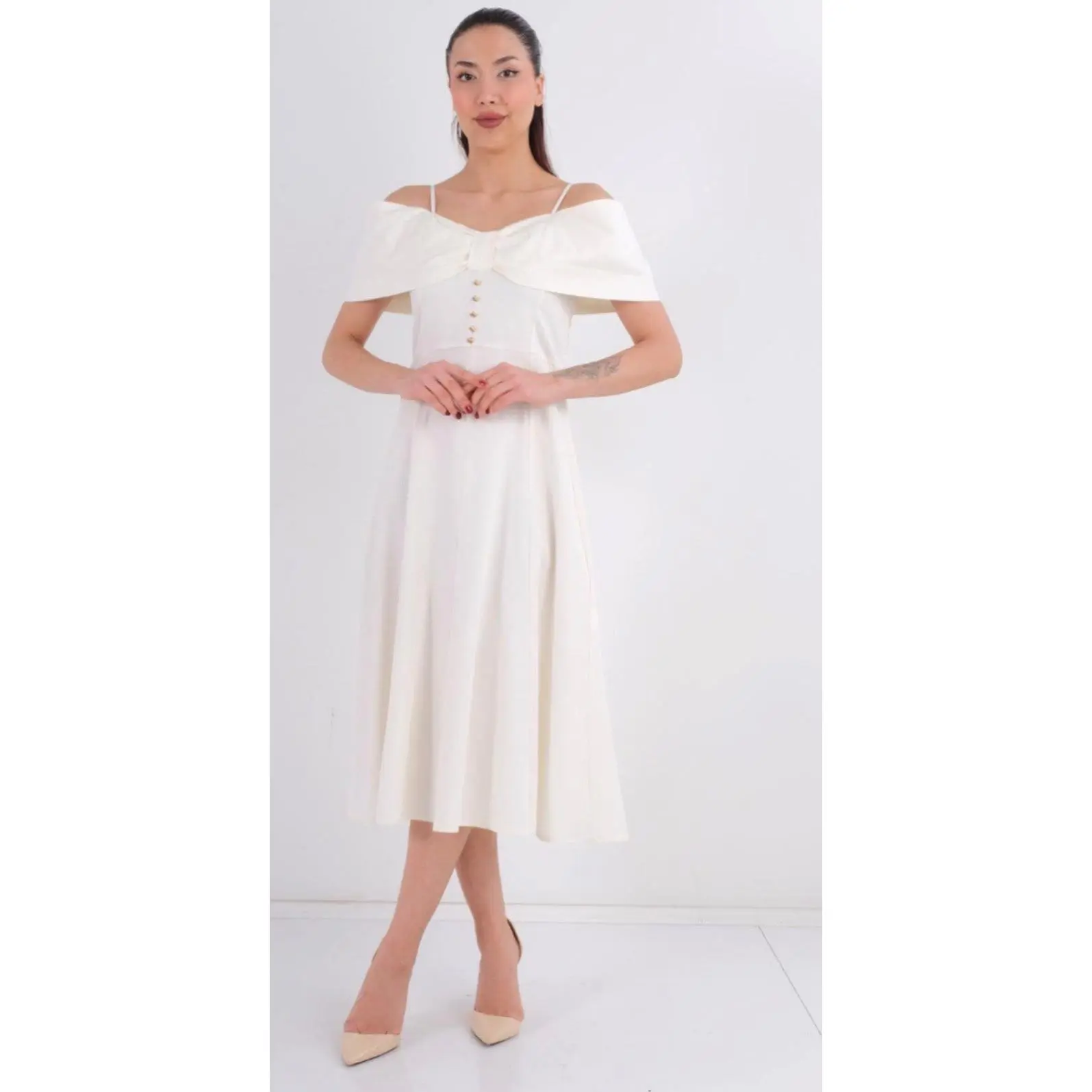 This refined off-shoulder midi dress features a soft, flowing silhouette with delicate shoulder straps and a structured bodice accented by decorative buttons. Designed to flatter the waist and drape beautifully, it offers effortless elegance for weddings, brunches, bridal events, or special occasions. A timeless piece that blends classic charm with modern femininity.
