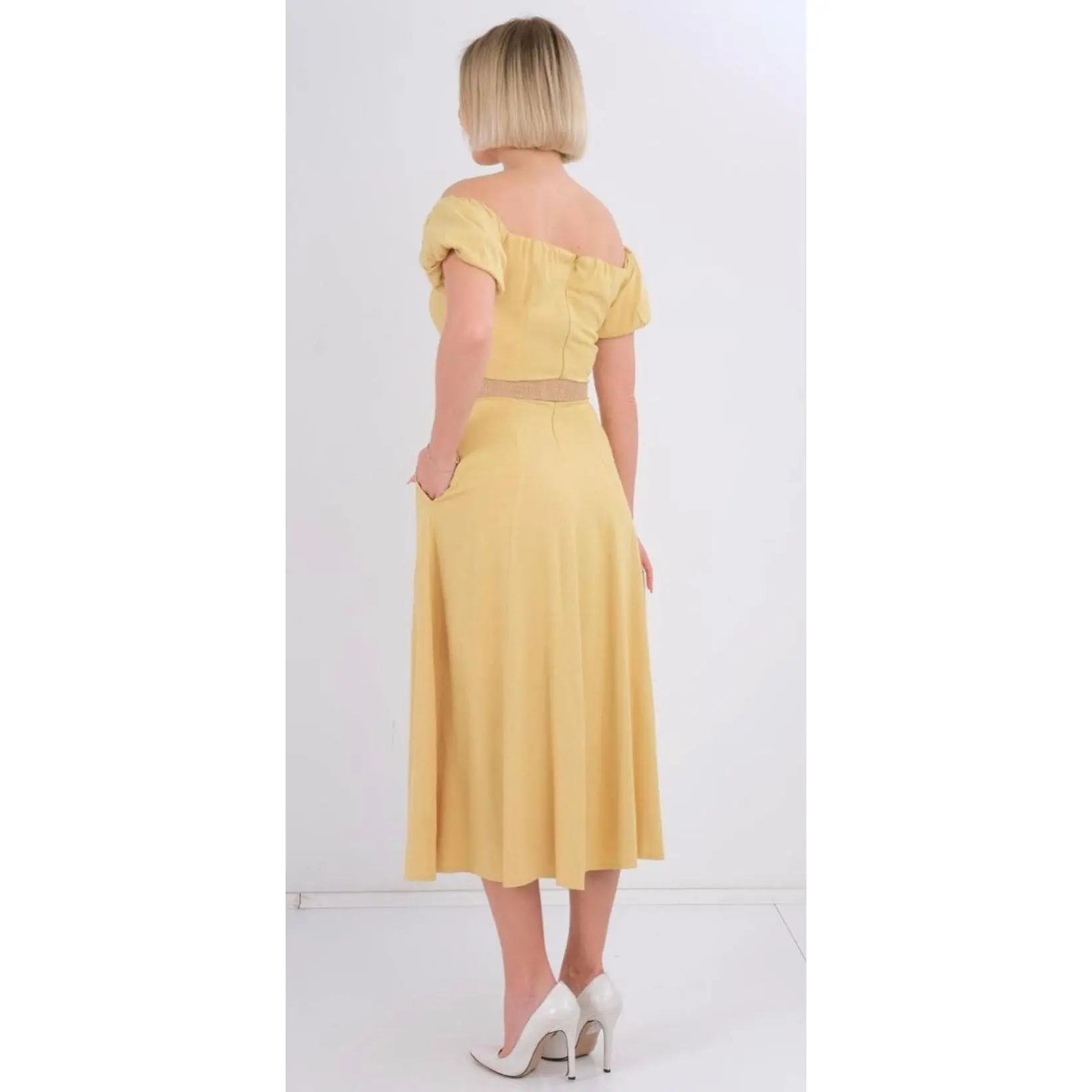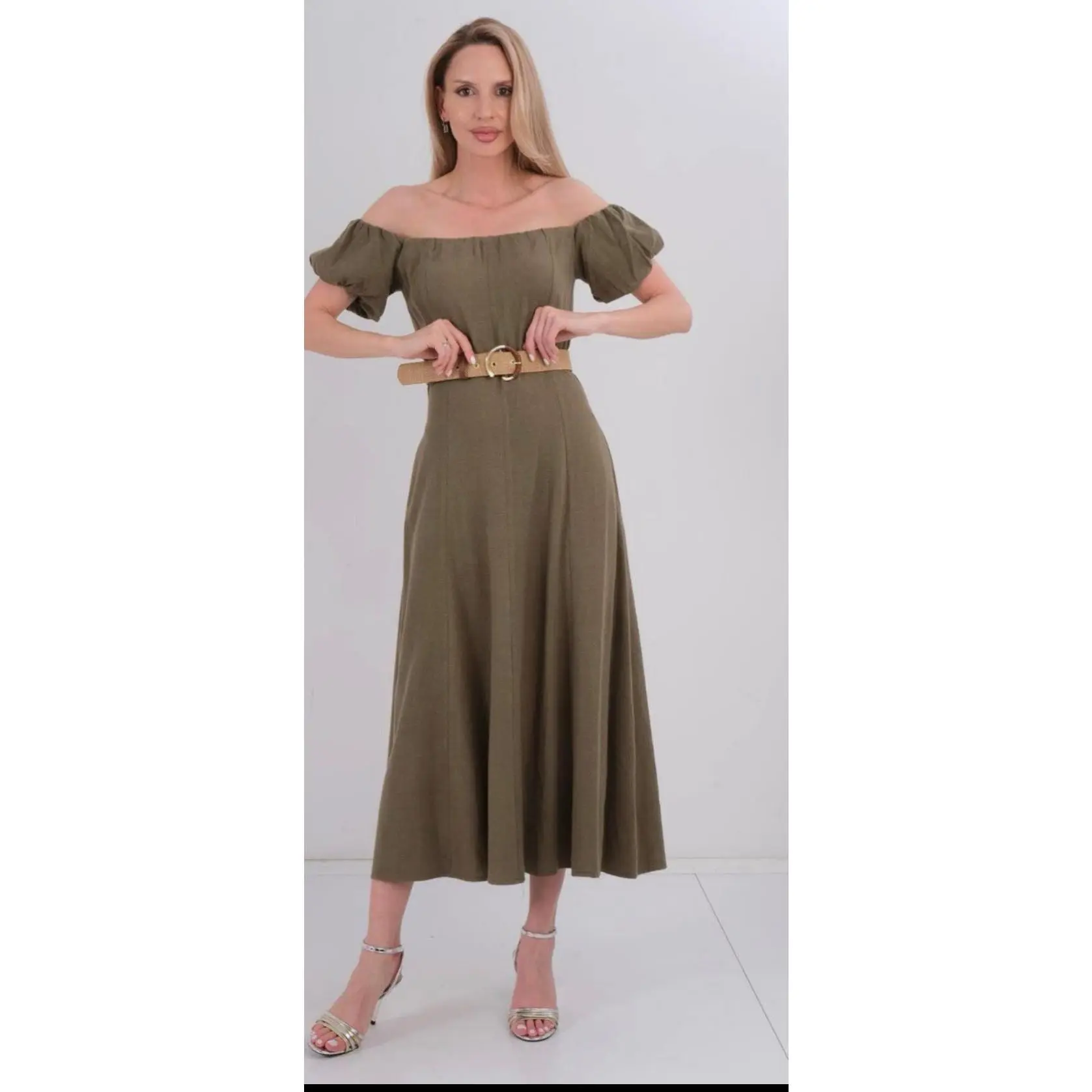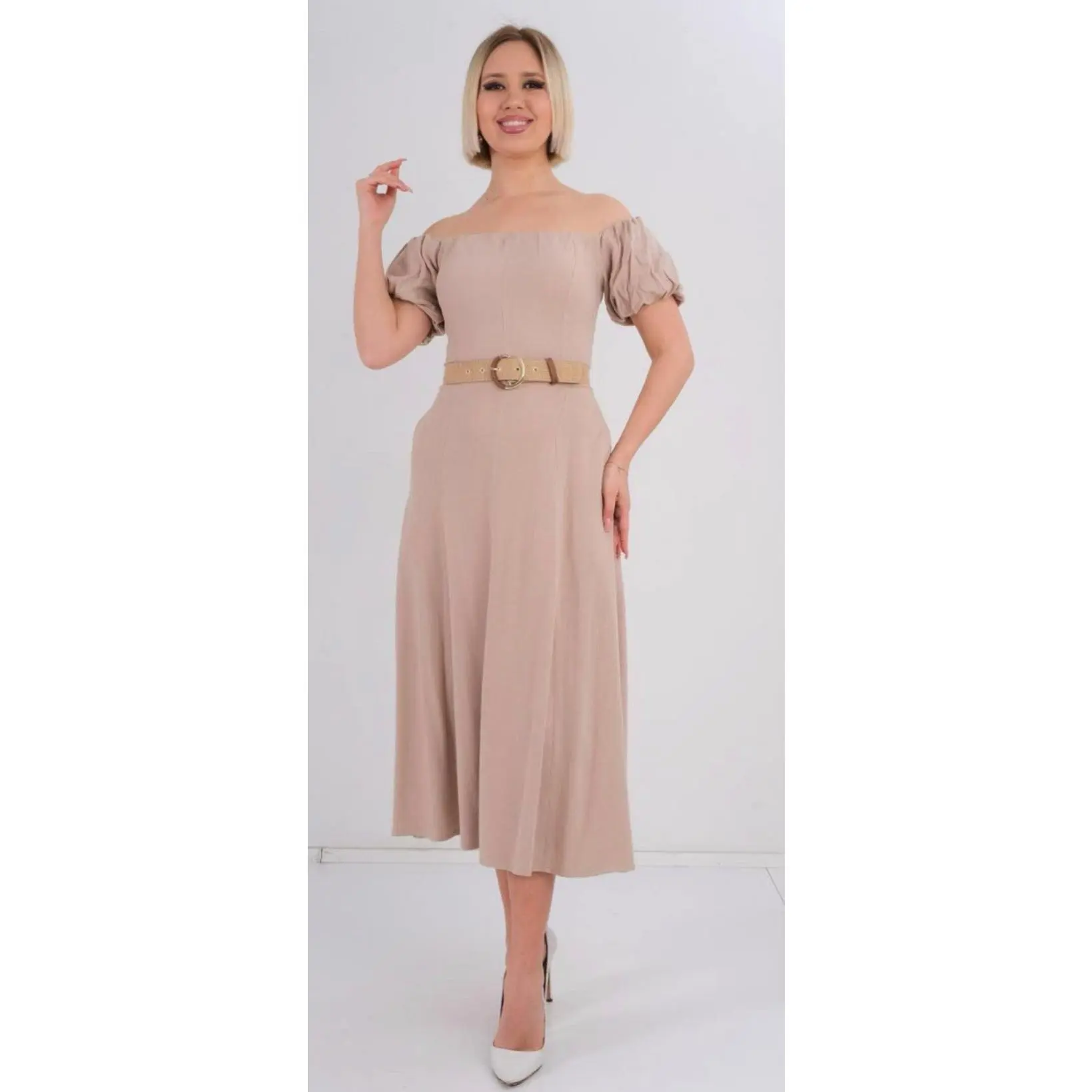 This chic off-shoulder dress features soft short sleeves, a flattering cinched waist, and a removable statement belt for a polished finish. Designed with a flowing silhouette and lightweight fabric, it’s perfect for brunch, summer outings, vacations, and casual elegance with a refined touch. Only available in White.