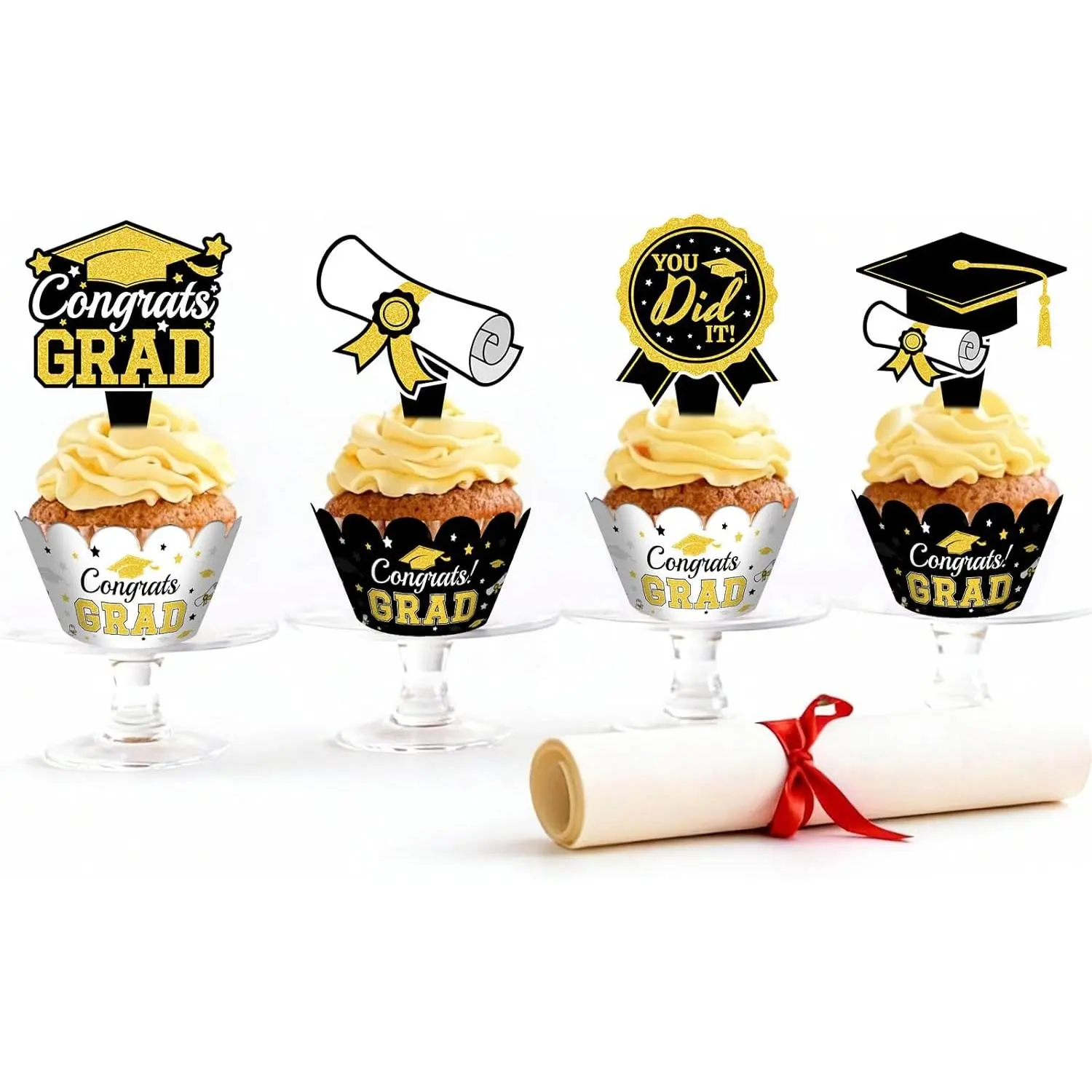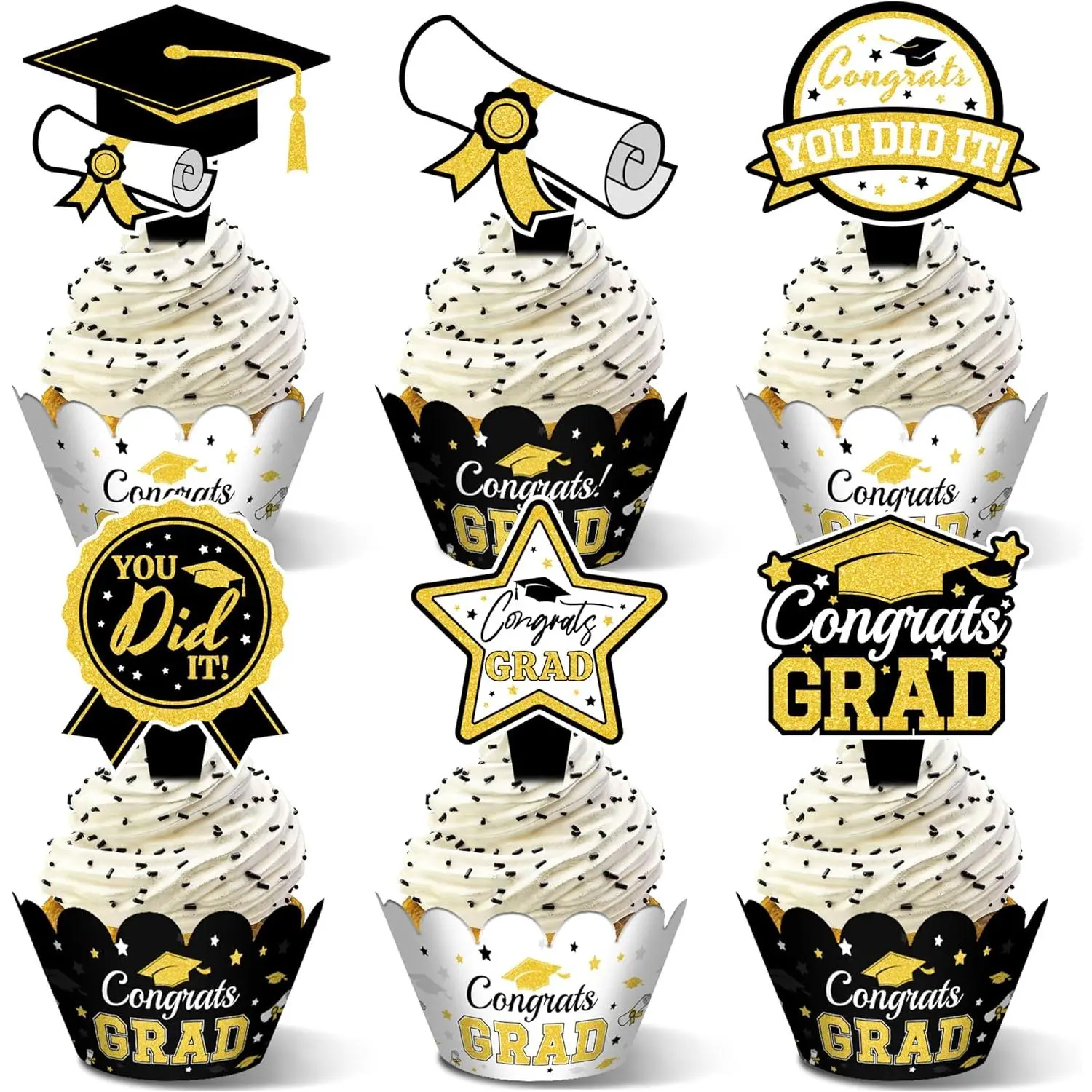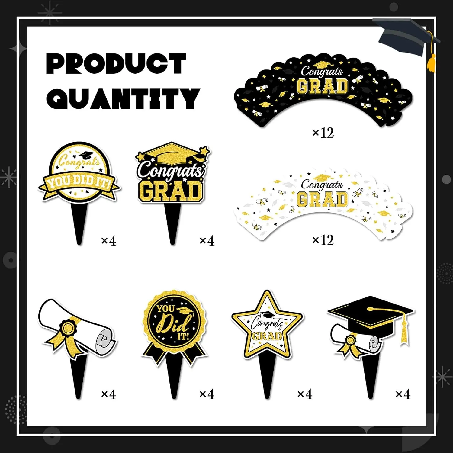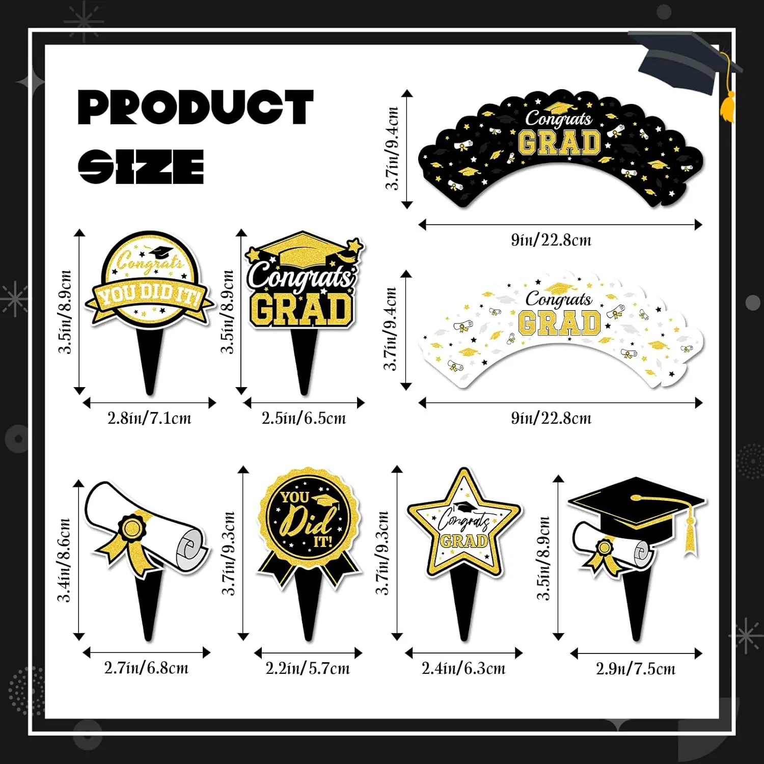 Get everything you need in one convenient package!This set includes 48 pieces of 2026 graduation-themed cupcake toppers and wrappers-24 adorable wrappers in cheerful colors, plus 24 matching toppers featuring 6 unique designs.Perfect for creating a stunning cupcake tower display at any graduation celebration.Bright, vibrant prints featuring classic graduation symbols like caps, diplomas make these decorations truly pop.Your dessert table will stand out with these charming and festive cupcake accents.Made from sturdy, food-safe cardstock with a glossy finish, these toppers and wrappers are both safe and reusable.Each wrapper measures approx.3.6" top diameter x 2.2" bottom diameter x 2.4" heightpicks are 3.6" including stick.Note: Wrappers are for decoration only and are not oven-safe.Wrappers come flat for easy storage and quick assembly-simply slide the tab into one of three size slots for a custom fit.They hold shape securely and work perfectly with standard cupcakes.The included toppers add the final standout touch.Perfect for decorating graduation cupcakes, desserts, appetizers, or candy displays. Ideal for graduation buffets, class parties, school reunions, and student gatherings. Leave a lasting impression on your guests with these festive and fun decorations!