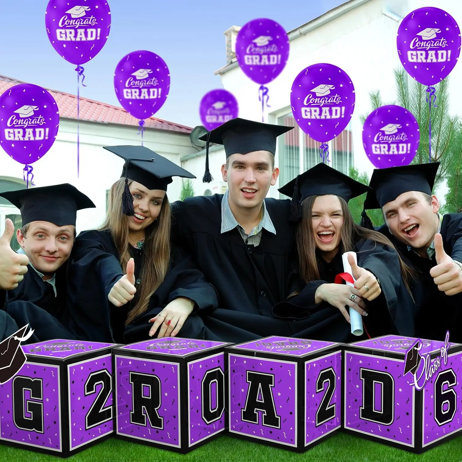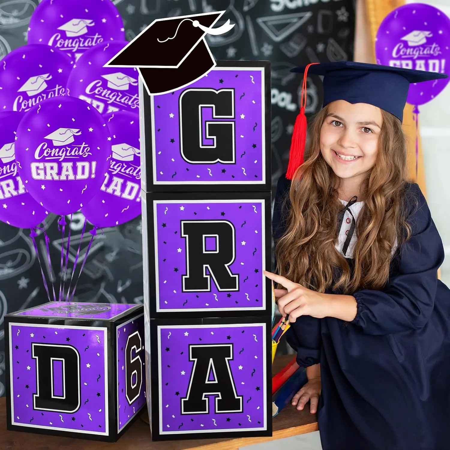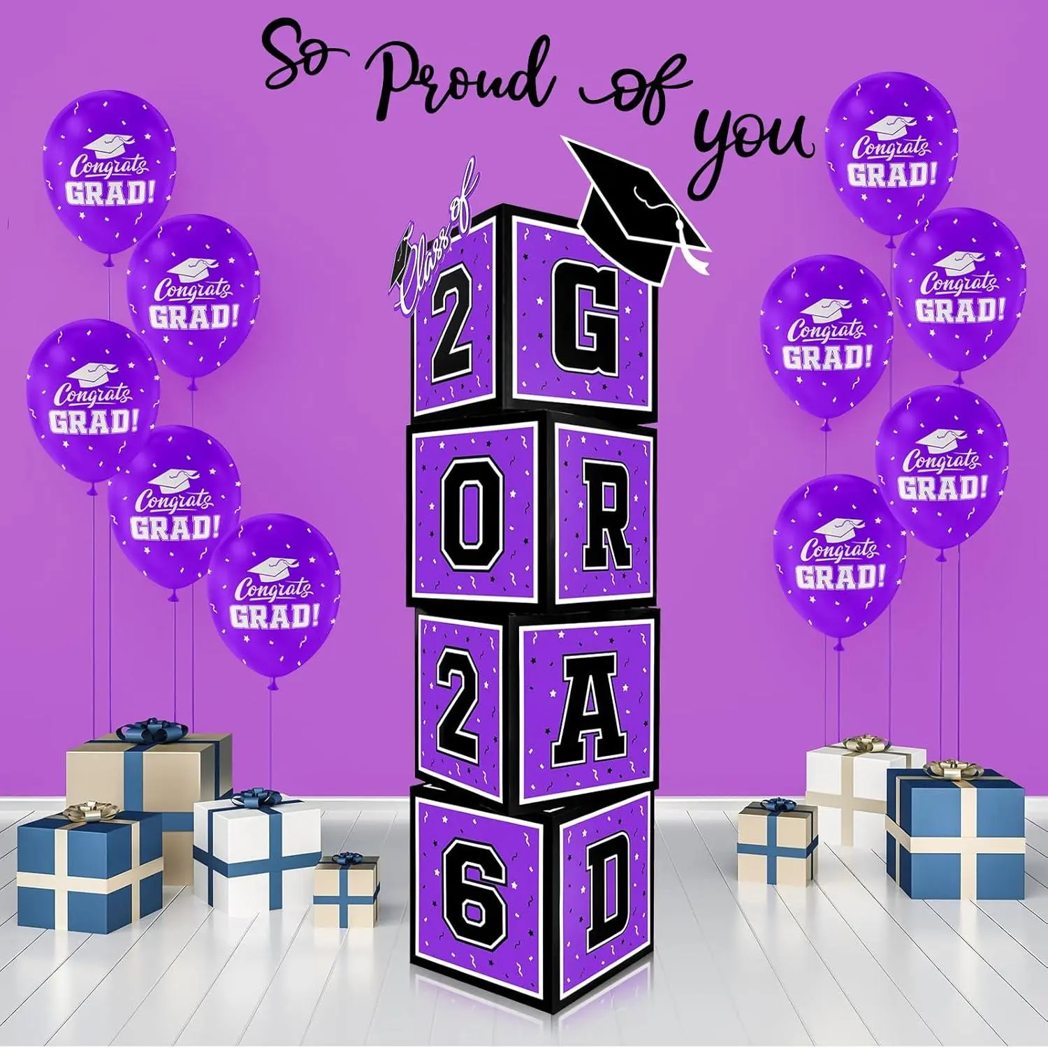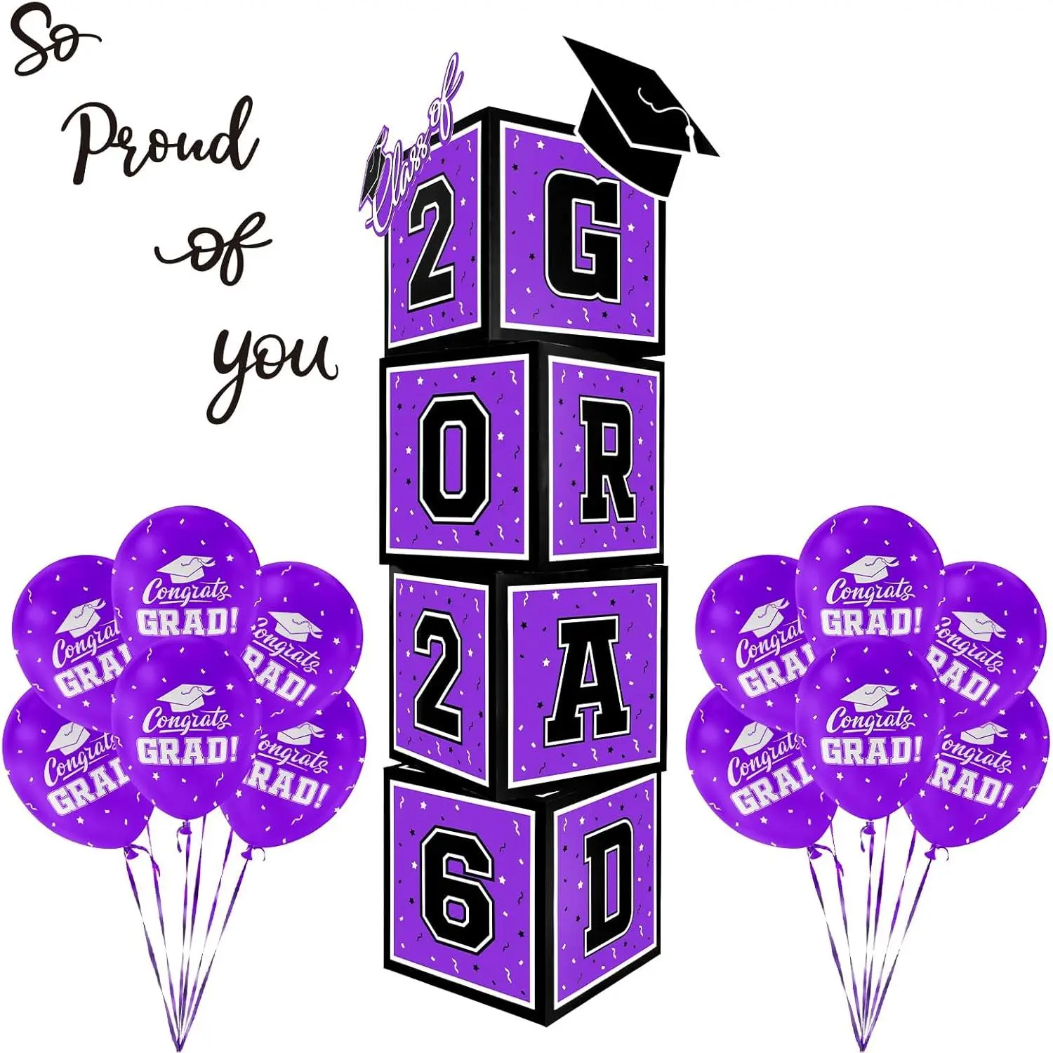 Celebrate the Class of 2026 with our vibrant 4-piece graduation boxes, measuring 11.8 inches and featuring bold black letters stating "GRAD"and "2026" pair these with our included classic graduation cap decorations and 12 count 12-inch purple Congrats Grad latex balloons for an unforgettable commencement celebration.Ensure a memorable graduation party with these eye-catching decorations!The setup is a breeze for your 2026 graduation bash with our pre-folded party boxes.Follow our simple picture instructions to bring your decorations to life in no time.Complement the scene with a burst of color by adding the enclosed radiant purple balloons for a festive atmosphere celebrating the achievements of the 2026 graduates!Make an impression with a stunning graduation centerpiece!Pair our purple Congrats Grad Balloons with the bold statement boxes for a striking display.Hosting a high school, college, nursing, or doctorate graduation party?These decorations will dazzle your guests and shine a spotlight on the graduate's milestone.Gift your exceptional graduate something to remember with our 2026-themed graduation decoration kit.Boxs decoration paired with the spirited "Congrats Grad" purple balloons will elicit joy and make any grad gift basket truly stand out.With these thoughtful details, you're set to create a heartfelt and memorable graduation party.Looking to host a captivating graduation celebration? Not only will these stunning decorations impress your guests, but they will also celebrate the graduate in high style, marking an unforgettable leap into their bright future.