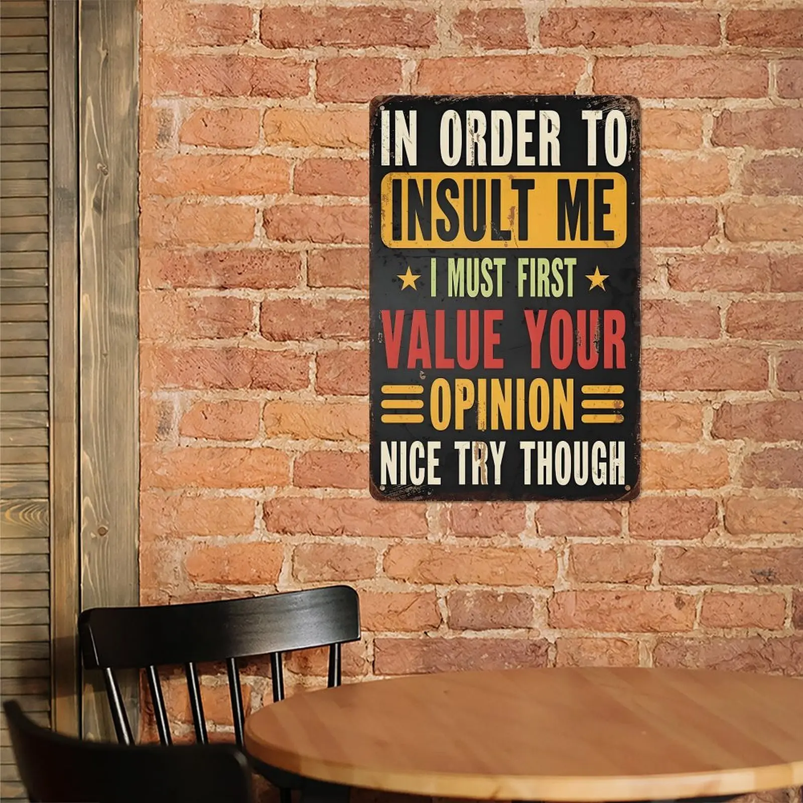 Funny "In Order To Insult Me I Must First Value Your Opinion" Vintage Metal Tin Sign, 8"×12" Sarcastic Wall Decor, Perfect for Man Cave, Garage, Bar, Gift for FriendsFunny "In Order To Insult Me I Must First Value Your Opinion" Vintage Metal Tin Sign, 8"×12" Sarcastic Wall Decor, Perfect for Man Cave, Garage, Bar, Gift for Friends