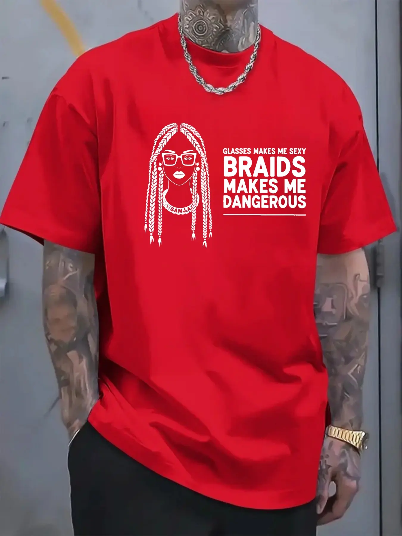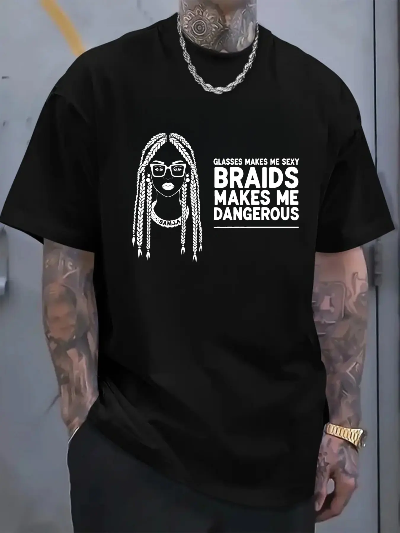 Men's T-shirt printed pattern GLASSES BRAIDS Girls text glasses make ME SEXY Braids make ME DANGEROUS Casual street trend outfit