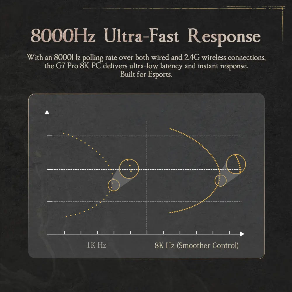With an 8000Hz polling rate over both wired and 2.4G wireless connections, the G7 Pro 8K PC delivers smoother control and instant response, ensuring every input is registered with esports-grade precision.