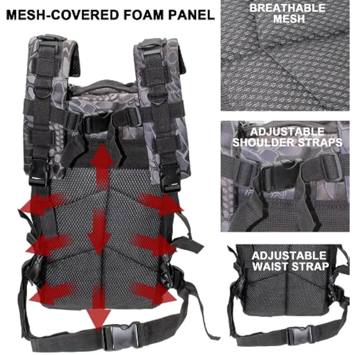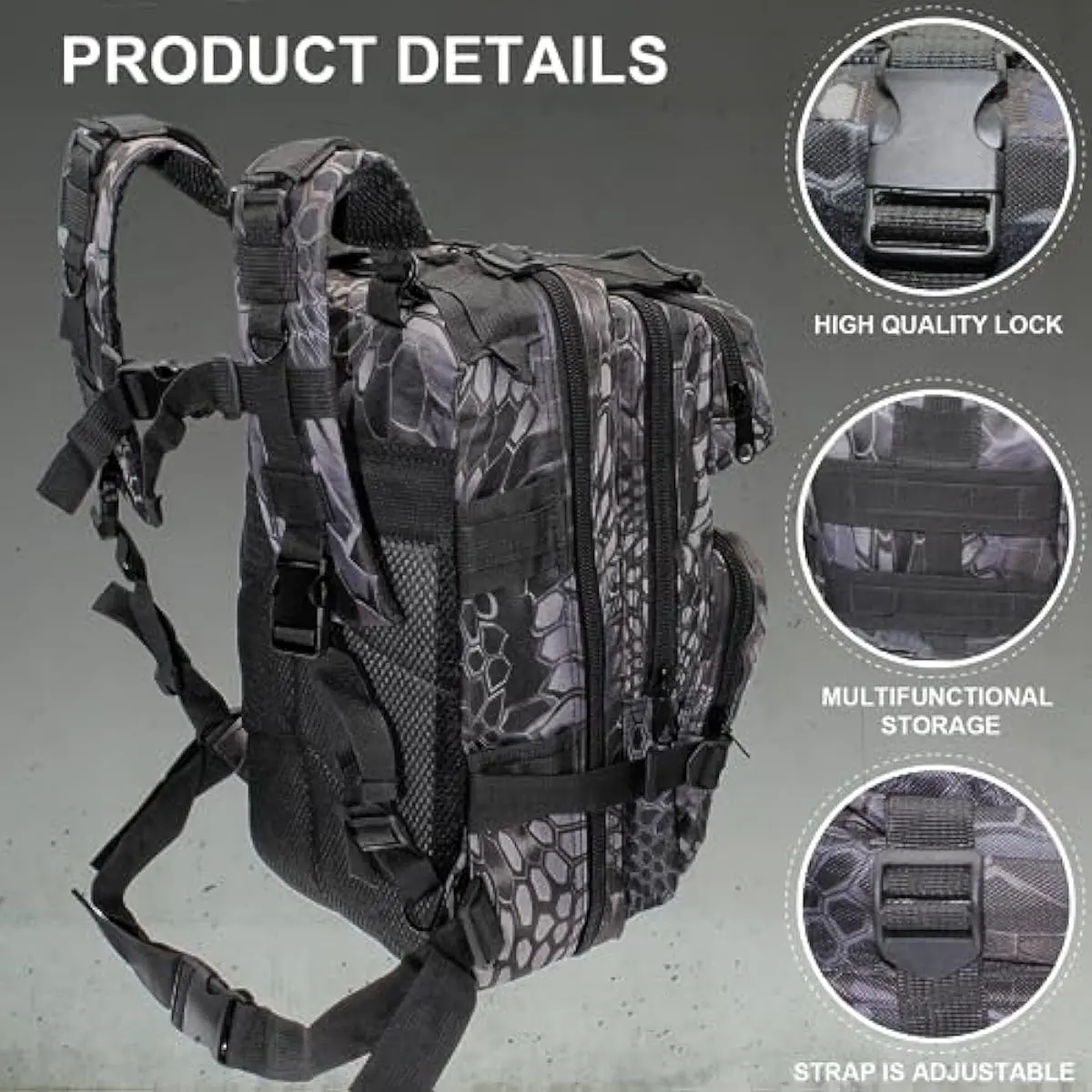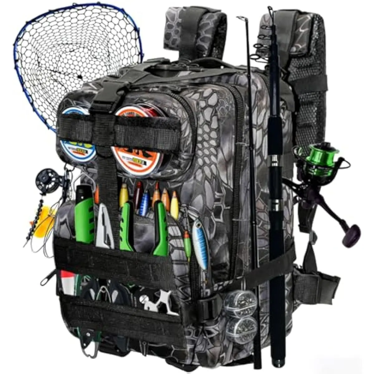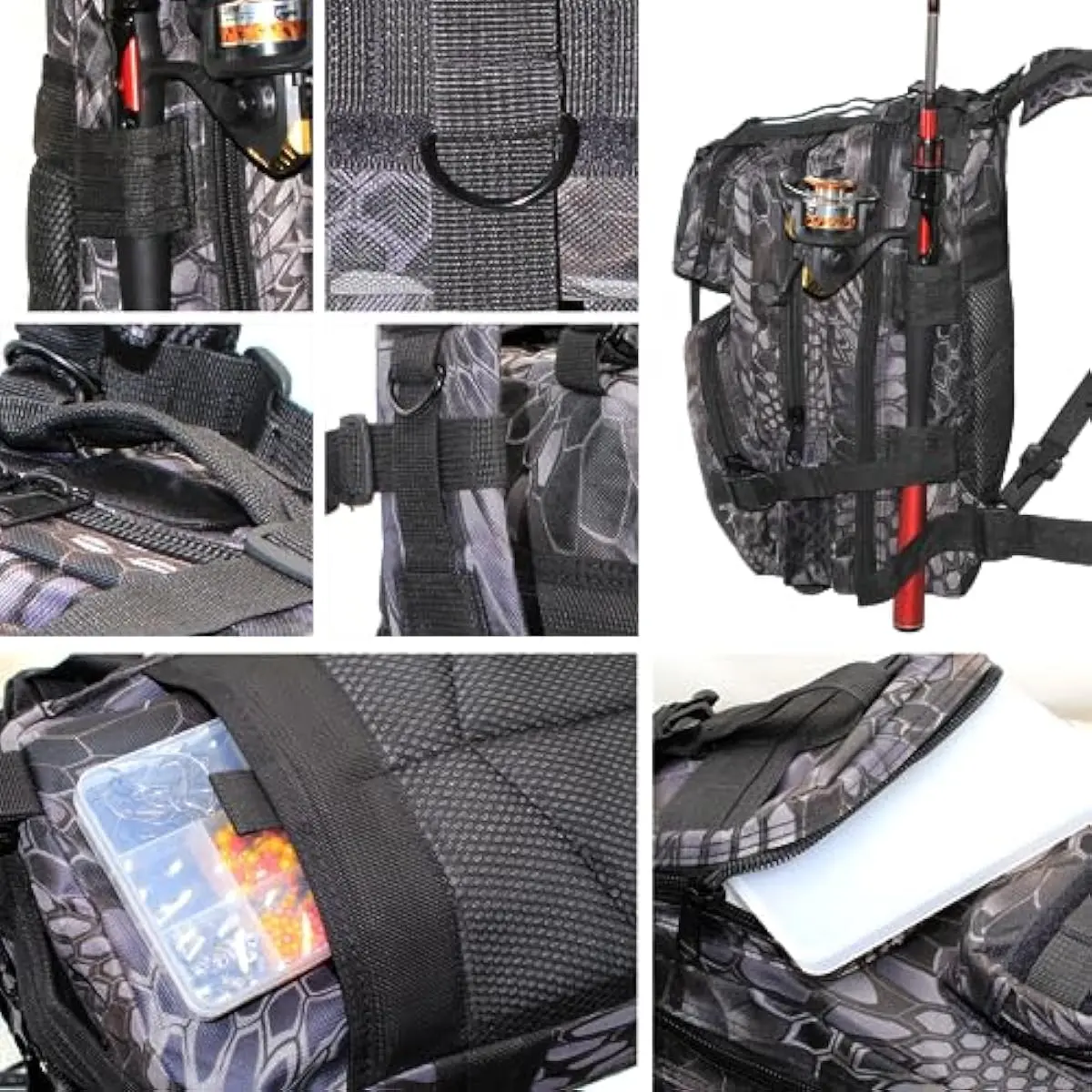 UNIQUE DESIGN: The fabric of the fishing tackle bag is made of Oxford cloth, which is sturdy and durable; the color of the backpack is in python pattern color scheme, which is perfect for going out fishing and other outdoor activities. The waist belt of the tackle bag is removable and adjustable; the shoulder straps have an adjustment system to adjust the backpack to best fit your body; the side storage system can hold fishing rods and other tools.