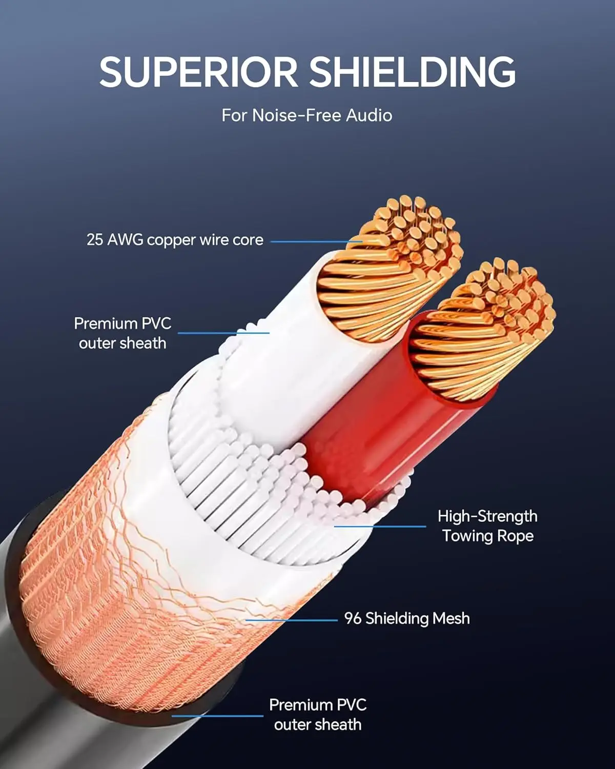 ·Clear & Consistent Audio Performance Built with oxygen-free copper conductors and balanced construction to support clean and stable audio transmission. The dual-layer shielding design helps reduce unwanted noise, allowing vocals and instruments to sound clear and natural during recording or live use.