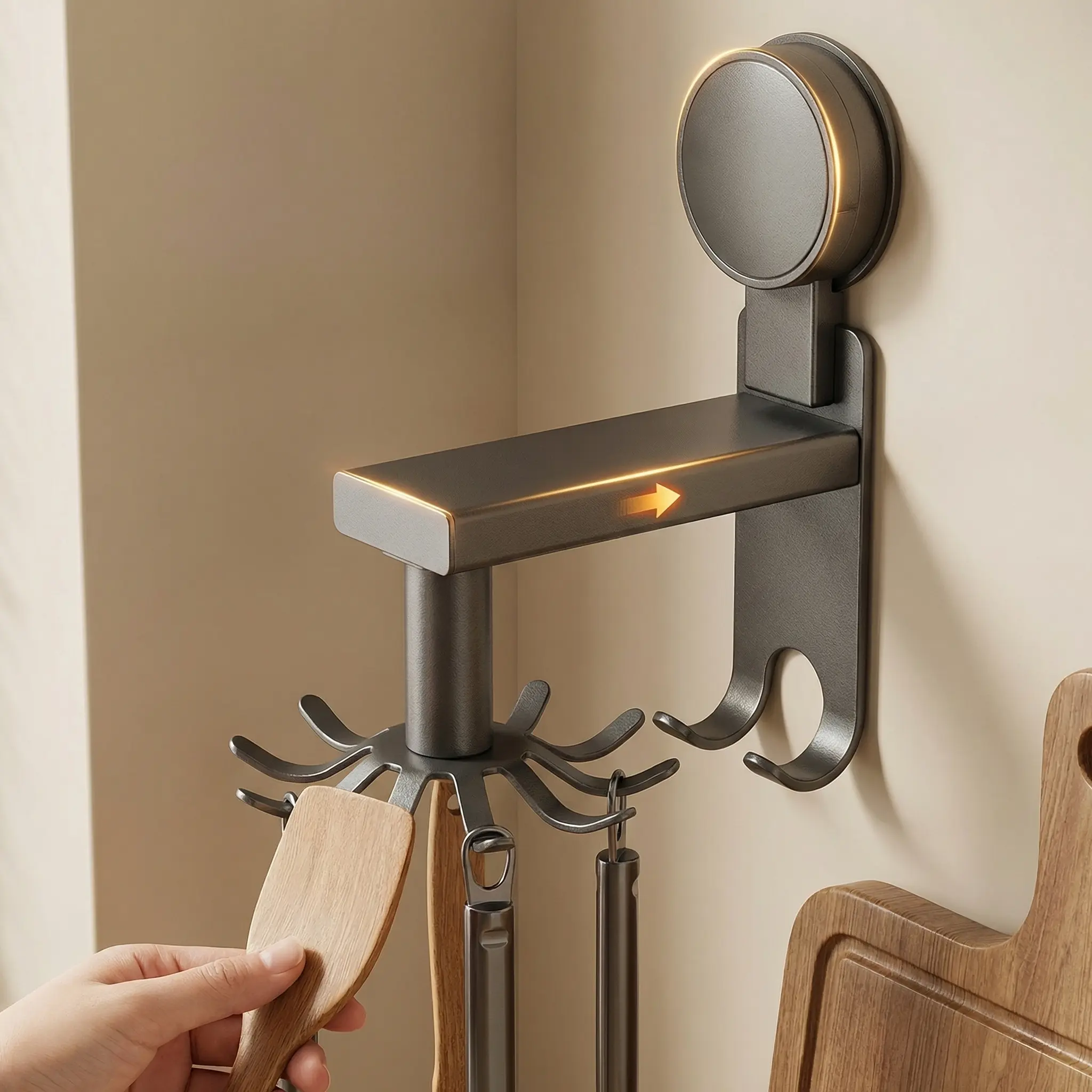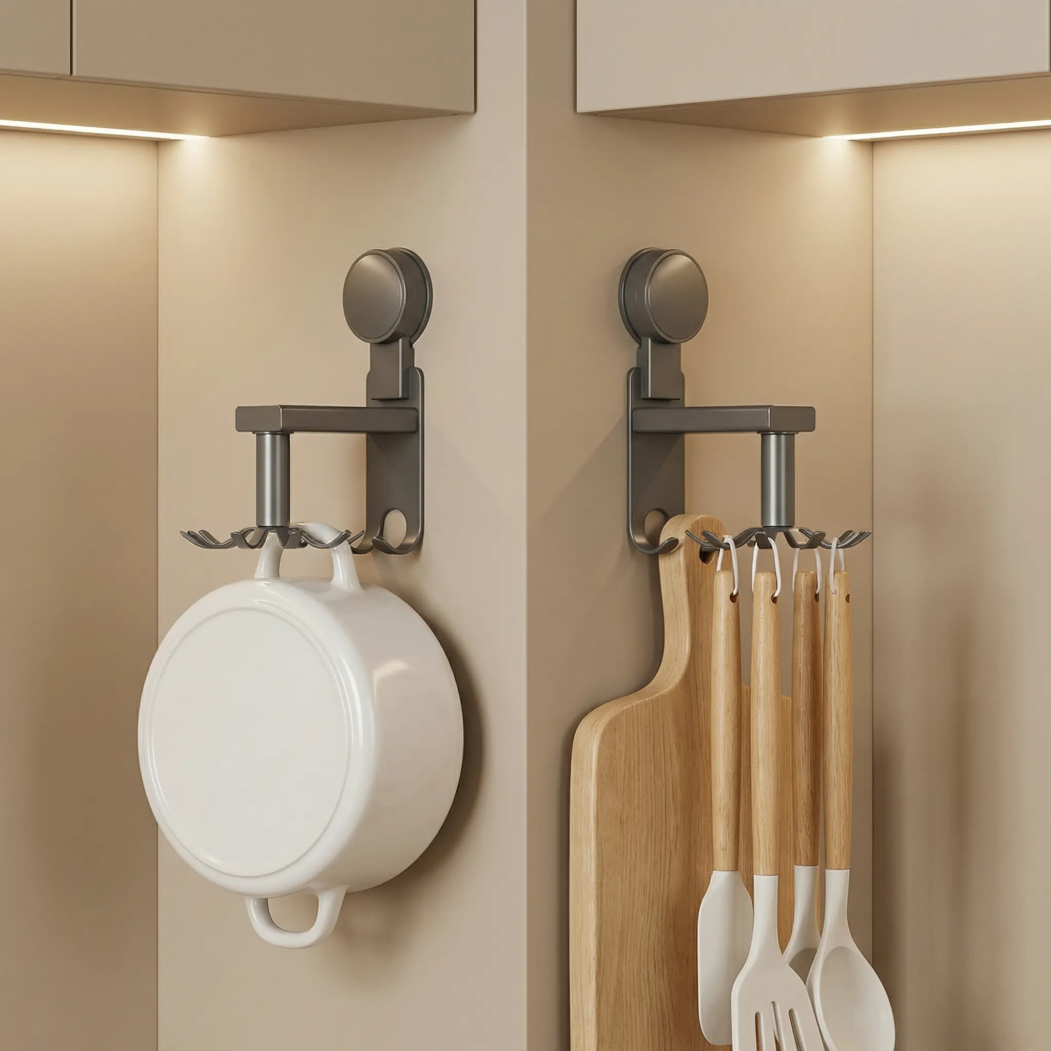 Sleek, Minimalist Design That Fits Any DecorThe modern matte gray finish blends seamlessly with every style, from minimalist bathrooms to contemporary kitchens. The multi-angle rotating hooks and side double hooks maximize vertical space, so you can organize towels, utensils, keys, bags, and more without cluttering your countertops.