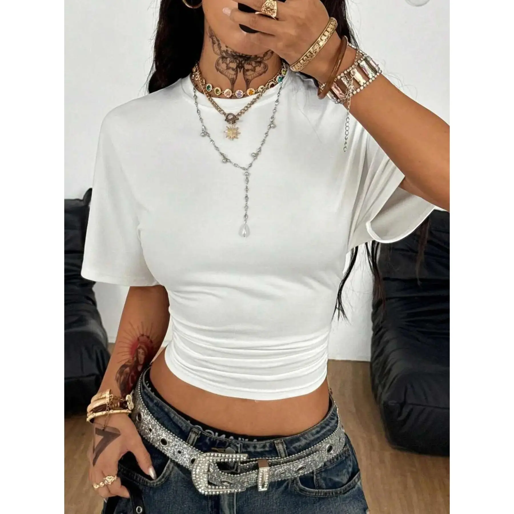 Women's Summer Casual Y2K Basic Loose Ruched Short T-Shirt, Elastic Street Style Tee for Daily Wear & Back to School