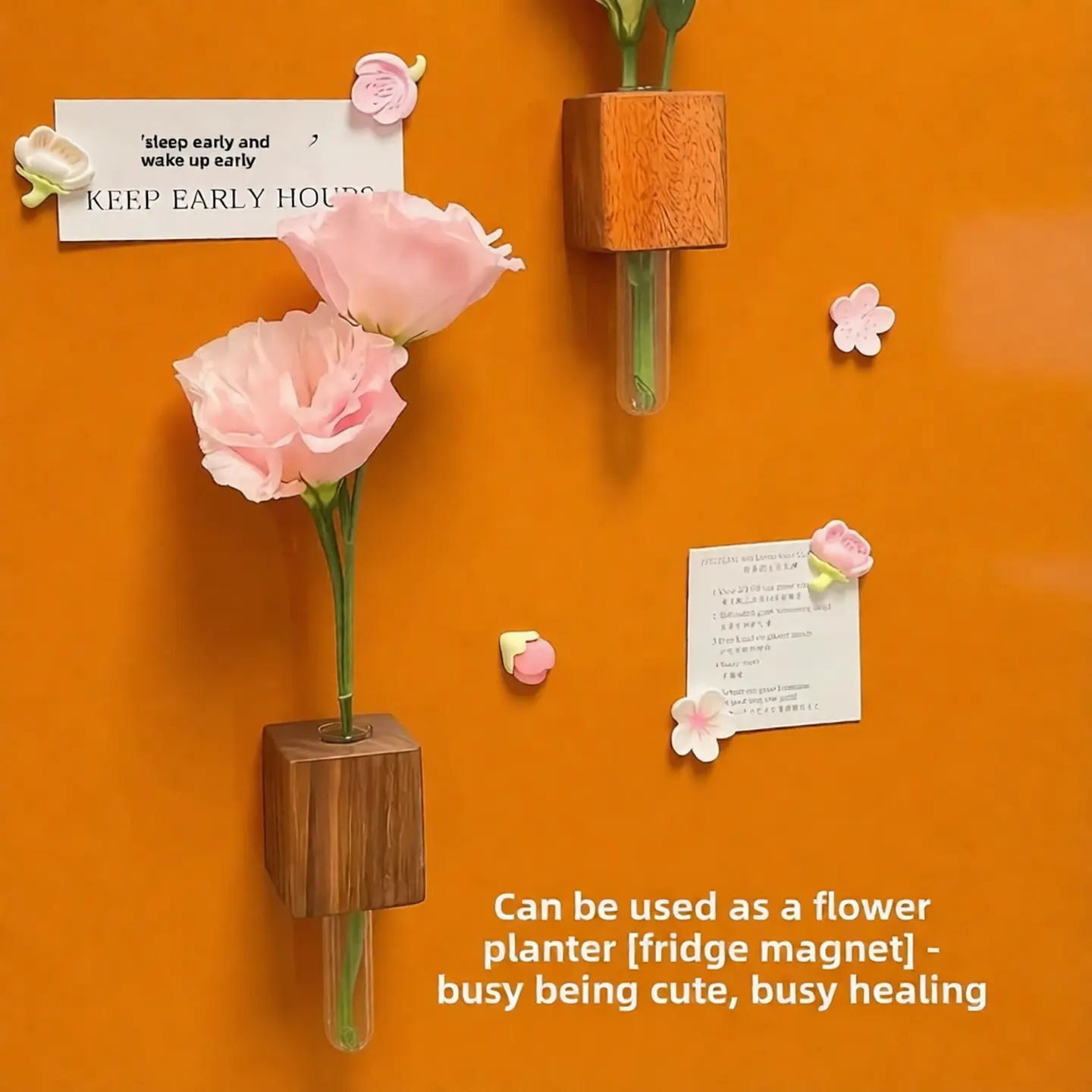 Compact, minimalist, and easy to maintain, this multi-functional decor piece is suitable for small spaces, dorm rooms, or as a thoughtful gift for plant lovers and home decor enthusiasts. It combines the beauty of natural wood, the simplicity of test tube flower arrangements, and the convenience of a magnetic (message board), making it a unique addition to your home that balances aesthetics and utility. Refresh your space effortlessly with this creative wooden test tube fridge magnet vase!