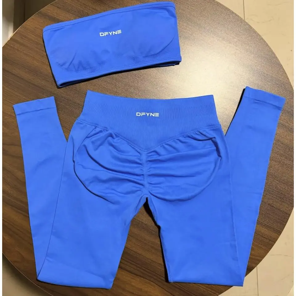 TheDFYNE High Waist Tummy Control Yoga Setis a sleek, supportive 2-piece outfit designed for women who want a smooth, sculpted silhouette during gym training and yoga.The seamless strapless bandeau sports bra delivers clean lines and light-to-medium support, while the high-waist bottoms provide strong tummy control and a flattering fit.Featuring the signature DFYNE logo, this set combines style, comfort, and performance in one breathable, seamless package.