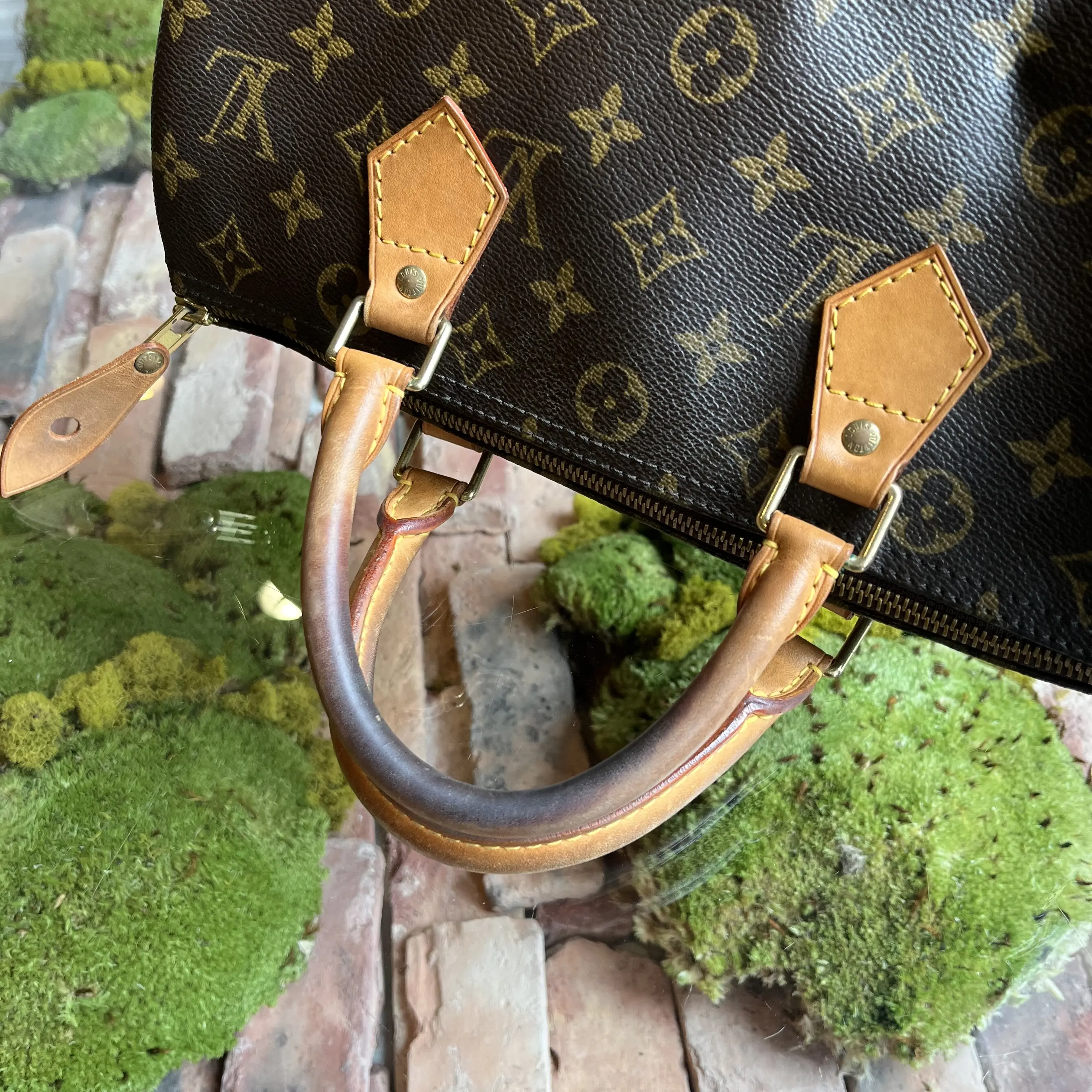 The Louis Vuitton Speedy 30 is crafted from classic monogram canvas with leather trim, offering timeless elegance. Its roomy interior and structured design make it a chic everyday companion. B- Good Overall Condition